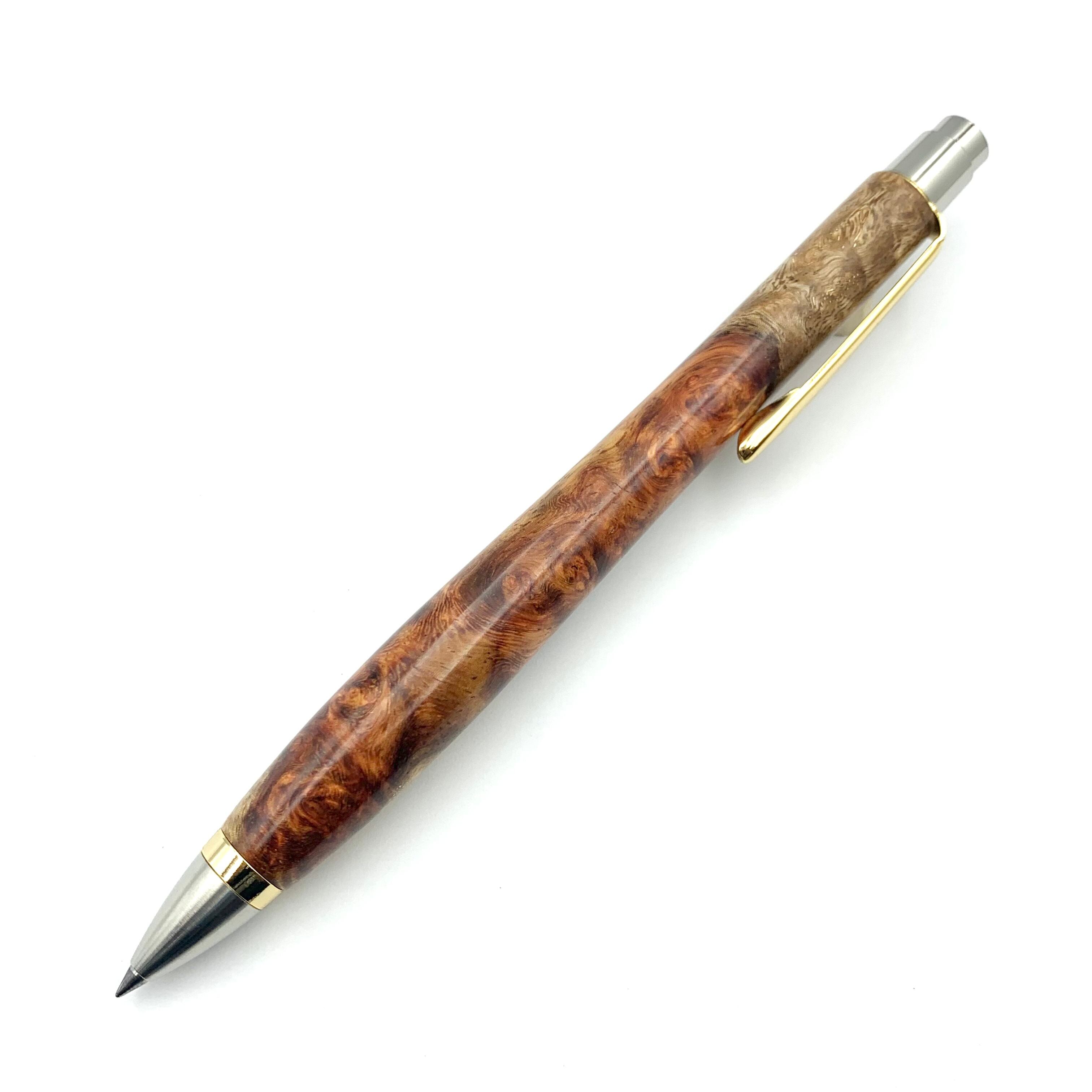ボールペンのノックシステムは、ドイツ最高のクリックメカニズムを採用してあります。このメカニズムはユニークな機構のため、クリックしたときのカチカチ音が静かで、どんな場所でも気兼ねなく使うことができます。滑らかに動くこのプッシュ感覚を一度味わうと他には戻れなくなってしまうほどの魅力があります。 100分の1単位の加工精度で削り出されたペン先は、軸ブレも全くありません。