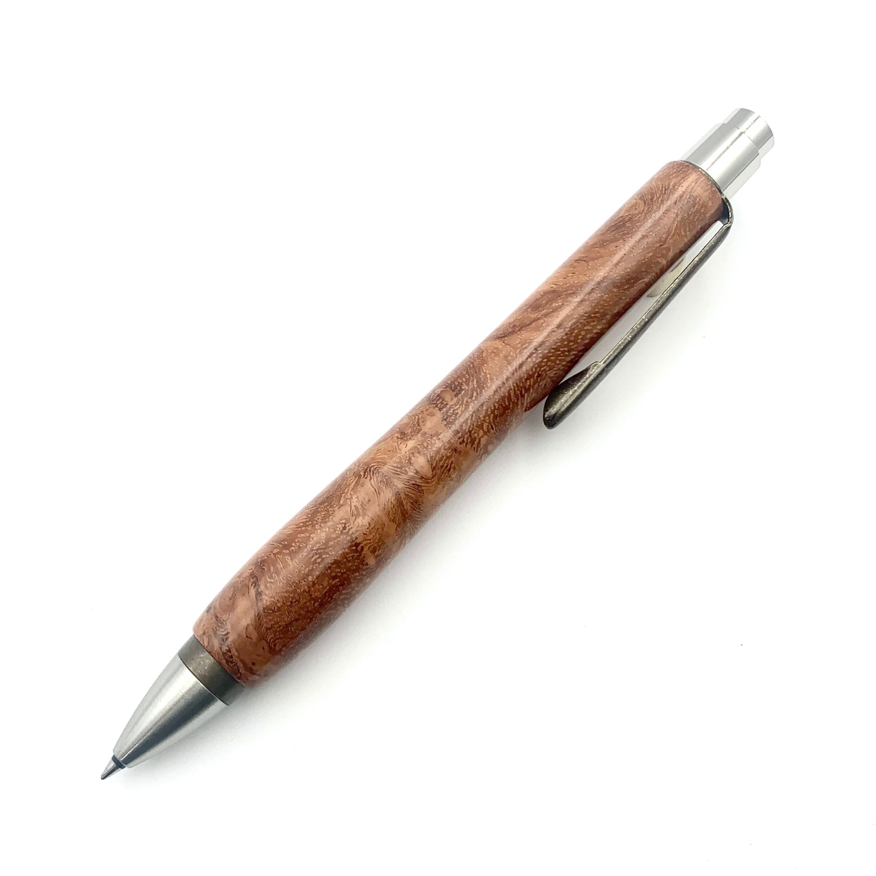 ボールペンのノックシステムは、ドイツ最高のクリックメカニズムを採用してあります。このメカニズムはユニークな機構のため、クリックしたときのカチカチ音が静かで、どんな場所でも気兼ねなく使うことができます。滑らかに動くこのプッシュ感覚を一度味わうと他には戻れなくなってしまうほどの魅力があります。 100分の1単位の加工精度で削り出されたペン先は、軸ブレも全くありません。