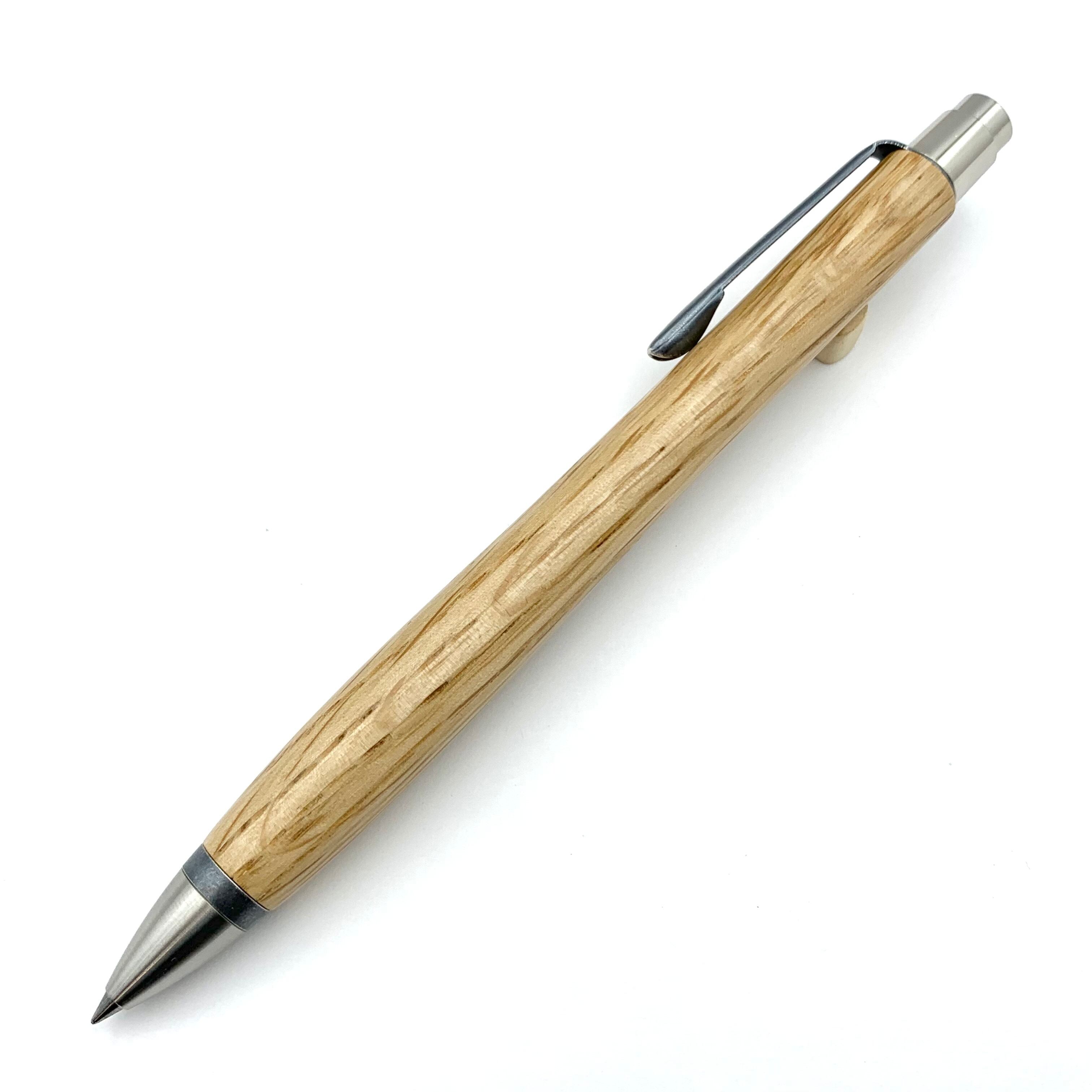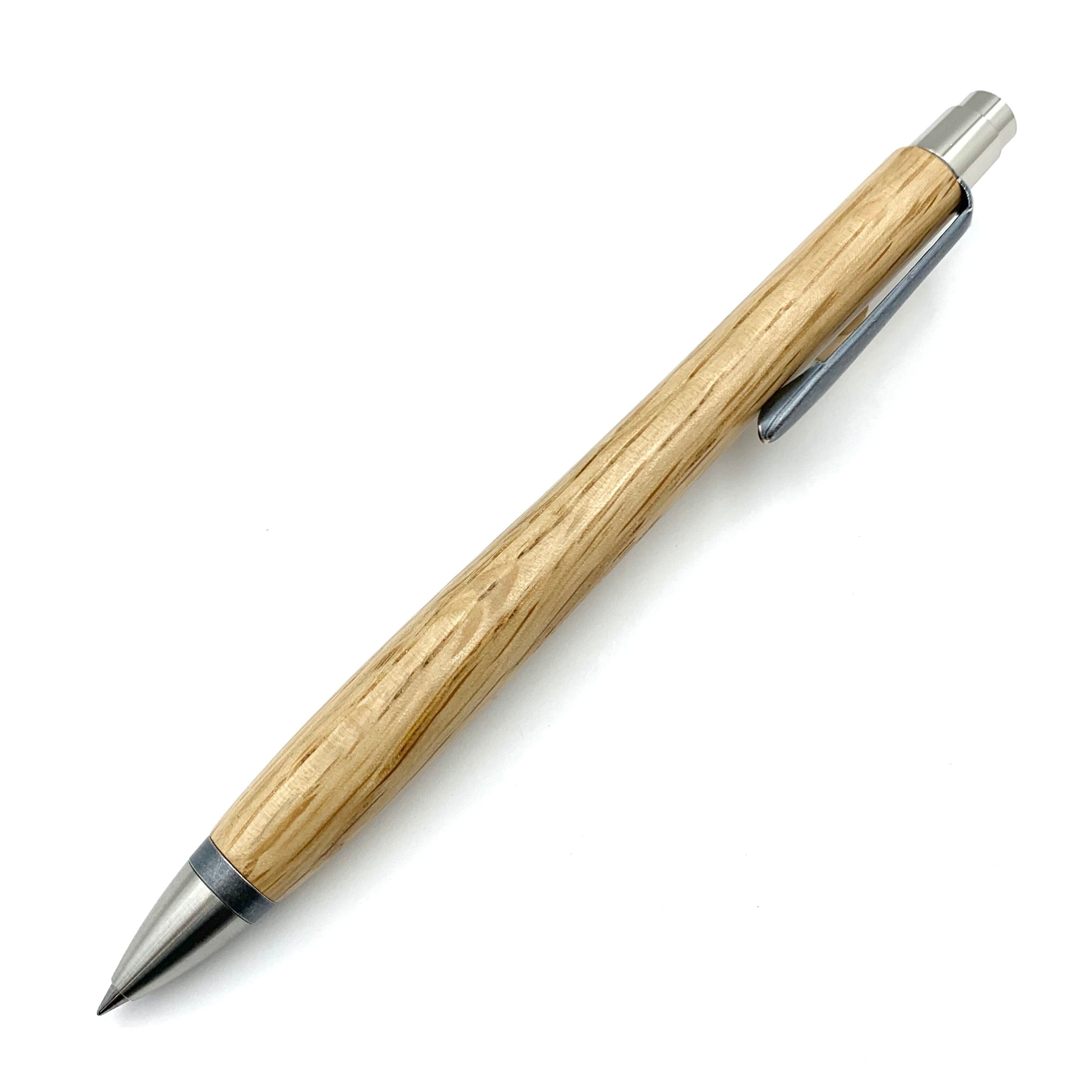 ボールペンのノックシステムは、ドイツ最高のクリックメカニズムを採用してあります。このメカニズムはユニークな機構のため、クリックしたときのカチカチ音が静かで、どんな場所でも気兼ねなく使うことができます。滑らかに動くこのプッシュ感覚を一度味わうと他には戻れなくなってしまうほどの魅力があります。 100分の1単位の加工精度で削り出されたペン先は、軸ブレも全くありません。