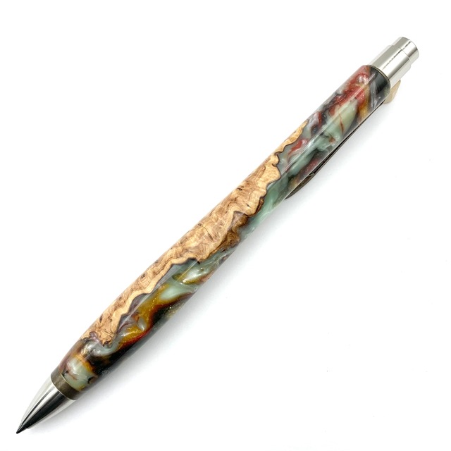 ボールペンのノックシステムは、ドイツ最高のクリックメカニズムを採用してあります。このメカニズムはユニークな機構のため、クリックしたときのカチカチ音が静かで、どんな場所でも気兼ねなく使うことができます。滑らかに動くこのプッシュ感覚を一度味わうと他には戻れなくなってしまうほどの魅力があります。 100分の1単位の加工精度で削り出されたペン先は、軸ブレも全くありません。