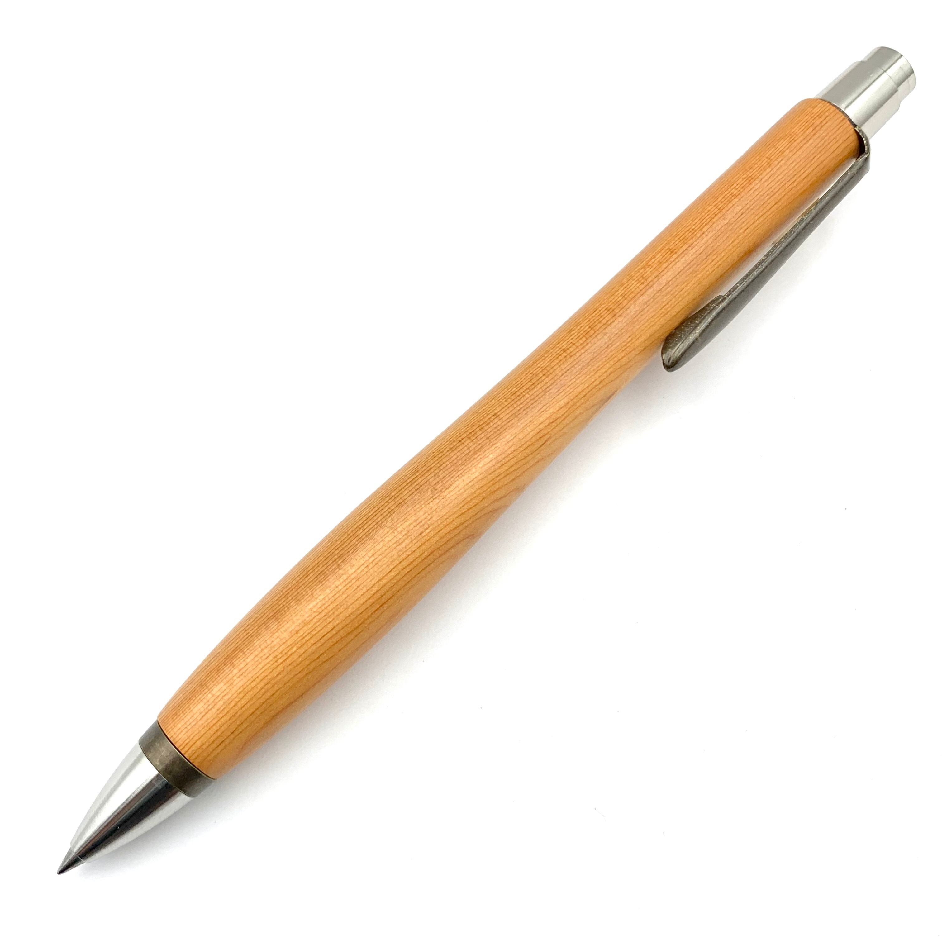 ボールペンのノックシステムは、ドイツ最高のクリックメカニズムを採用してあります。このメカニズムはユニークな機構のため、クリックしたときのカチカチ音が静かで、どんな場所でも気兼ねなく使うことができます。滑らかに動くこのプッシュ感覚を一度味わうと他には戻れなくなってしまうほどの魅力があります。 100分の1単位の加工精度で削り出されたペン先は、軸ブレも全くありません。