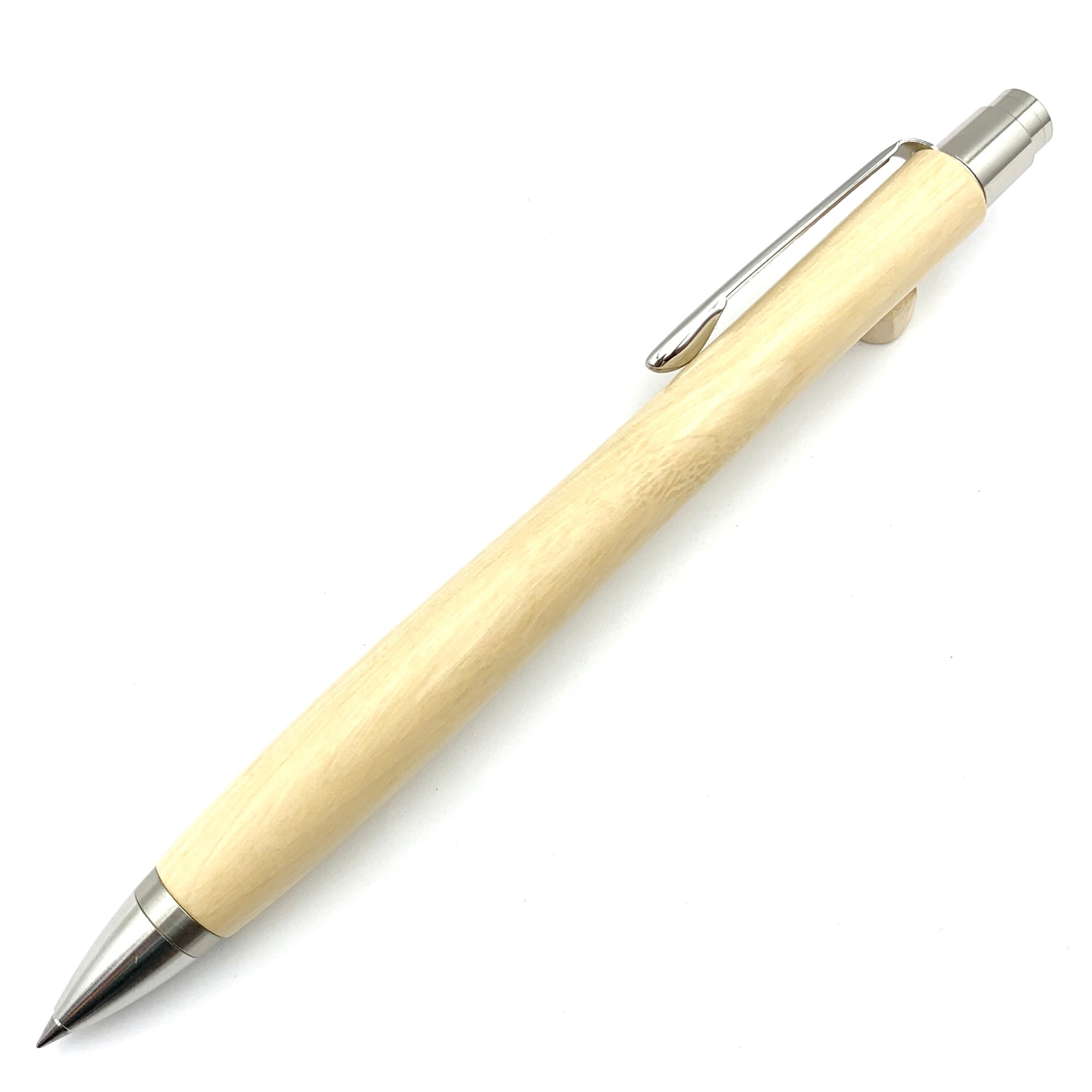 ボールペンのノックシステムは、ドイツ最高のクリックメカニズムを採用してあります。このメカニズムはユニークな機構のため、クリックしたときのカチカチ音が静かで、どんな場所でも気兼ねなく使うことができます。滑らかに動くこのプッシュ感覚を一度味わうと他には戻れなくなってしまうほどの魅力があります。 100分の1単位の加工精度で削り出されたペン先は、軸ブレも全くありません。
