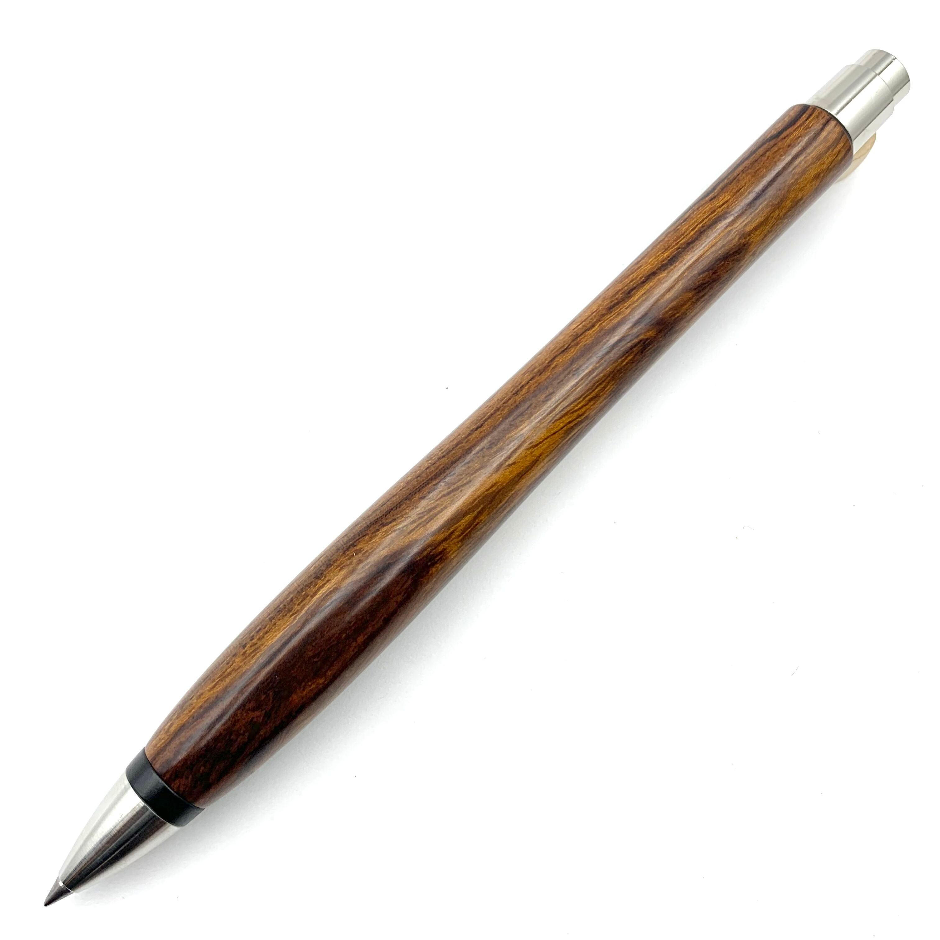 ボールペンのノックシステムは、ドイツ最高のクリックメカニズムを採用してあります。このメカニズムはユニークな機構のため、クリックしたときのカチカチ音が静かで、どんな場所でも気兼ねなく使うことができます。滑らかに動くこのプッシュ感覚を一度味わうと他には戻れなくなってしまうほどの魅力があります。 100分の1単位の加工精度で削り出されたペン先は、軸ブレも全くありません。
