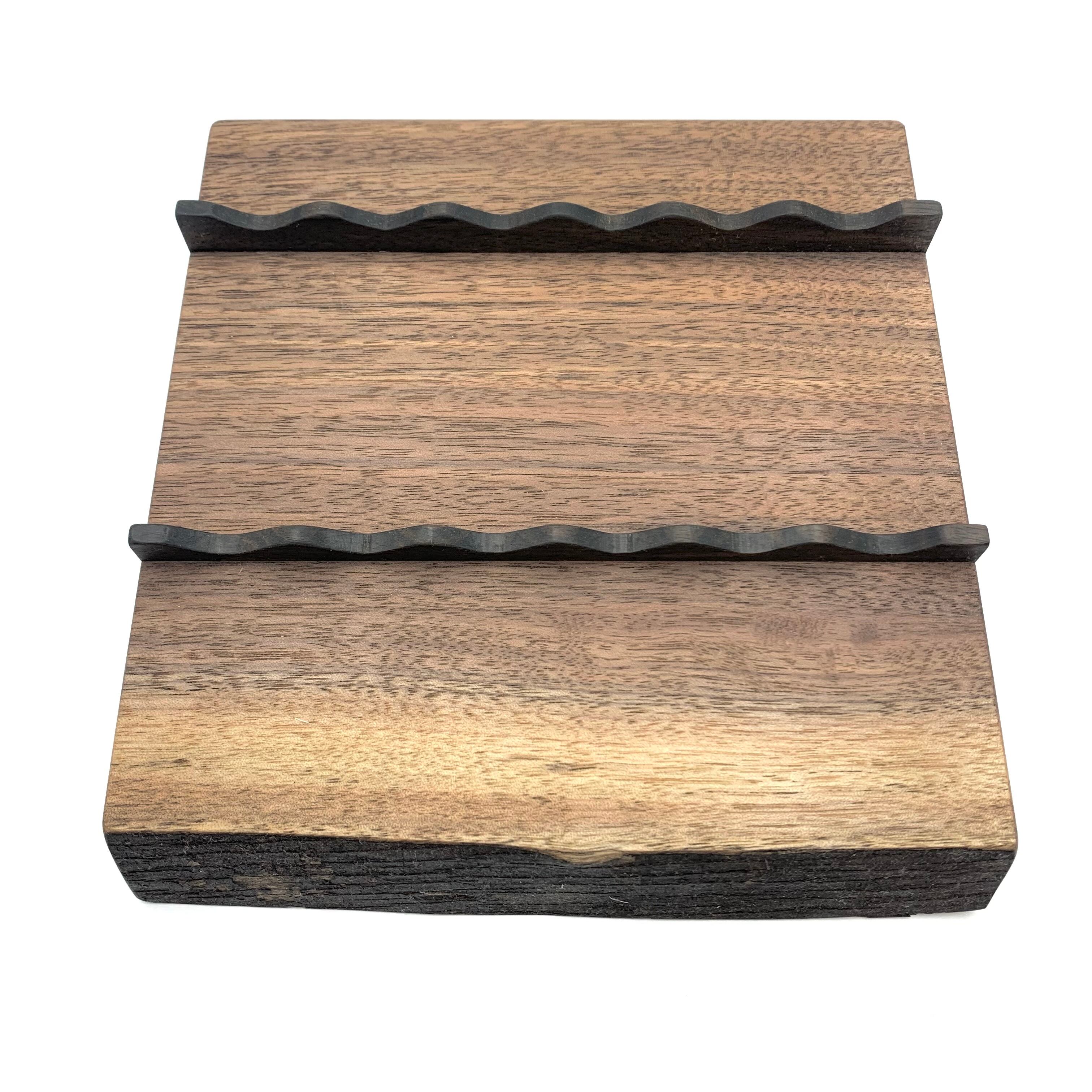 耳付き一枚板を天然オイルで仕上げてあり、ペンの長さや太さが違っても置けるように作られています。
