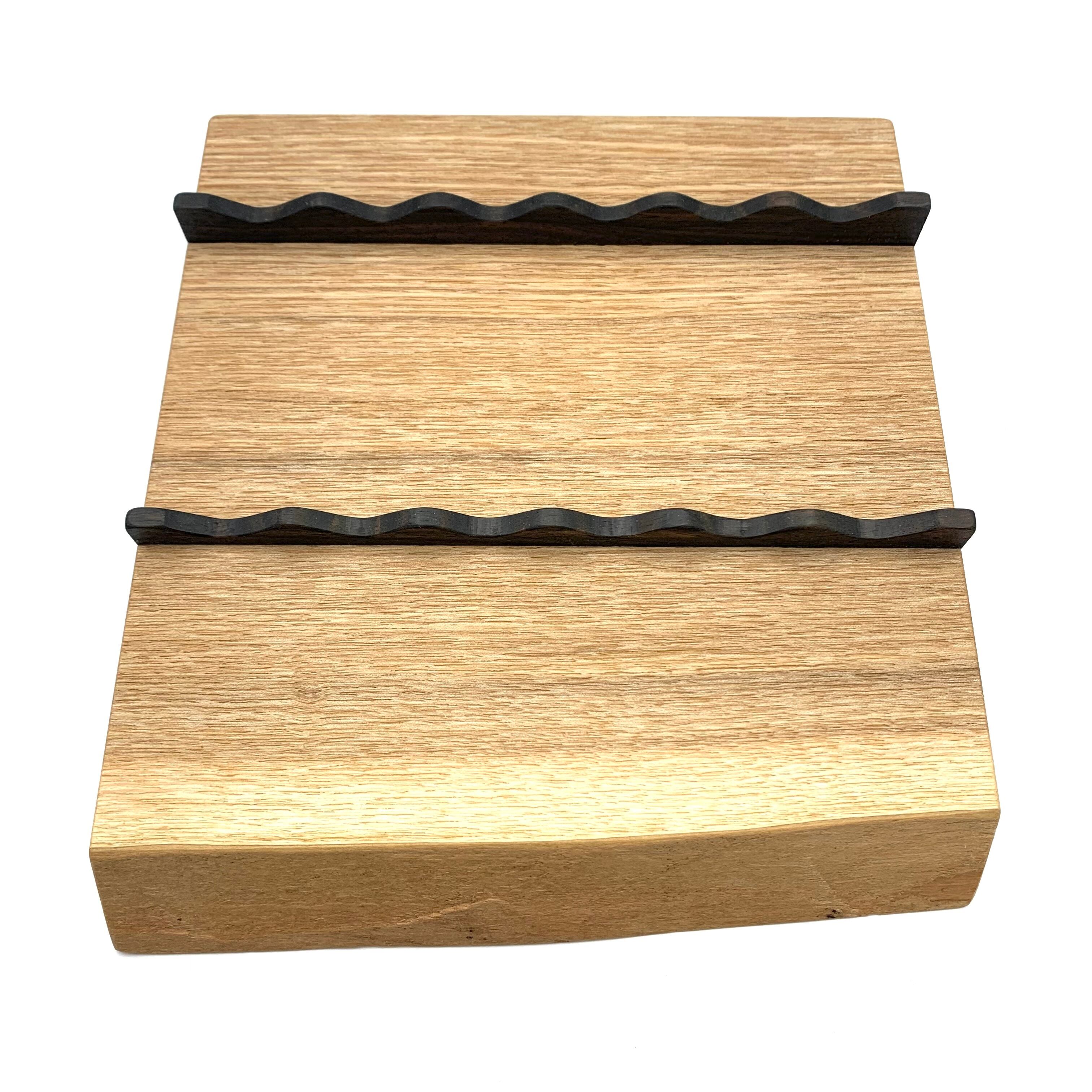 デスクの上でペンを6本飾ることができる、木の温かみや表情をそのまま活かしたペントレイです。ペンを優しく支えれるように黒い曲線部分は黒檀を加工しています。