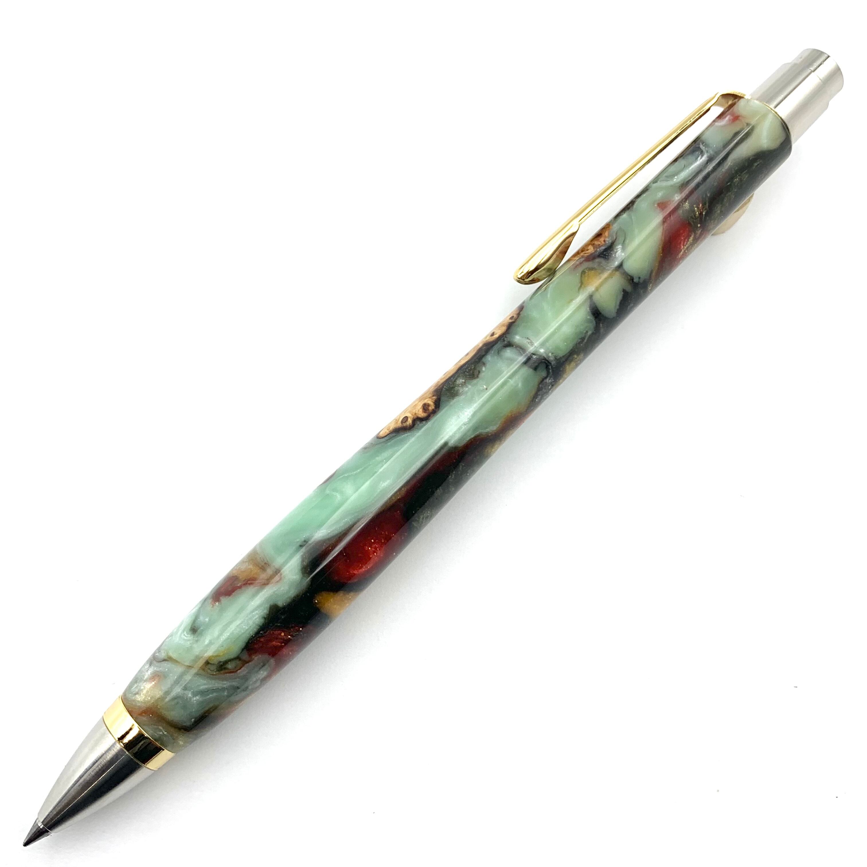 ボールペンのノックシステムは、ドイツ最高のクリックメカニズムを採用してあります。このメカニズムはユニークな機構のため、クリックしたときのカチカチ音が静かで、どんな場所でも気兼ねなく使うことができます。滑らかに動くこのプッシュ感覚を一度味わうと他には戻れなくなってしまうほどの魅力があります。 100分の1単位の加工精度で削り出されたペン先は、軸ブレも全くありません。