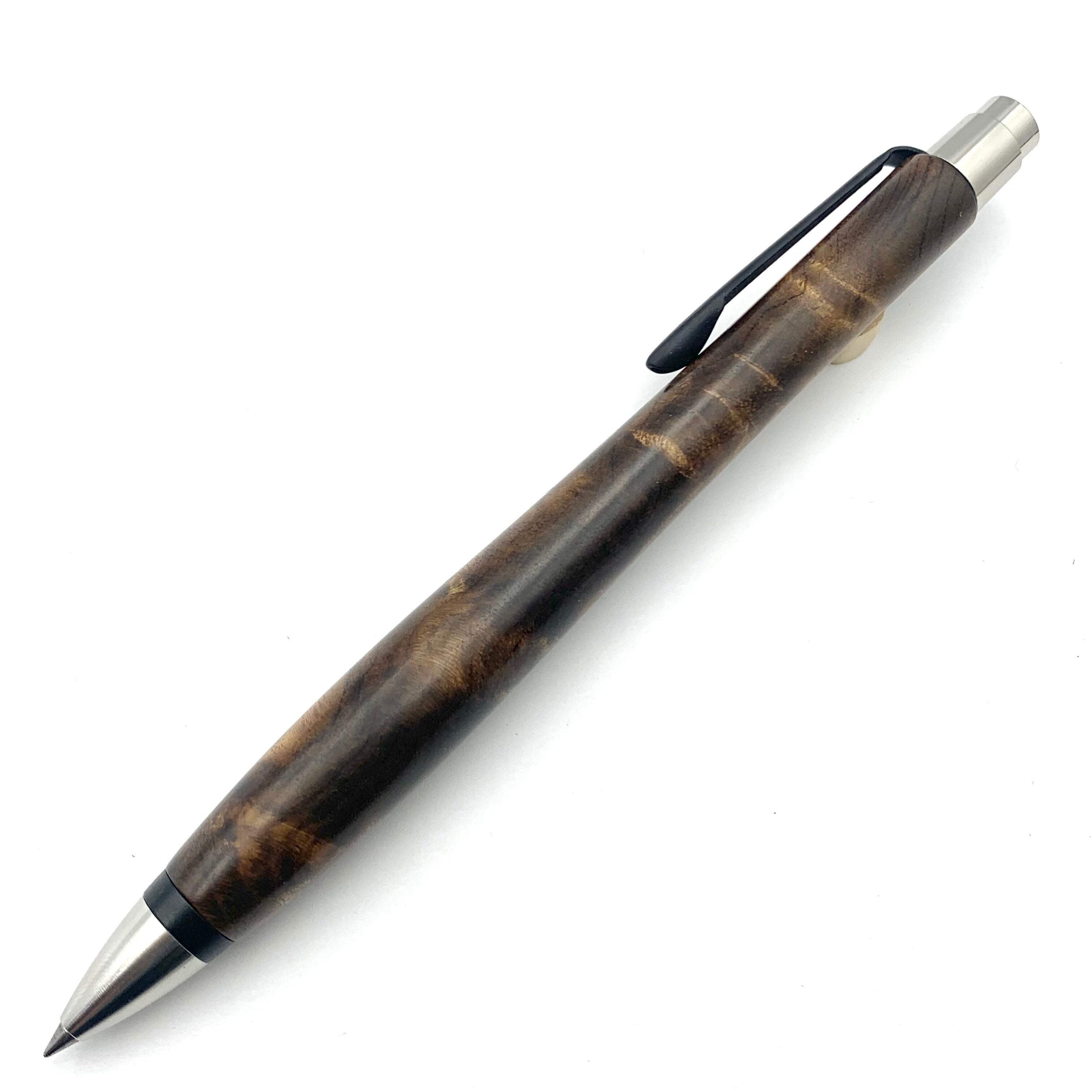 ボールペンのノックシステムは、ドイツ最高のクリックメカニズムを採用してあります。このメカニズムはユニークな機構のため、クリックしたときのカチカチ音が静かで、どんな場所でも気兼ねなく使うことができます。滑らかに動くこのプッシュ感覚を一度味わうと他には戻れなくなってしまうほどの魅力があります。 100分の1単位の加工精度で削り出されたペン先は、軸ブレも全くありません。