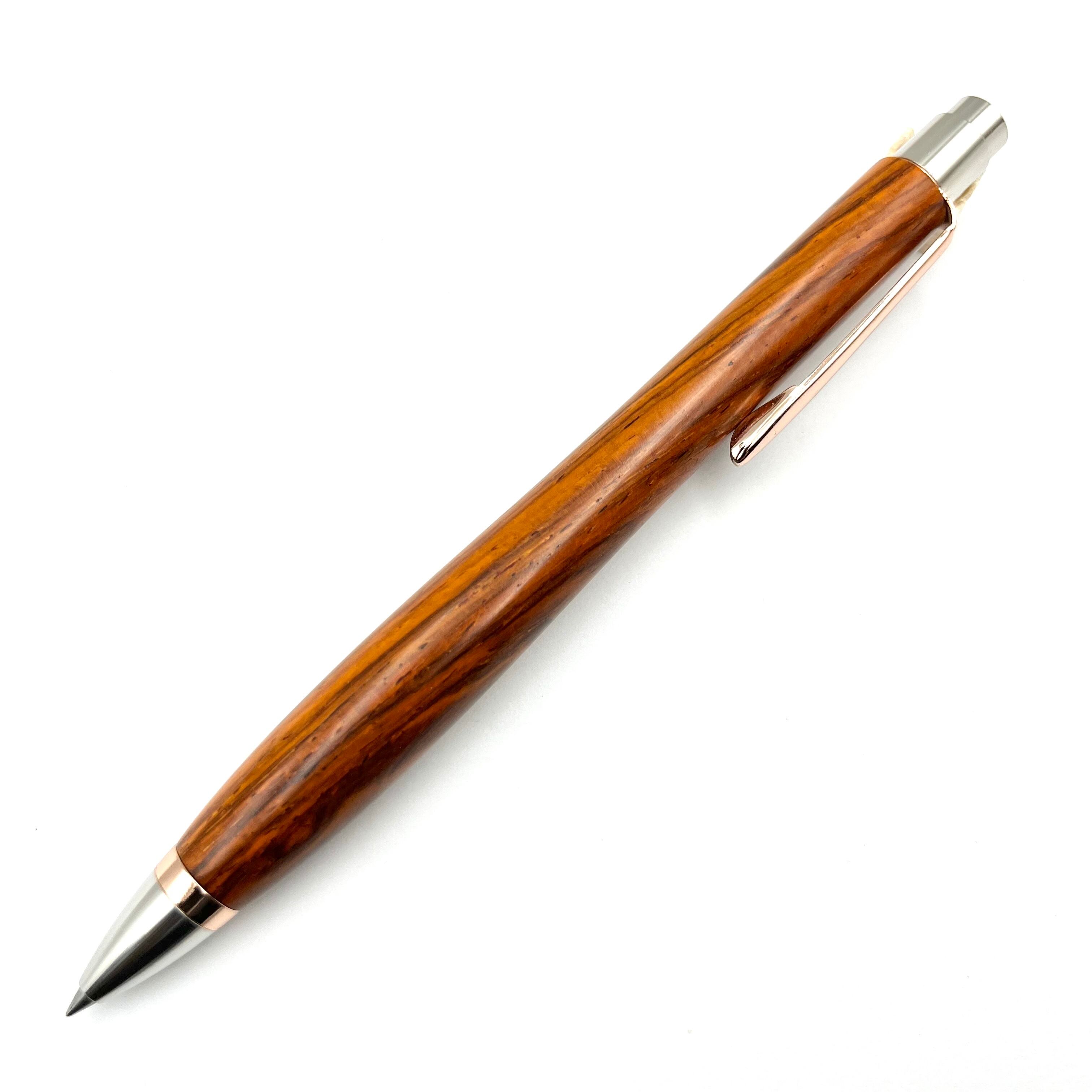 ボールペンのノックシステムは、ドイツ最高のクリックメカニズムを採用してあります。このメカニズムはユニークな機構のため、クリックしたときのカチカチ音が静かで、どんな場所でも気兼ねなく使うことができます。滑らかに動くこのプッシュ感覚を一度味わうと他には戻れなくなってしまうほどの魅力があります。 100分の1単位の加工精度で削り出されたペン先は、軸ブレも全くありません。