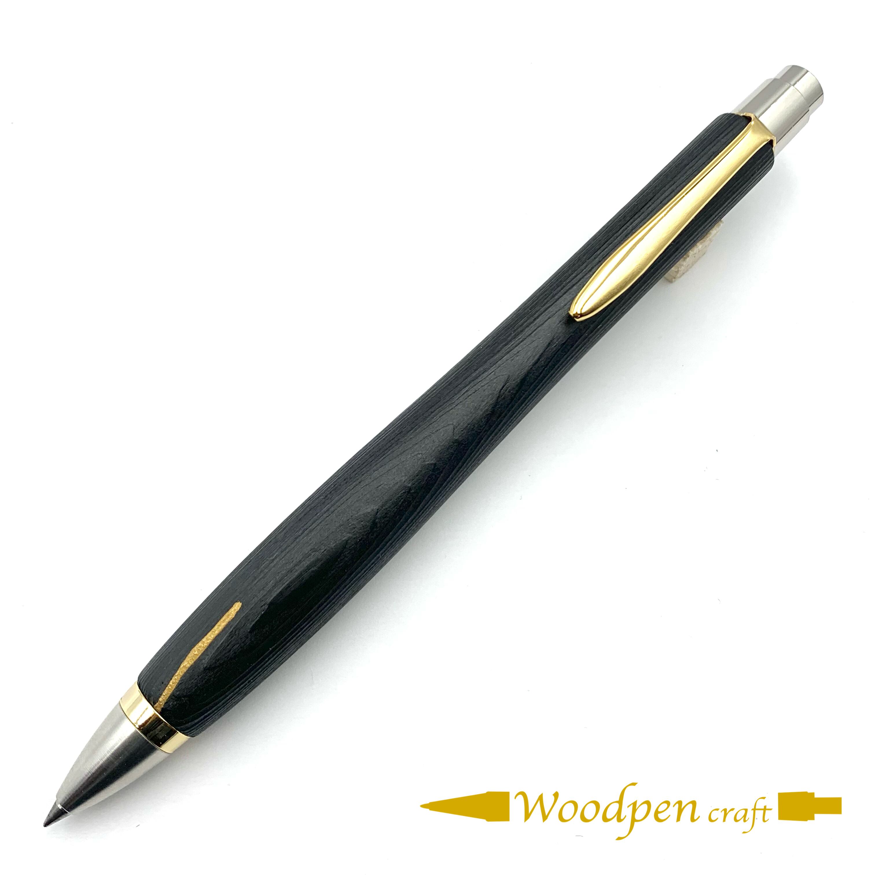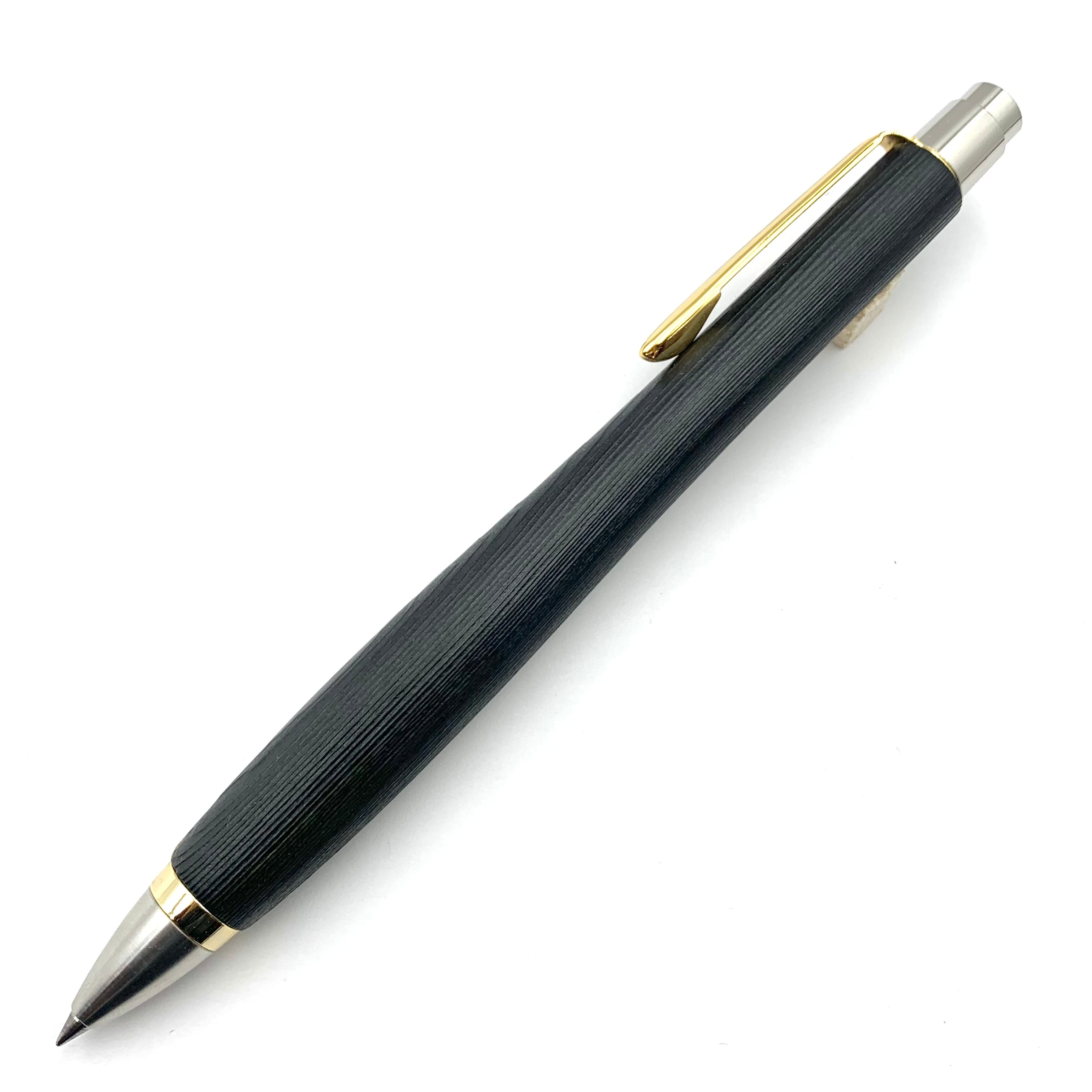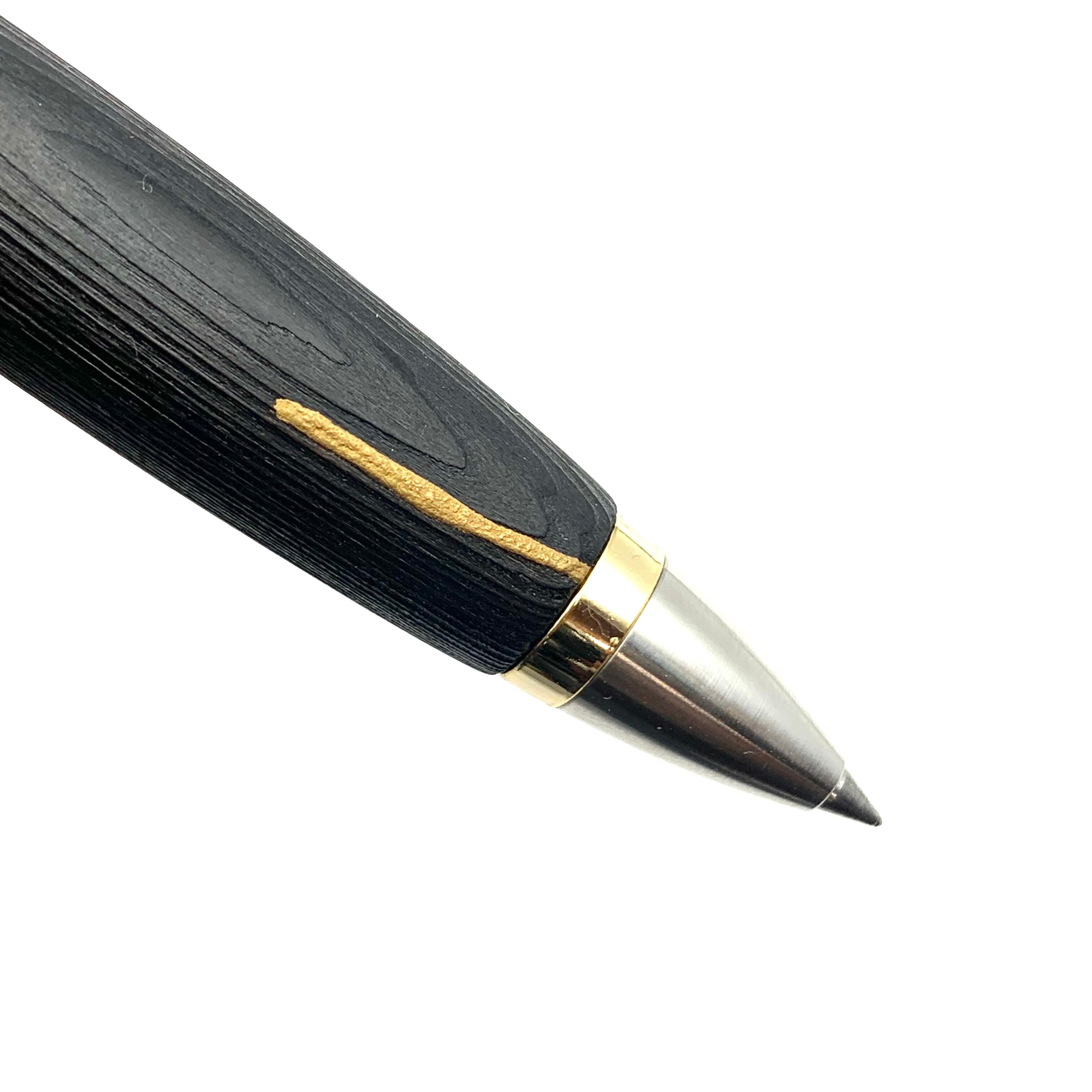 大阪の漆塗り職人さんの技術で、浮造りした屋久杉に大変希少な国産漆を、何度も塗り重ねて拭き取る(摺り漆)技法で仕上げた黒漆ペンです。自然に割れてしまった部分には金粉と漆で修復した金継ぎが施されています。