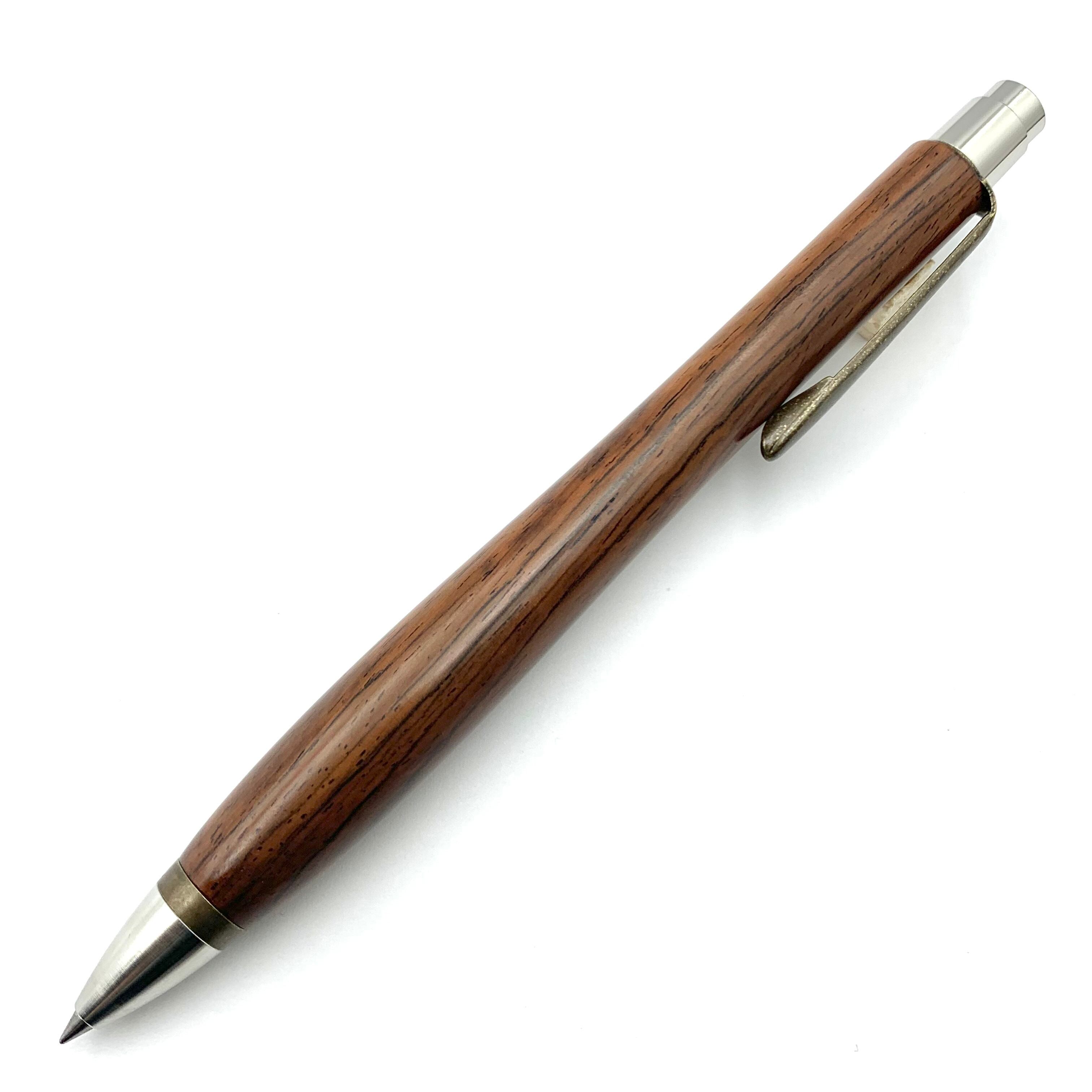 ボールペンのノックシステムは、ドイツ最高のクリックメカニズムを採用してあります。このメカニズムはユニークな機構のため、クリックしたときのカチカチ音が静かで、どんな場所でも気兼ねなく使うことができます。滑らかに動くこのプッシュ感覚を一度味わうと他には戻れなくなってしまうほどの魅力があります。 100分の1単位の加工精度で削り出されたペン先は、軸ブレも全くありません。