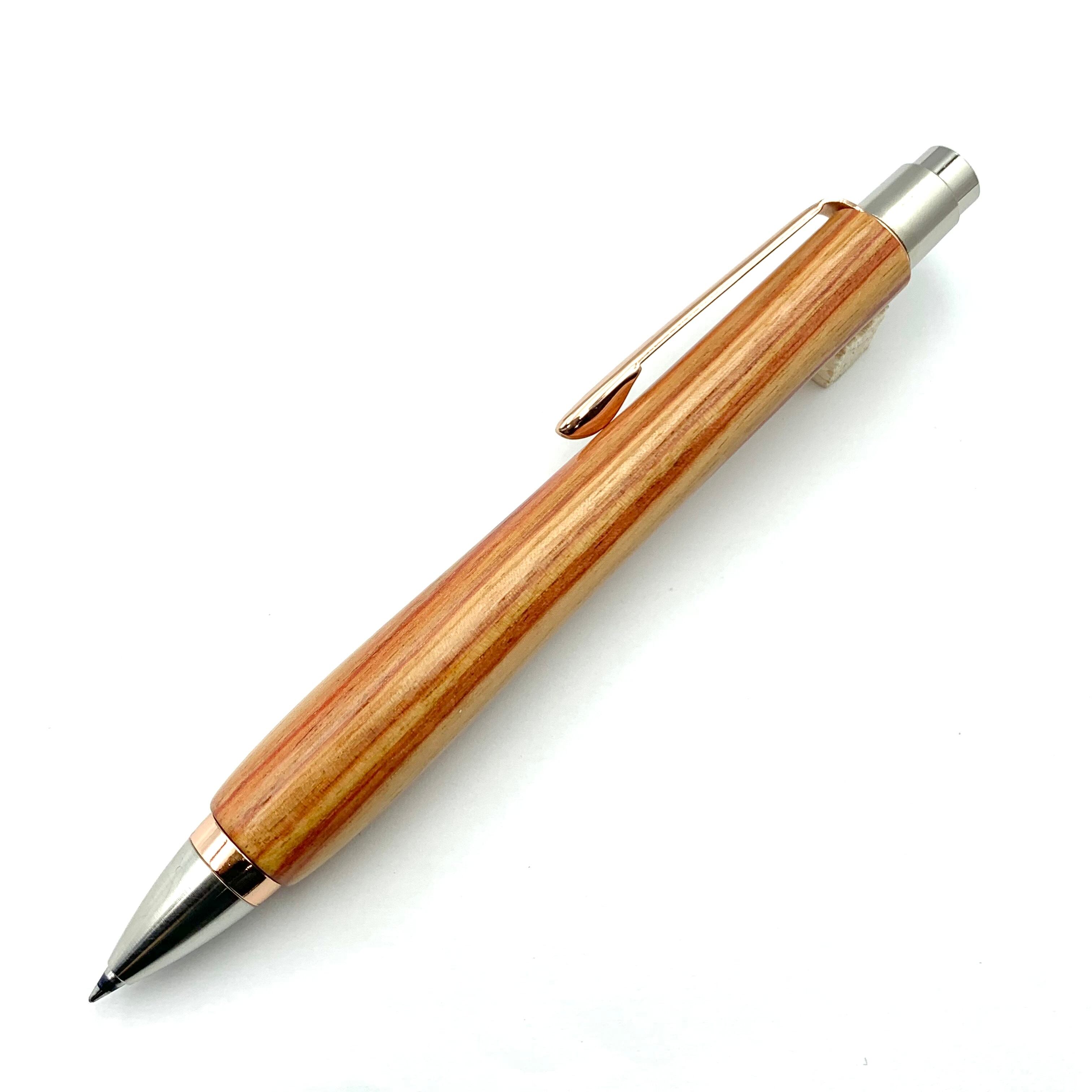 ボールペンのノックシステムは、ドイツ最高のクリックメカニズムを採用してあります。このメカニズムはユニークな機構のため、クリックしたときのカチカチ音が静かで、どんな場所でも気兼ねなく使うことができます。滑らかに動くこのプッシュ感覚を一度味わうと他には戻れなくなってしまうほどの魅力があります。 100分の1単位の加工精度で削り出されたペン先は、軸ブレも全くありません。