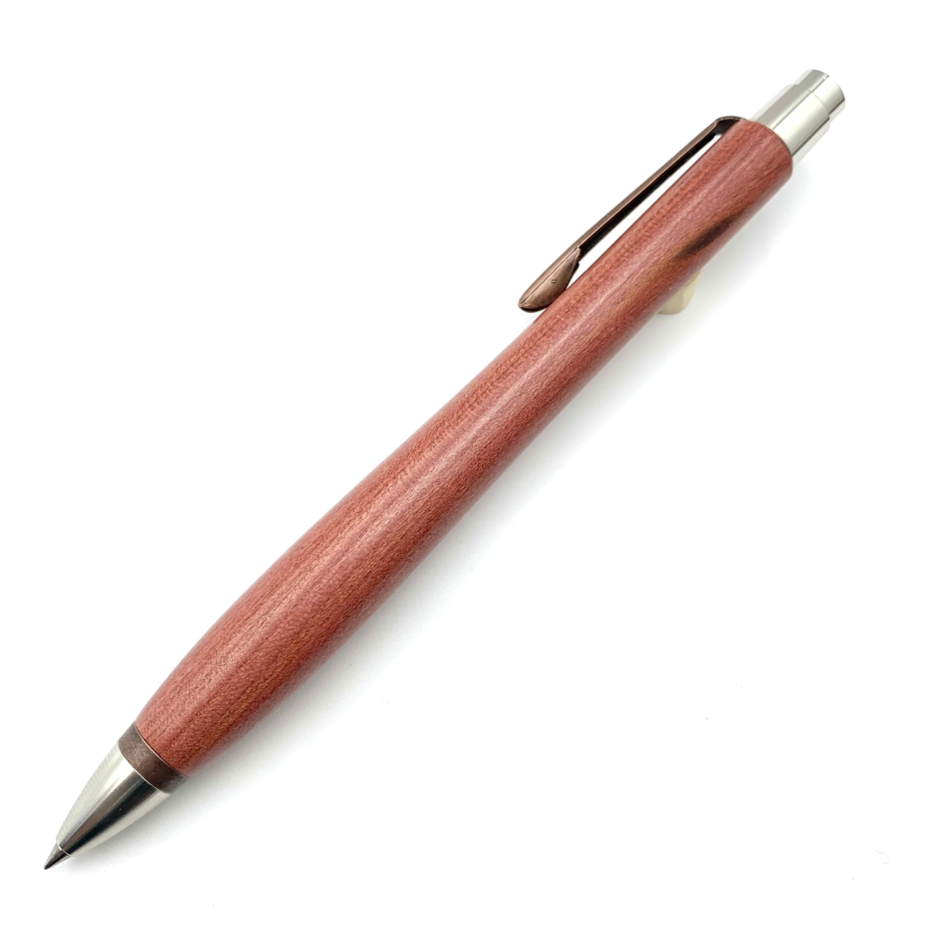 ボールペンのノックシステムは、ドイツ最高のクリックメカニズムを採用してあります。このメカニズムはユニークな機構のため、クリックしたときのカチカチ音が静かで、どんな場所でも気兼ねなく使うことができます。滑らかに動くこのプッシュ感覚を一度味わうと他には戻れなくなってしまうほどの魅力があります。 100分の1単位の加工精度で削り出されたペン先は、軸ブレも全くありません。