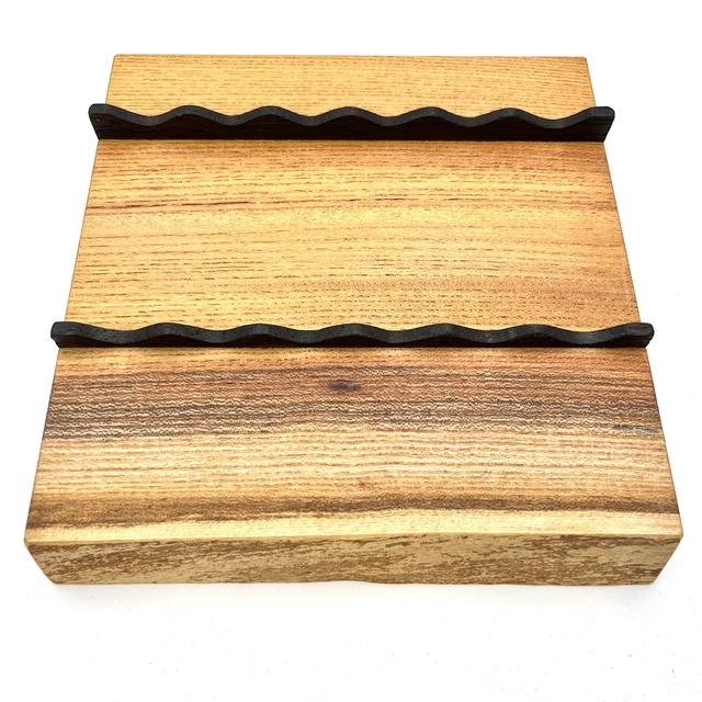 デスクの上でペンを6本飾ることができる、木の温かみや表情をそのまま活かしたペントレイです。ペンを優しく支えれるように黒い曲線部分は黒檀を加工しています。