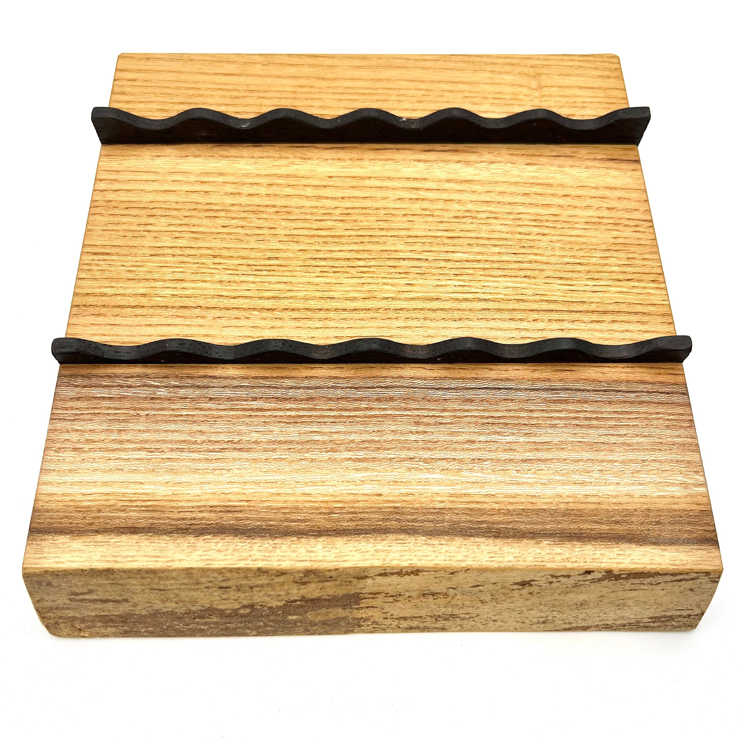 耳付き一枚板を天然オイルで仕上げてあり、ペンの長さや太さが違っても置けるように作られています。