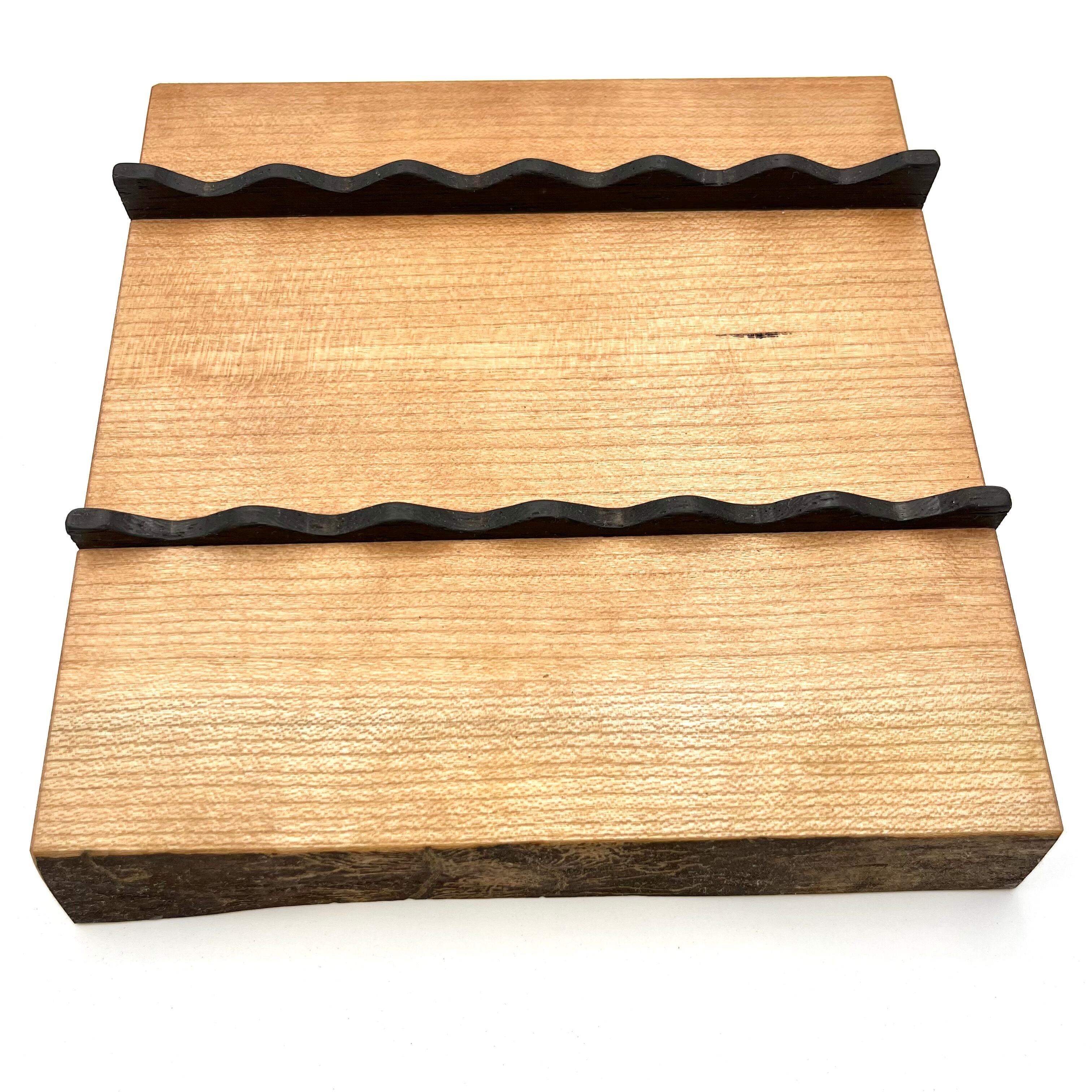 耳付き一枚板を天然オイルで仕上げてあり、ペンの長さや太さが違っても置けるように作られています。