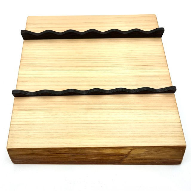 耳付き一枚板を天然オイルで仕上げてあり、ペンの長さや太さが違っても置けるように作られています。