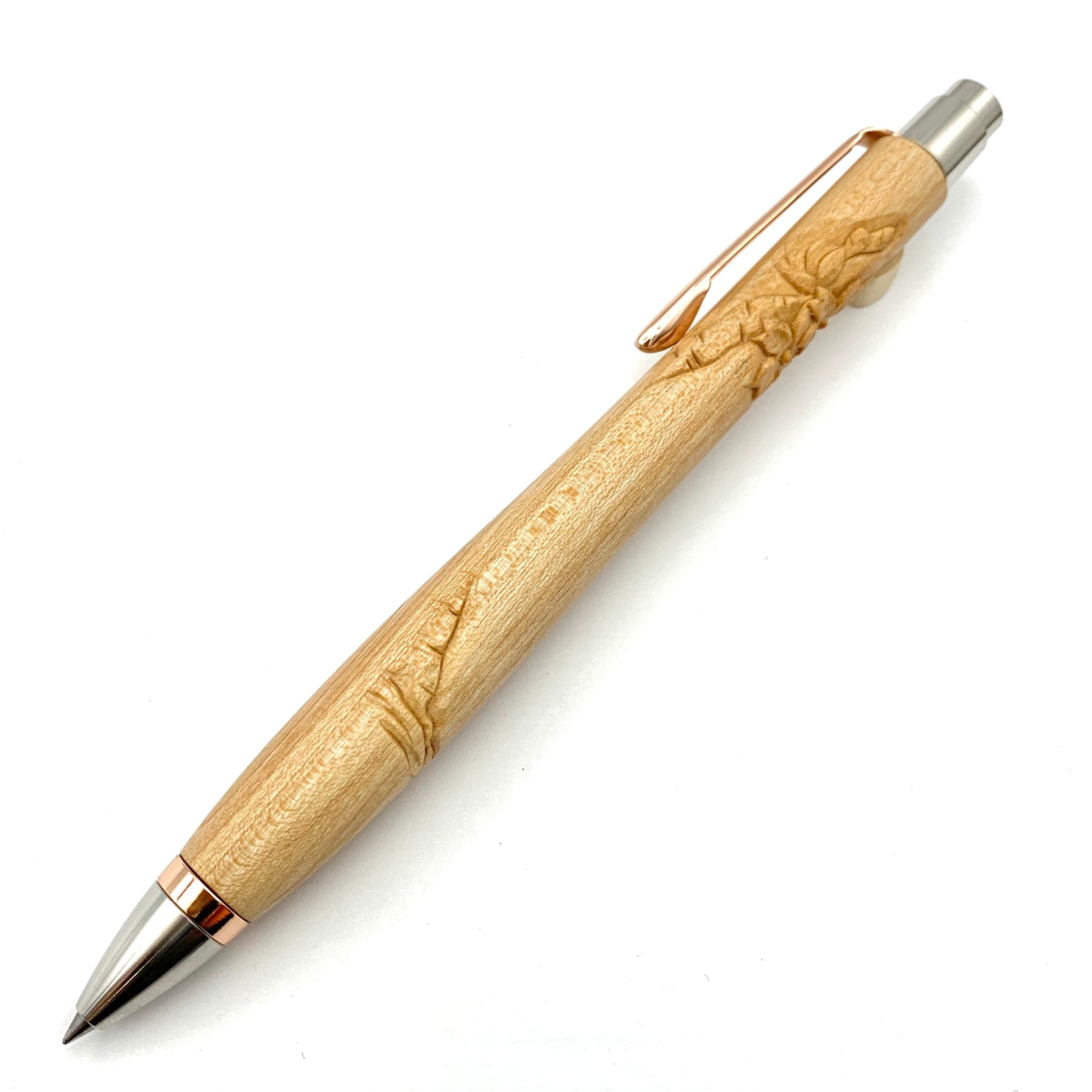 ボールペンのノックシステムは、ドイツ最高のクリックメカニズムを採用してあります。このメカニズムはユニークな機構のため、クリックしたときのカチカチ音が静かで、どんな場所でも気兼ねなく使うことができます。滑らかに動くこのプッシュ感覚を一度味わうと他には戻れなくなってしまうほどの魅力があります。 100分の1単位の加工精度で削り出されたペン先は、軸ブレも全くありません。
