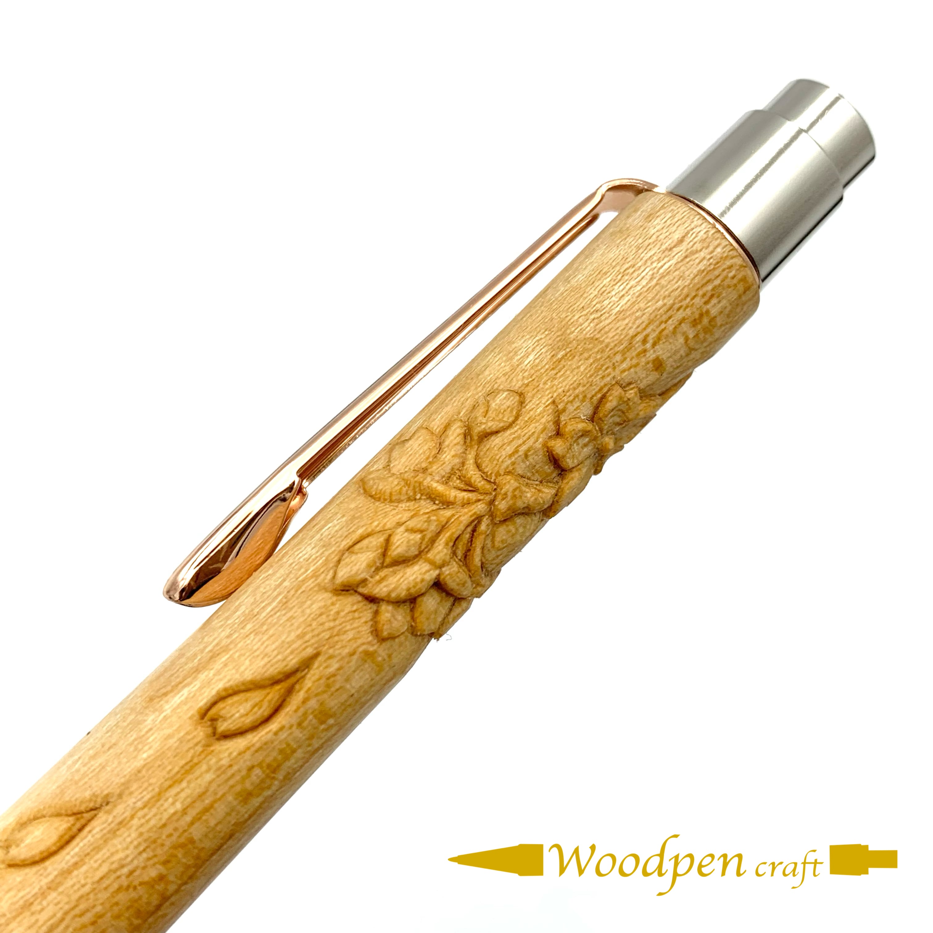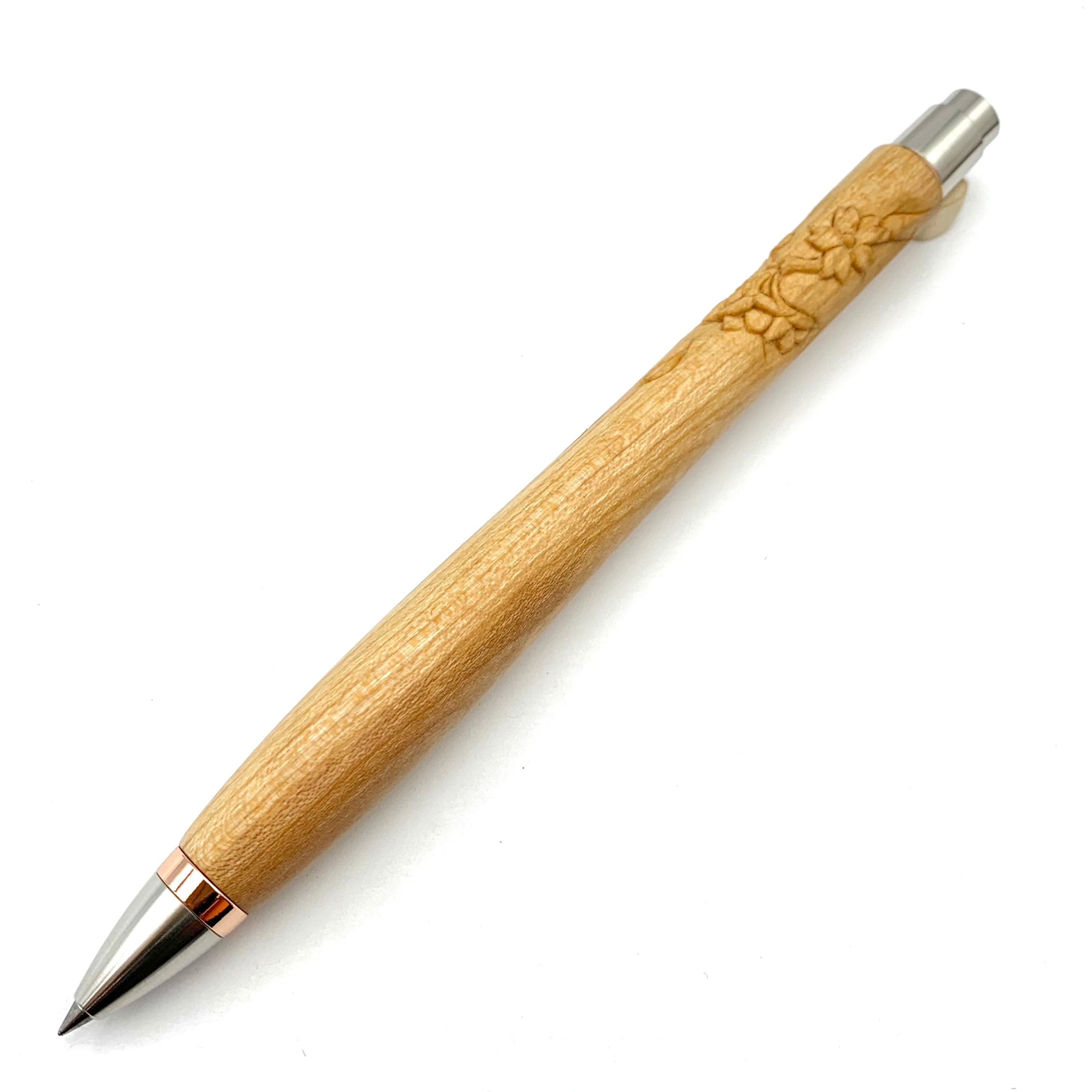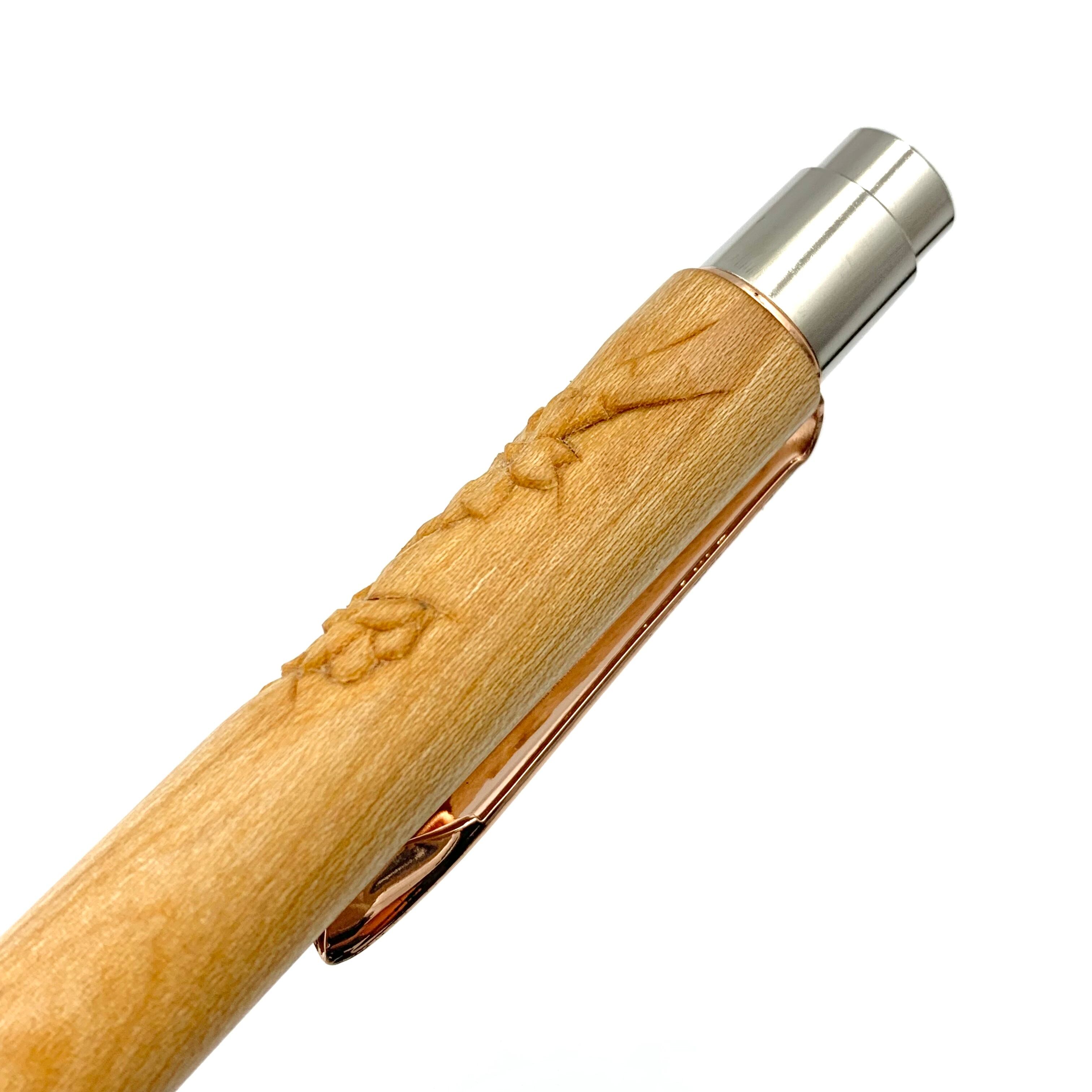 ボールペンのノックシステムは、ドイツ最高のクリックメカニズムを採用してあります。このメカニズムはユニークな機構のため、クリックしたときのカチカチ音が静かで、どんな場所でも気兼ねなく使うことができます。滑らかに動くこのプッシュ感覚を一度味わうと他には戻れなくなってしまうほどの魅力があります。 100分の1単位の加工精度で削り出されたペン先は、軸ブレも全くありません。