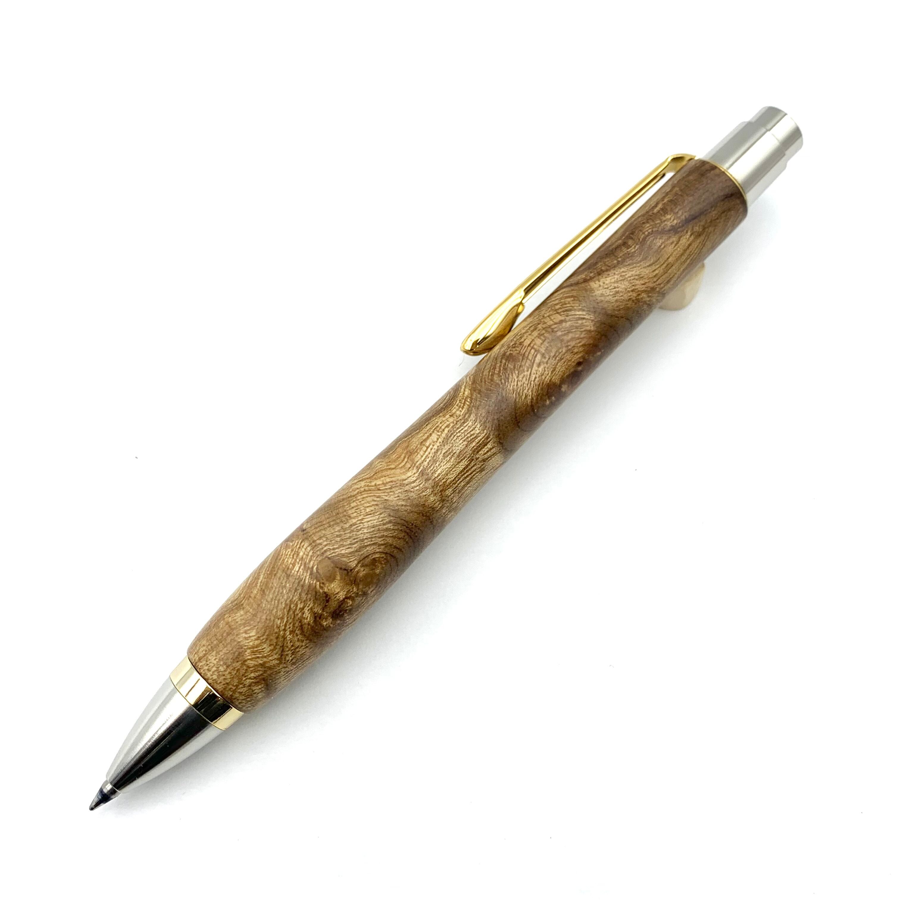 ボールペンのノックシステムは、ドイツ最高のクリックメカニズムを採用してあります。このメカニズムはユニークな機構のため、クリックしたときのカチカチ音が静かで、どんな場所でも気兼ねなく使うことができます。滑らかに動くこのプッシュ感覚を一度味わうと他には戻れなくなってしまうほどの魅力があります。 高級ステンレス材を100分の1単位の加工精度で削り出された口金により芯ブレも全くありません。内部のアルミを使ったリフィルアダプターもオリジナルです。