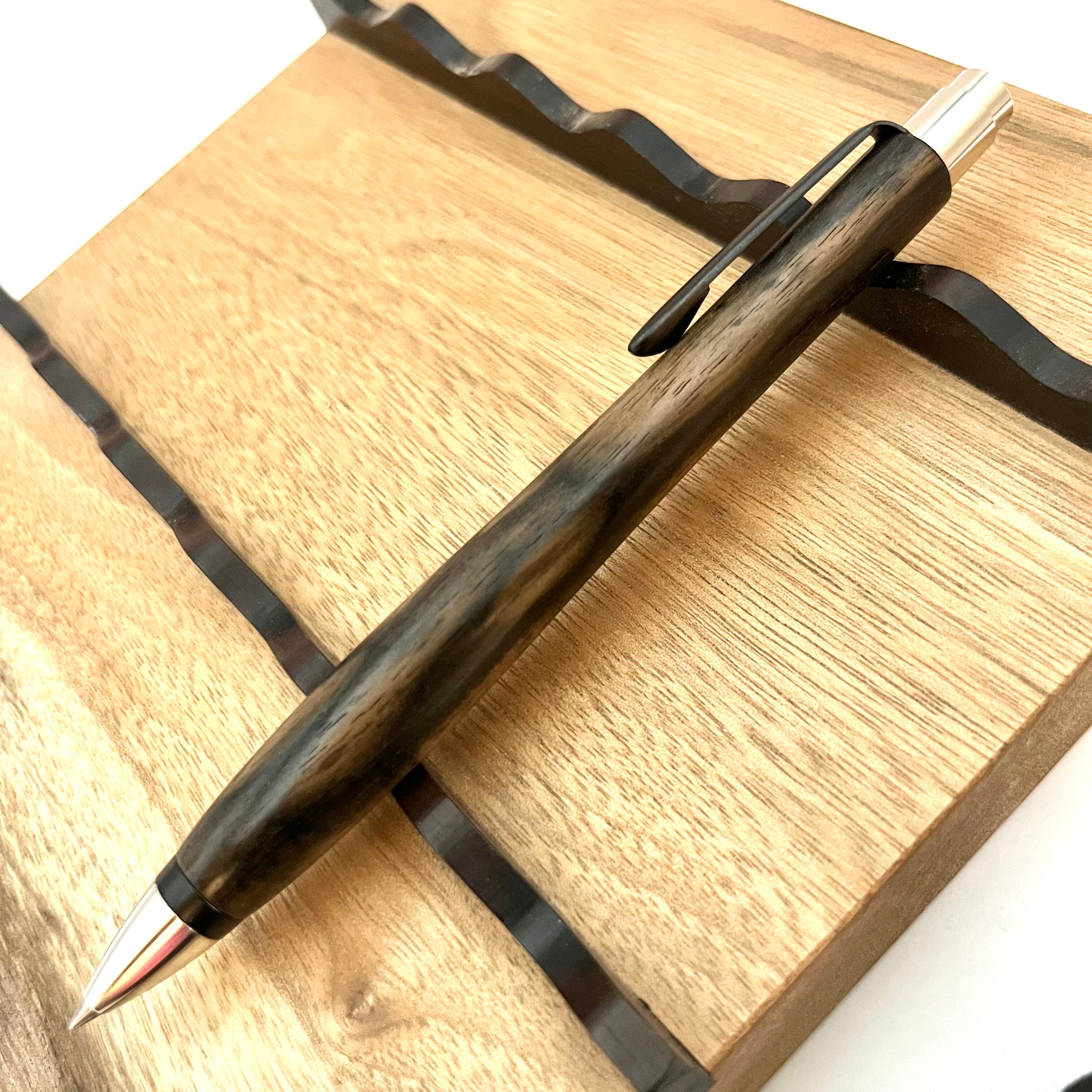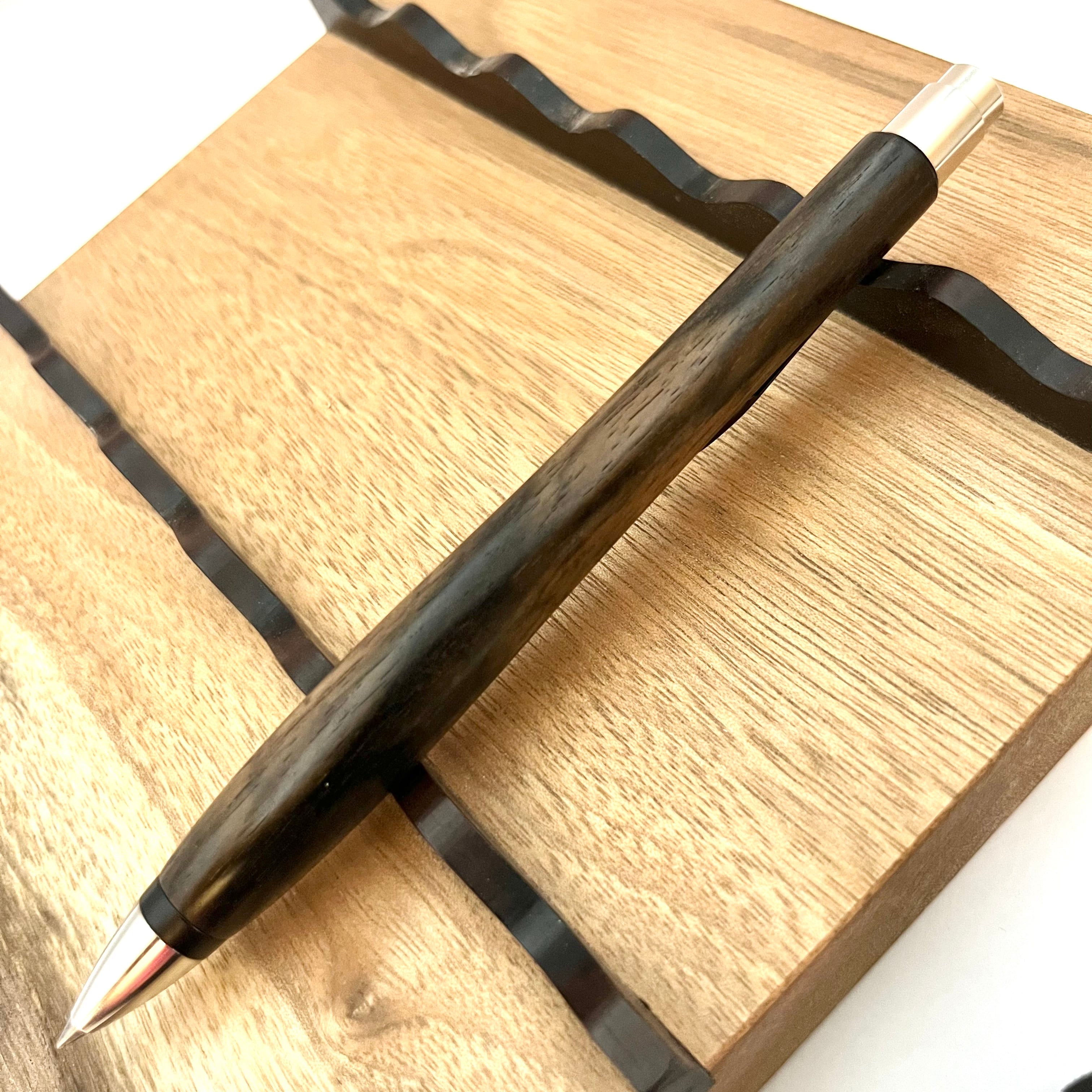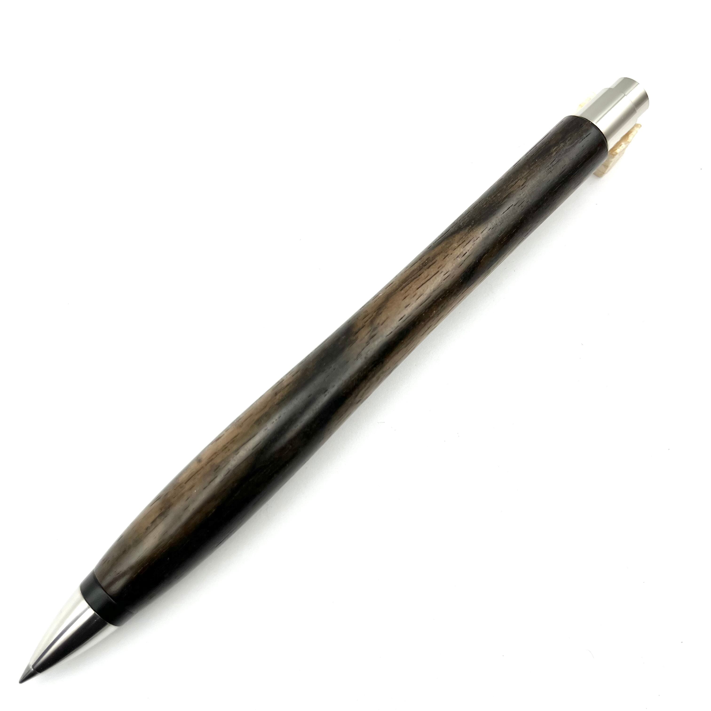 ボールペンのノックシステムは、ドイツ最高のクリックメカニズムを採用してあります。このメカニズムはユニークな機構のため、クリックしたときのカチカチ音が静かで、どんな場所でも気兼ねなく使うことができます。滑らかに動くこのプッシュ感覚を一度味わうと他には戻れなくなってしまうほどの魅力があります。 100分の1単位の加工精度で削り出されたペン先は、軸ブレも全くありません。