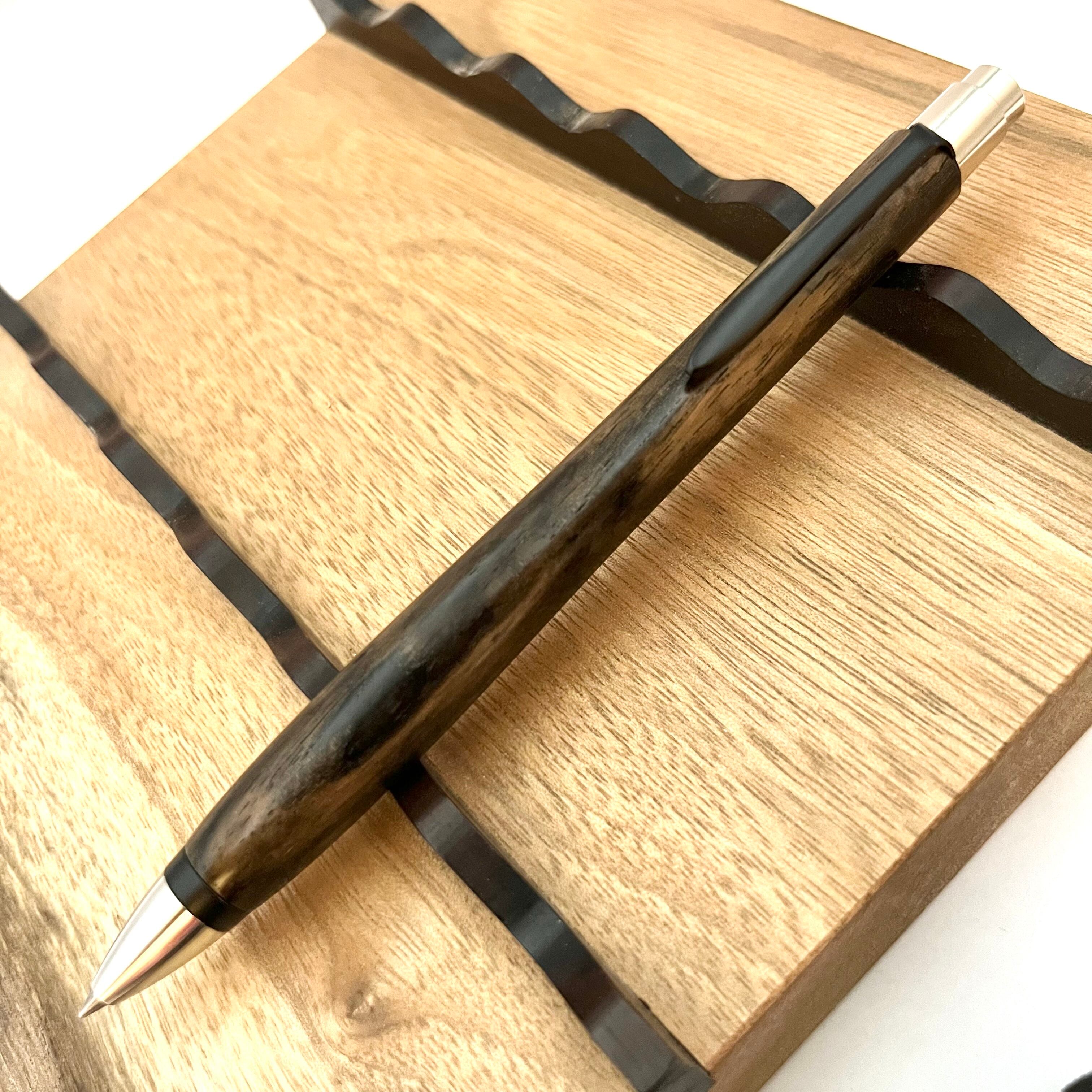 ボールペンのノックシステムは、ドイツ最高のクリックメカニズムを採用してあります。このメカニズムはユニークな機構のため、クリックしたときのカチカチ音が静かで、どんな場所でも気兼ねなく使うことができます。滑らかに動くこのプッシュ感覚を一度味わうと他には戻れなくなってしまうほどの魅力があります。 100分の1単位の加工精度で削り出されたペン先は、軸ブレも全くありません。