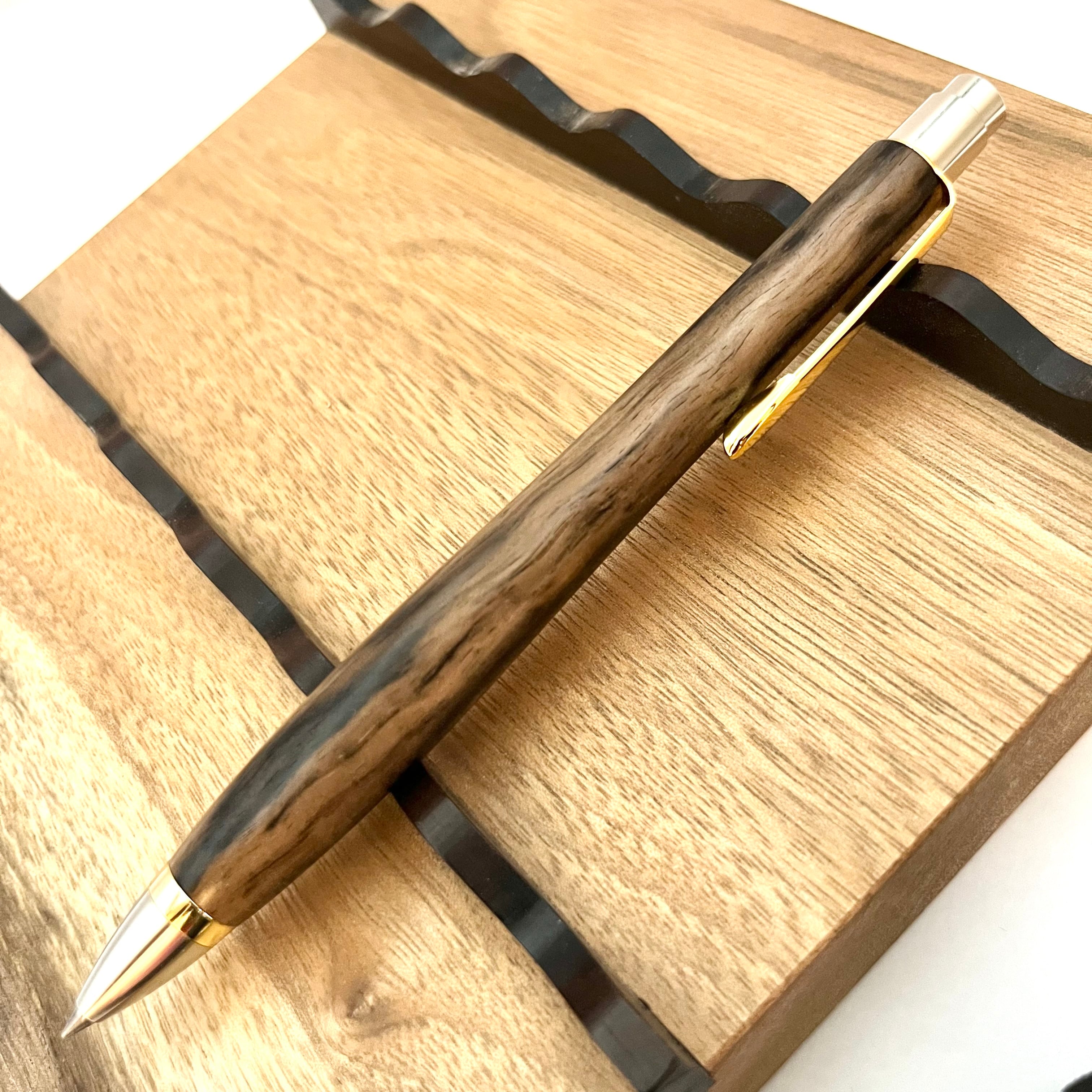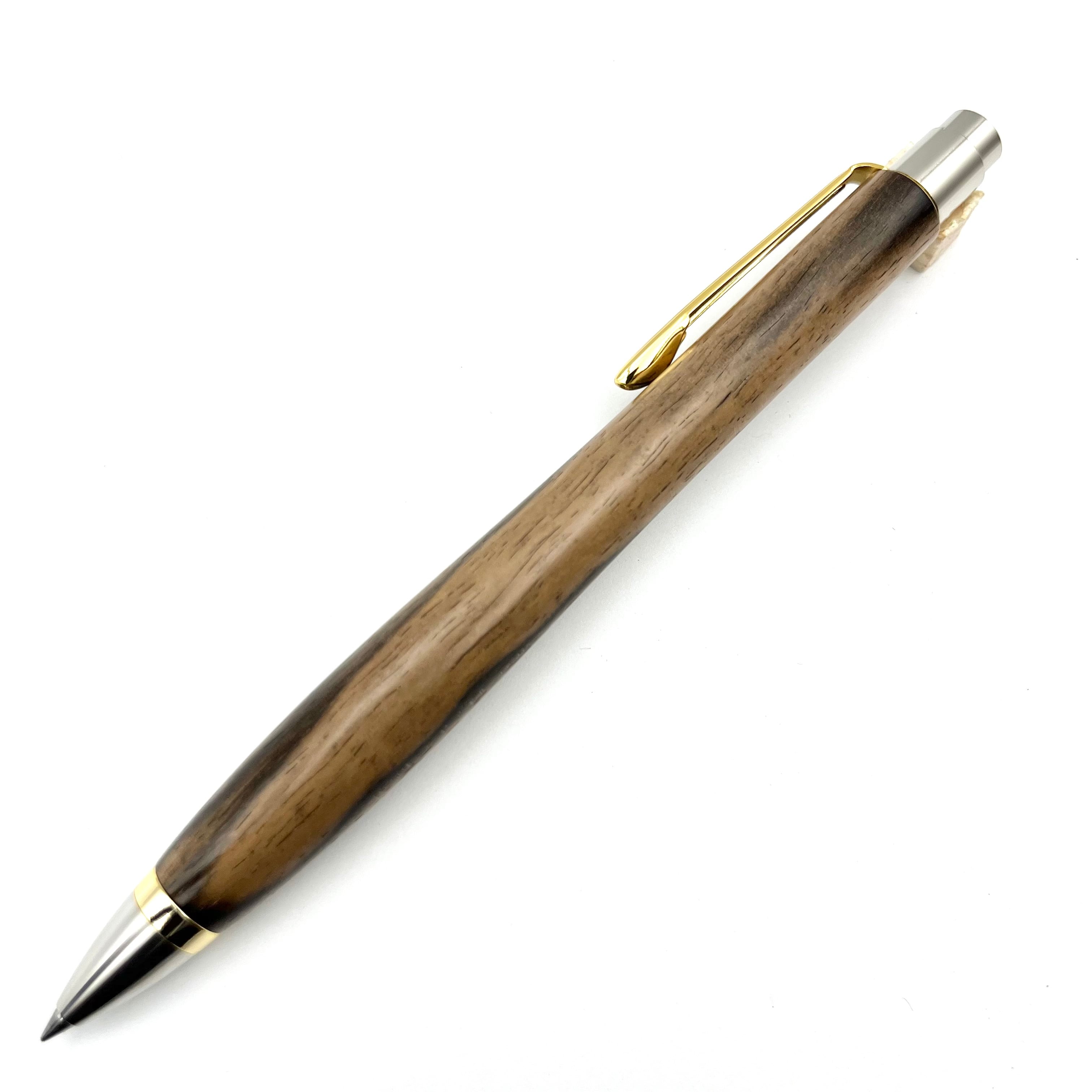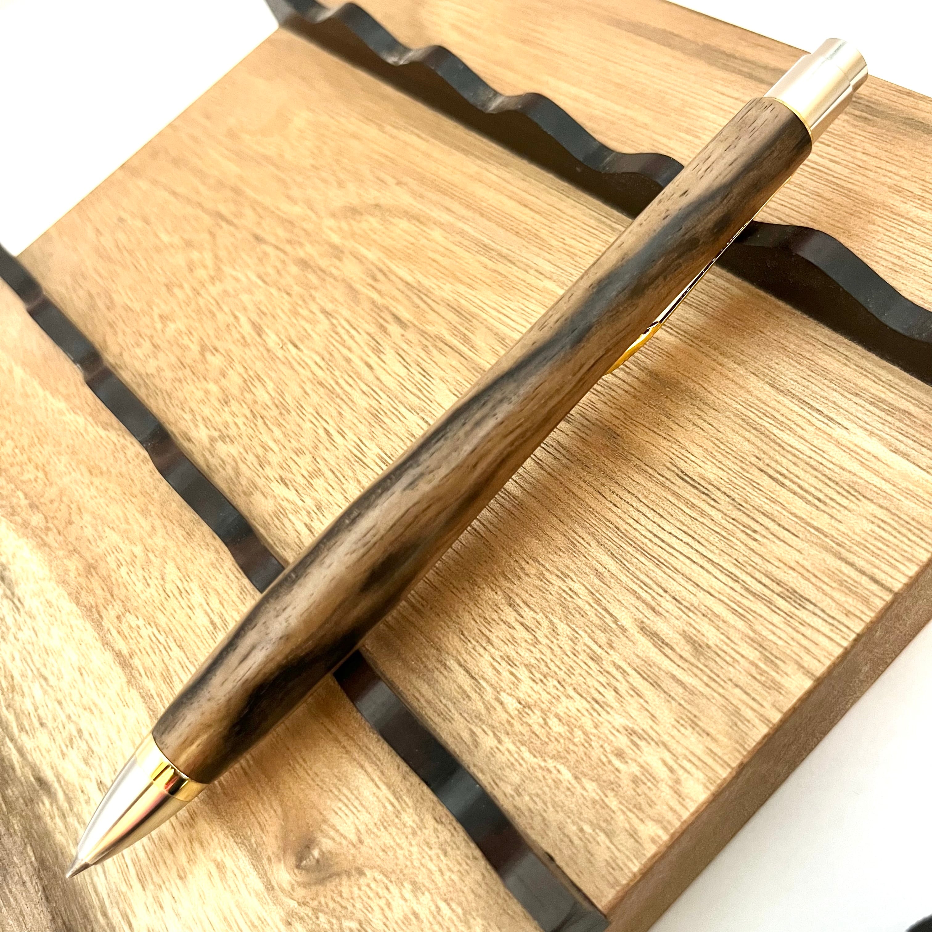 ボールペンのノックシステムは、ドイツ最高のクリックメカニズムを採用してあります。このメカニズムはユニークな機構のため、クリックしたときのカチカチ音が静かで、どんな場所でも気兼ねなく使うことができます。滑らかに動くこのプッシュ感覚を一度味わうと他には戻れなくなってしまうほどの魅力があります。 100分の1単位の加工精度で削り出されたペン先は、軸ブレも全くありません。