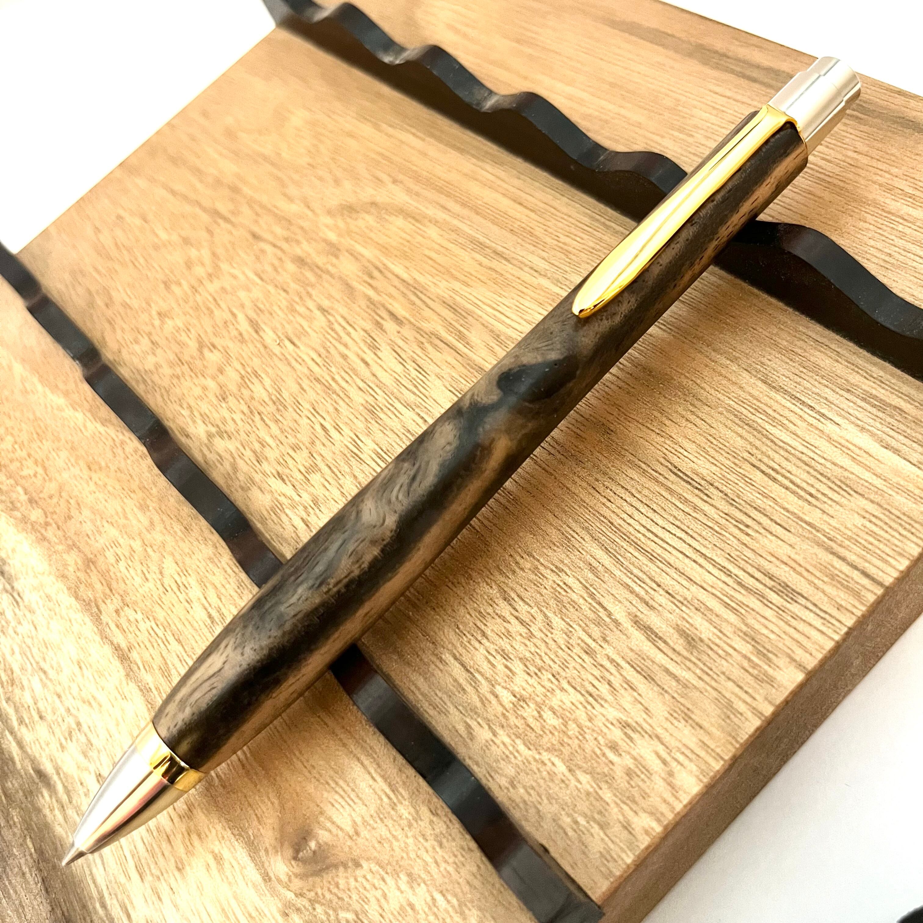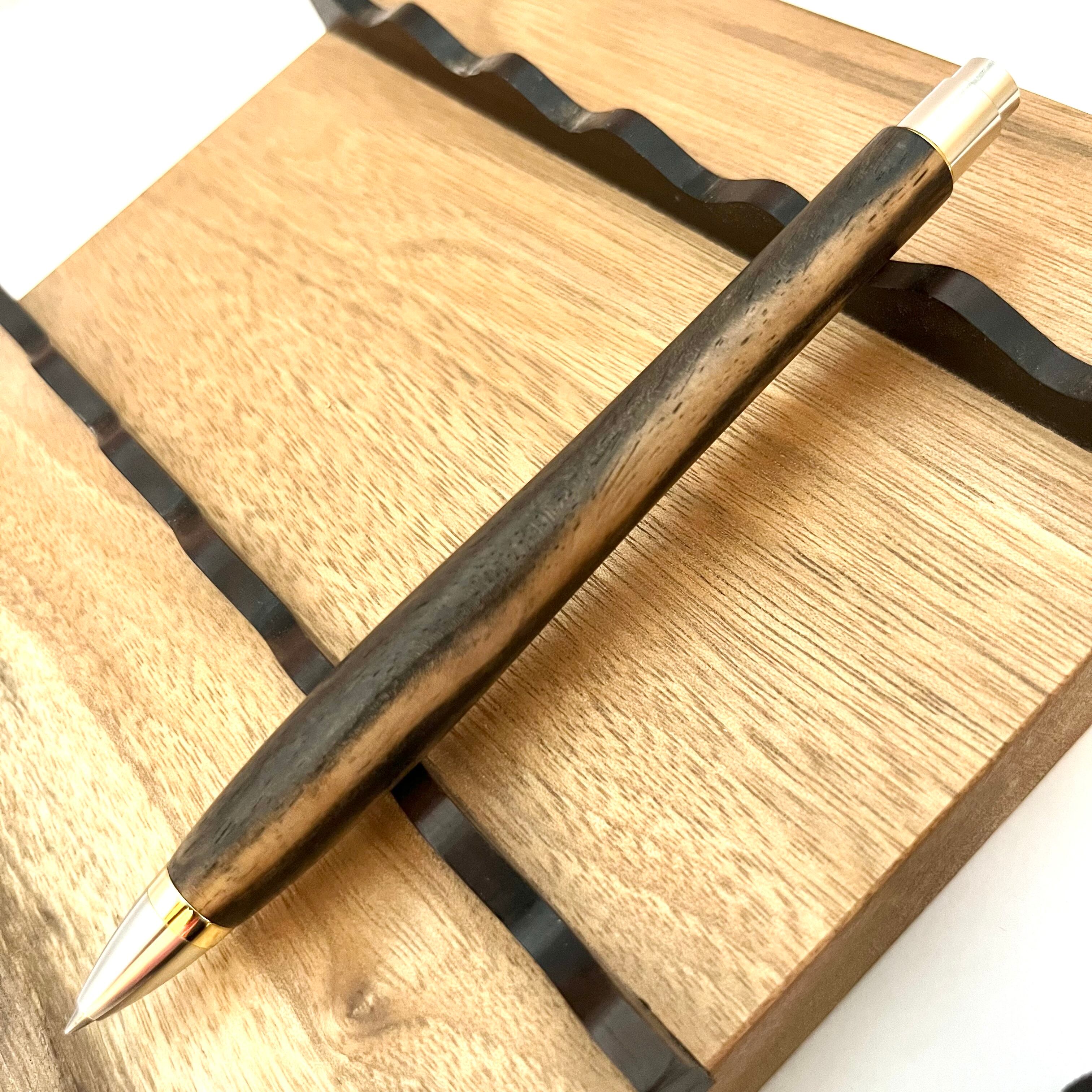 ボールペンのノックシステムは、ドイツ最高のクリックメカニズムを採用してあります。このメカニズムはユニークな機構のため、クリックしたときのカチカチ音が静かで、どんな場所でも気兼ねなく使うことができます。滑らかに動くこのプッシュ感覚を一度味わうと他には戻れなくなってしまうほどの魅力があります。 100分の1単位の加工精度で削り出されたペン先は、軸ブレも全くありません。