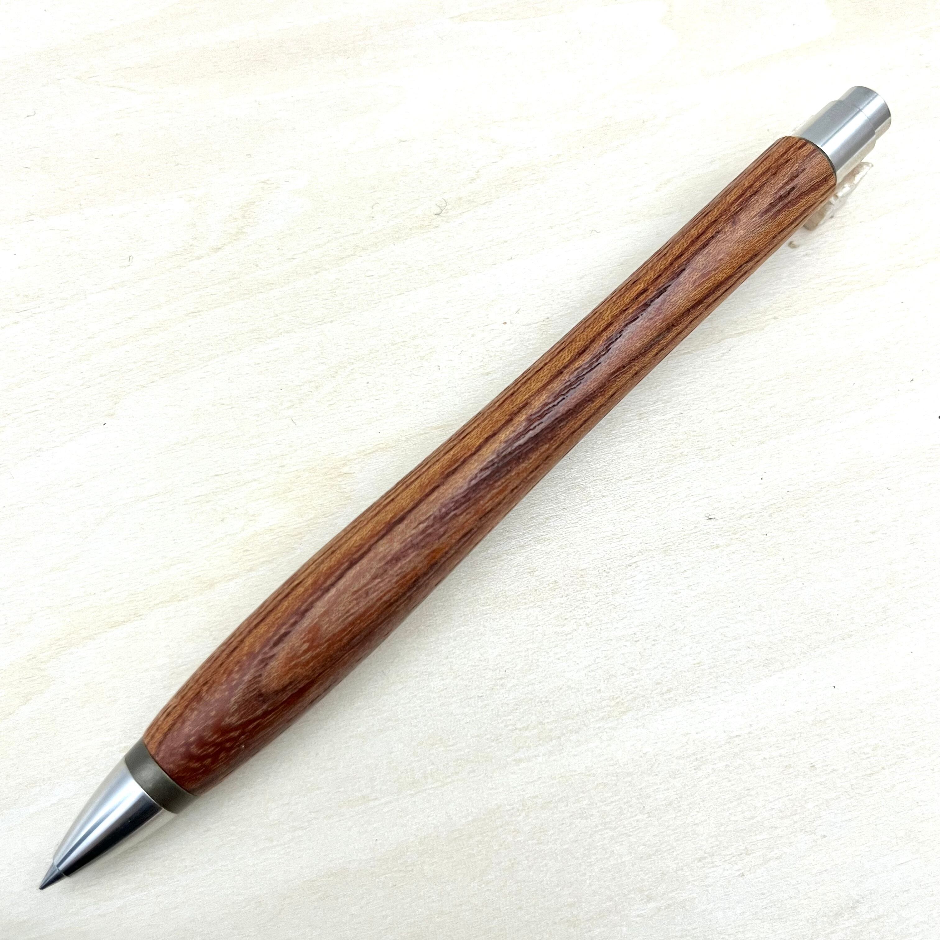 ペンに使った木は、推定50年以上も前に雷に打たれた大枝を強剪定したもので、巨木と雷の影響で普通の欅と色合いが全く違い濃いです。