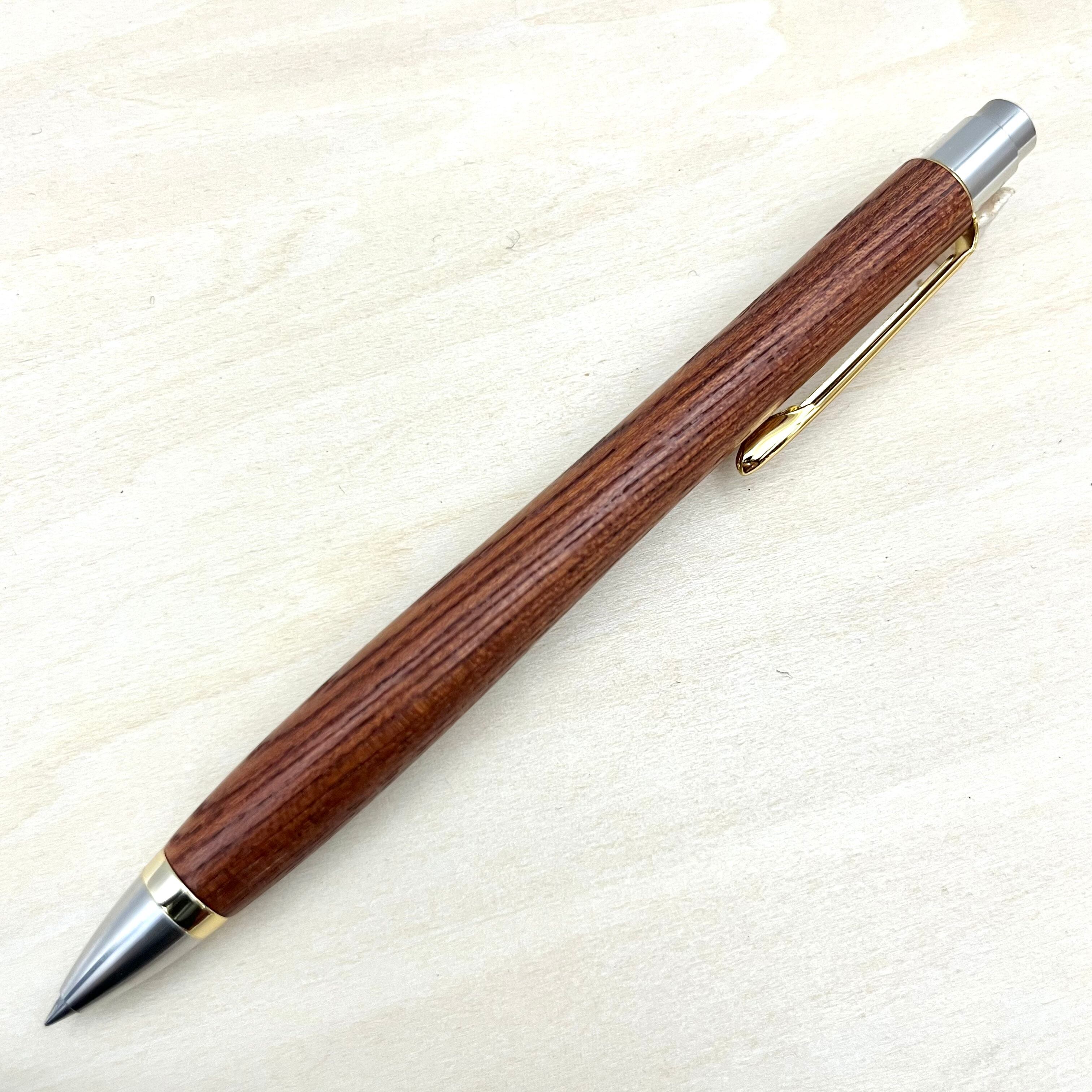 ペンに使った木は、推定50年以上も前に雷に打たれた大枝を強剪定したもので、巨木と雷の影響で普通の欅と色合いが全く違い濃いです。