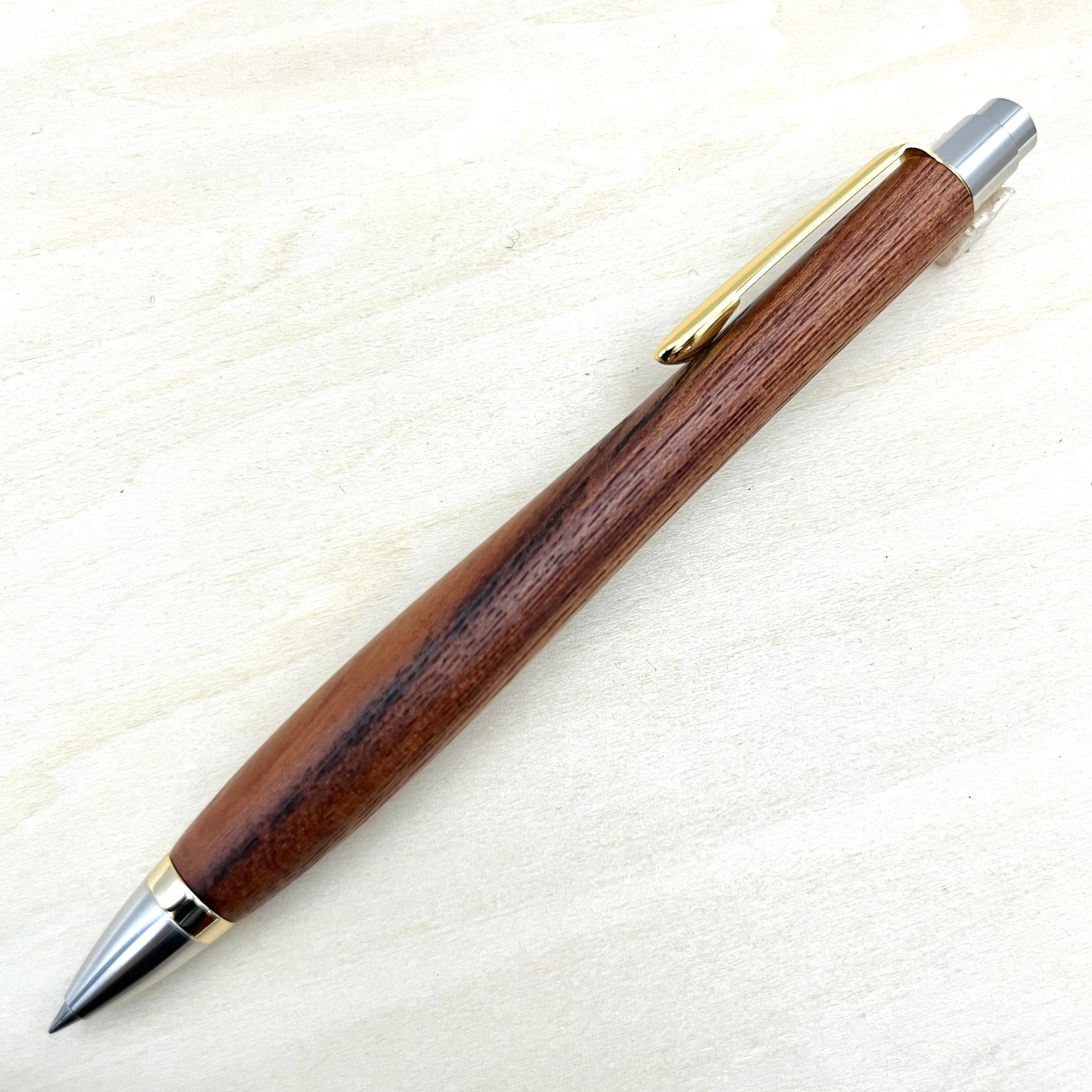 ペンに使った木は、推定50年以上も前に雷に打たれた大枝を強剪定したもので、巨木と雷の影響で普通の欅と色合いが全く違い濃いです。