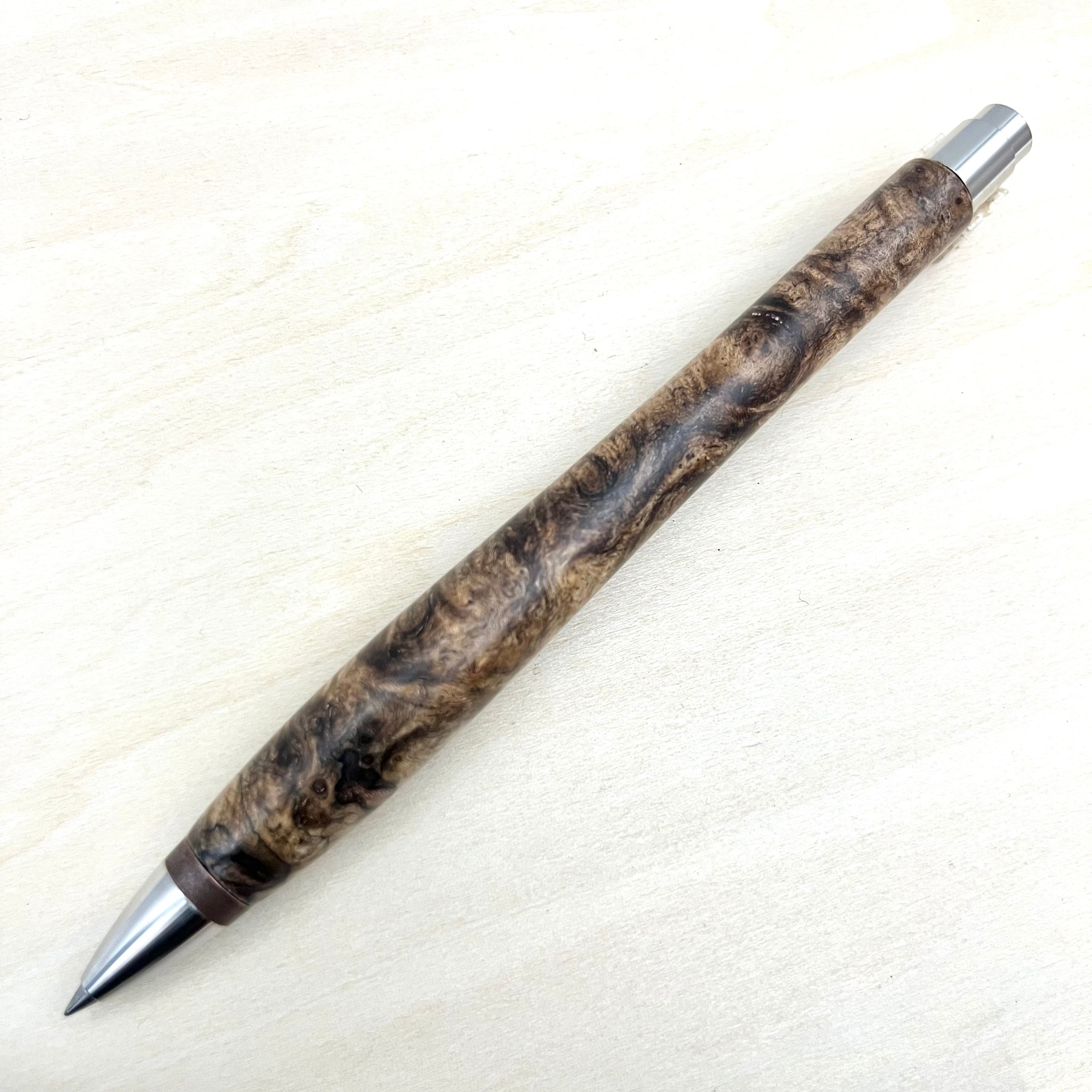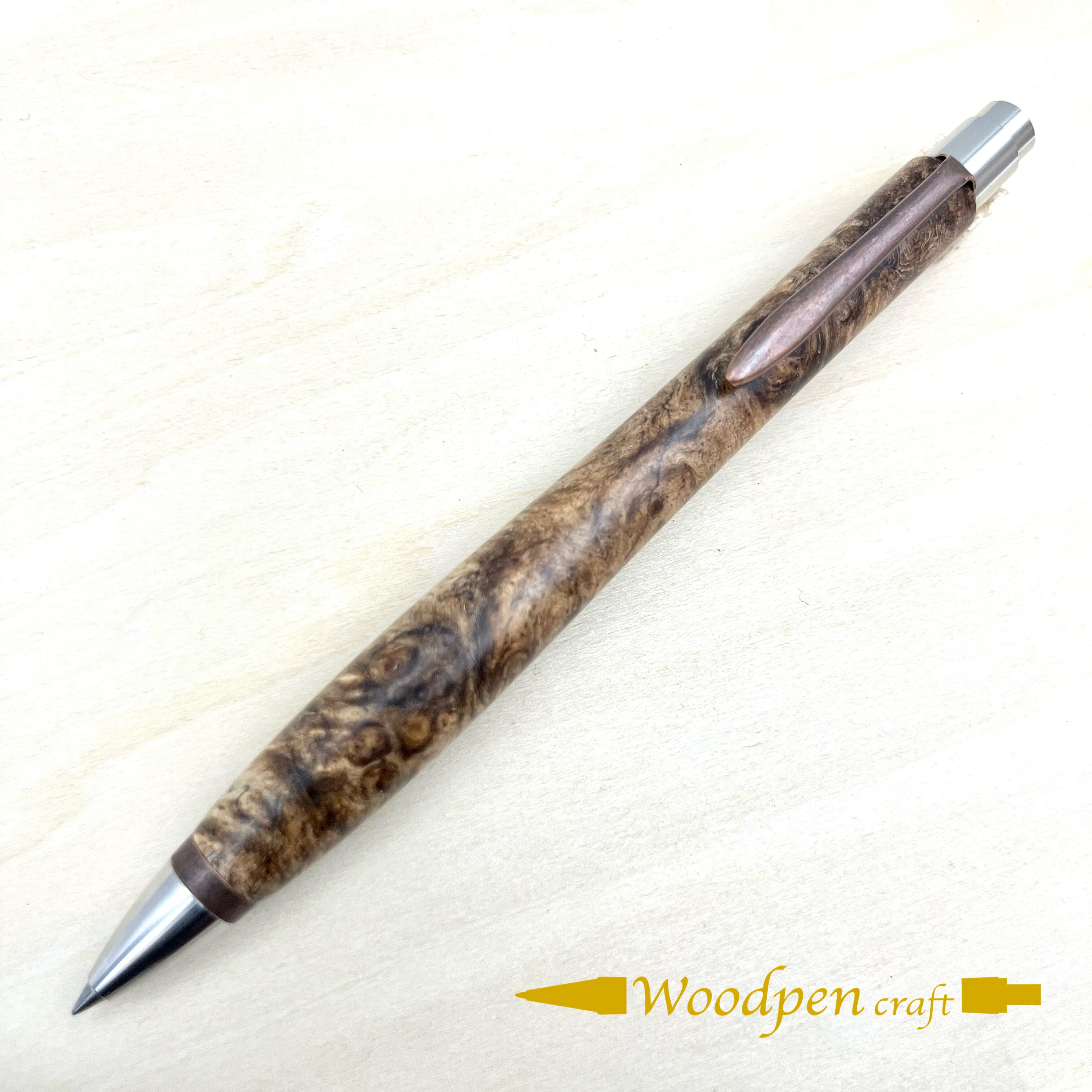 ボールペンのノックシステムは、ドイツ最高のクリックメカニズムを採用してあります。このメカニズムはユニークな機構のため、クリックしたときのカチカチ音が静かで、どんな場所でも気兼ねなく使うことができます。滑らかに動くこのプッシュ感覚を一度味わうと他には戻れなくなってしまうほどの魅力があります。 100分の1単位の加工精度で削り出されたペン先は、軸ブレも全くありません。