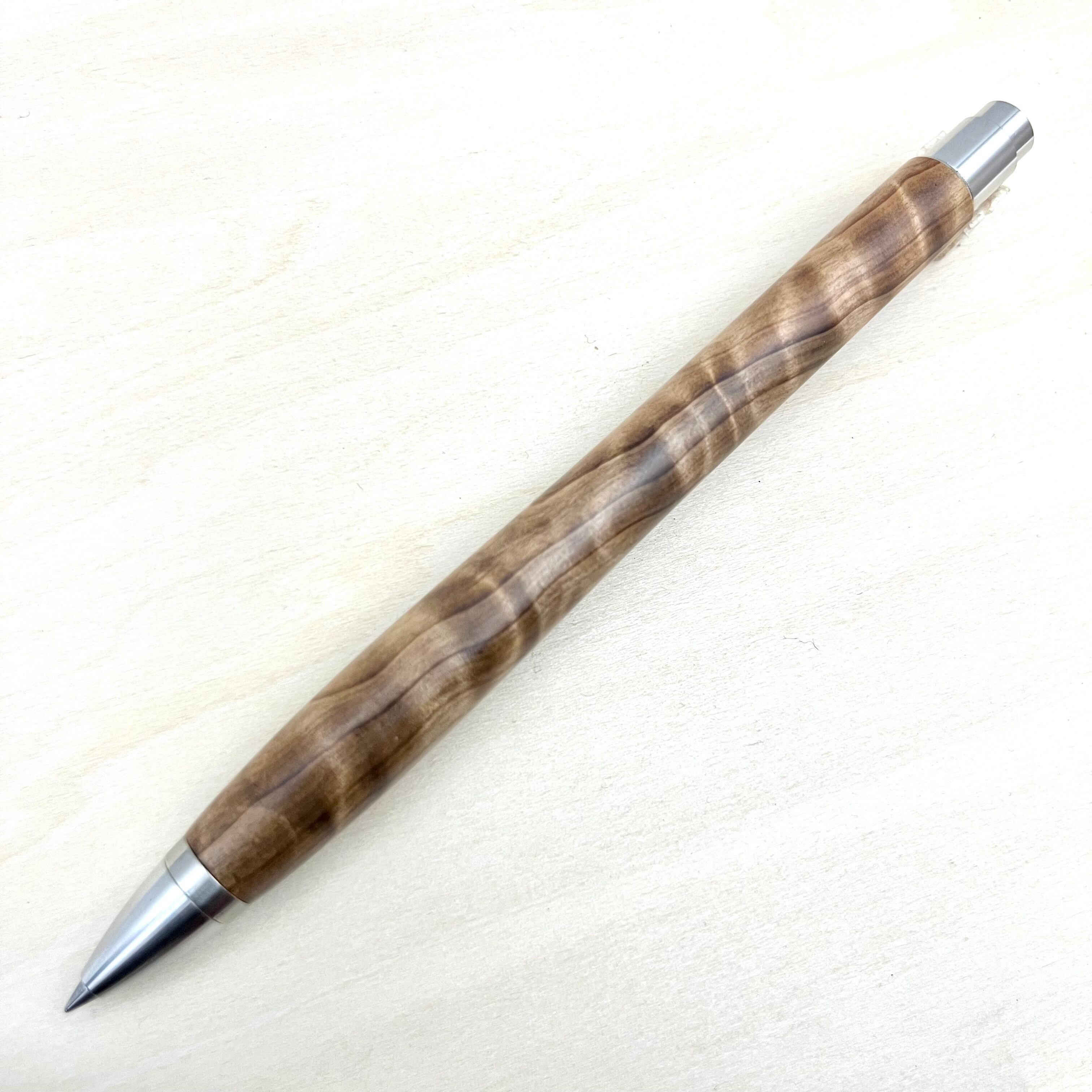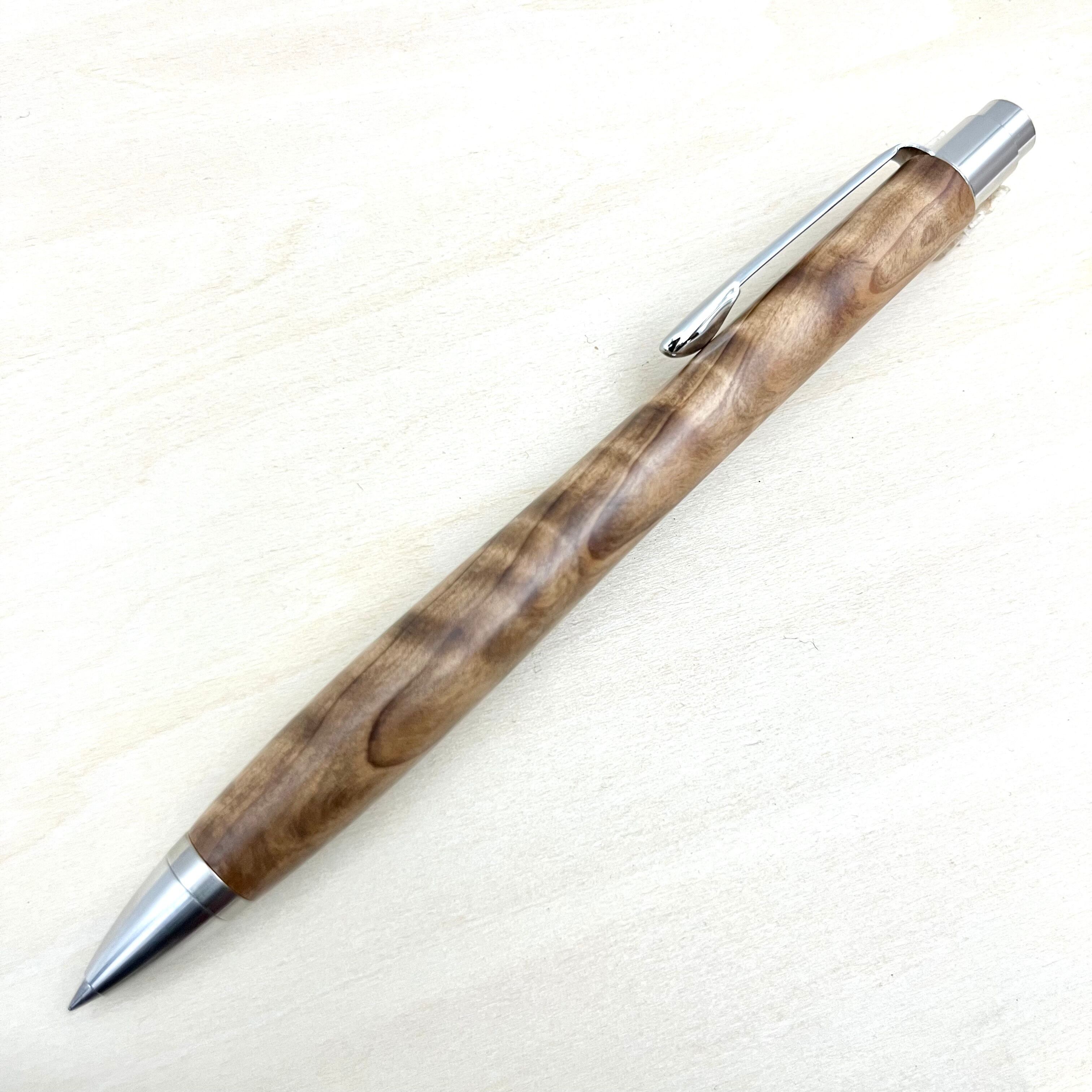 ボールペンのノックシステムは、ドイツ最高のクリックメカニズムを採用してあります。このメカニズムはユニークな機構のため、クリックしたときのカチカチ音が静かで、どんな場所でも気兼ねなく使うことができます。滑らかに動くこのプッシュ感覚を一度味わうと他には戻れなくなってしまうほどの魅力があります。 100分の1単位の加工精度で削り出されたペン先は、軸ブレも全くありません。