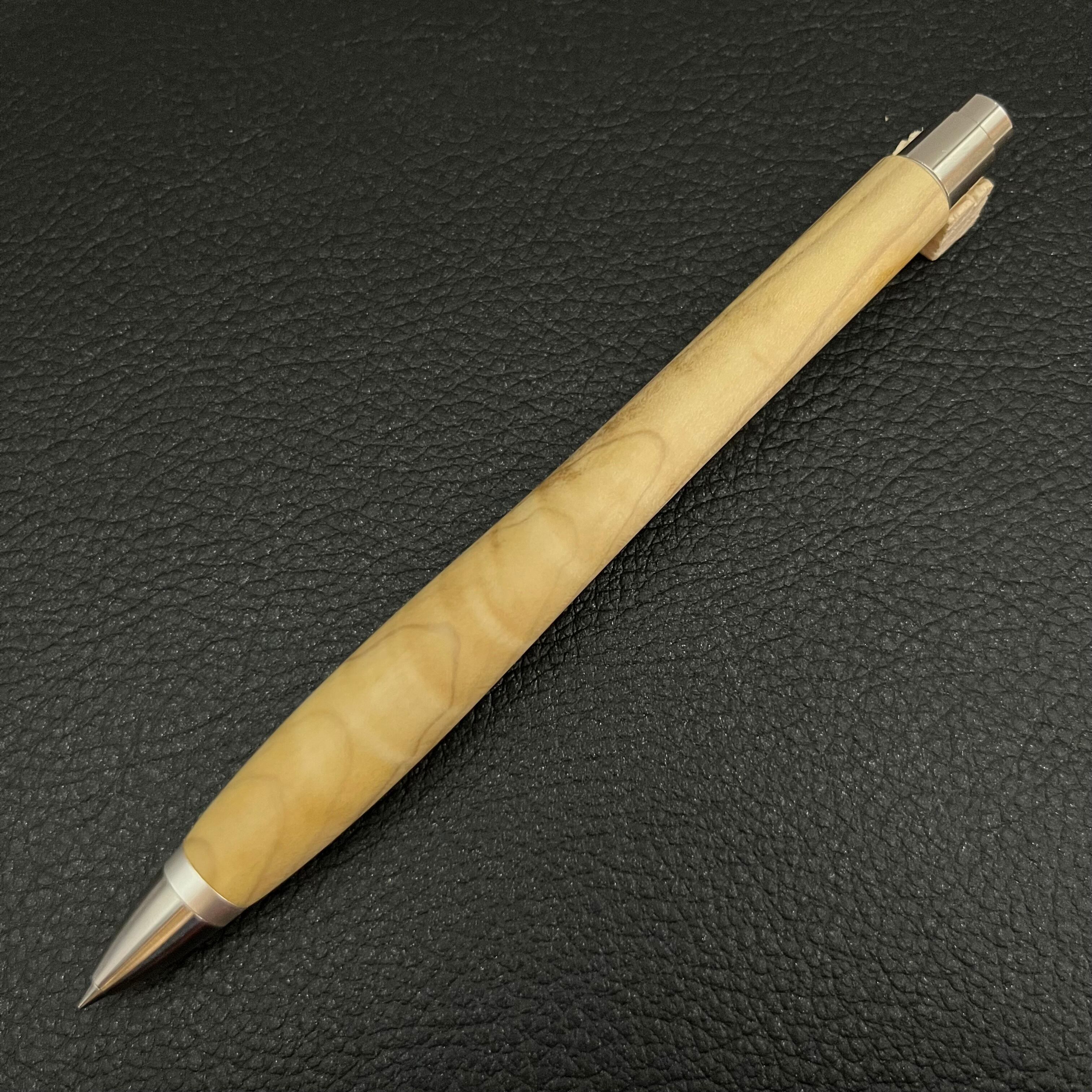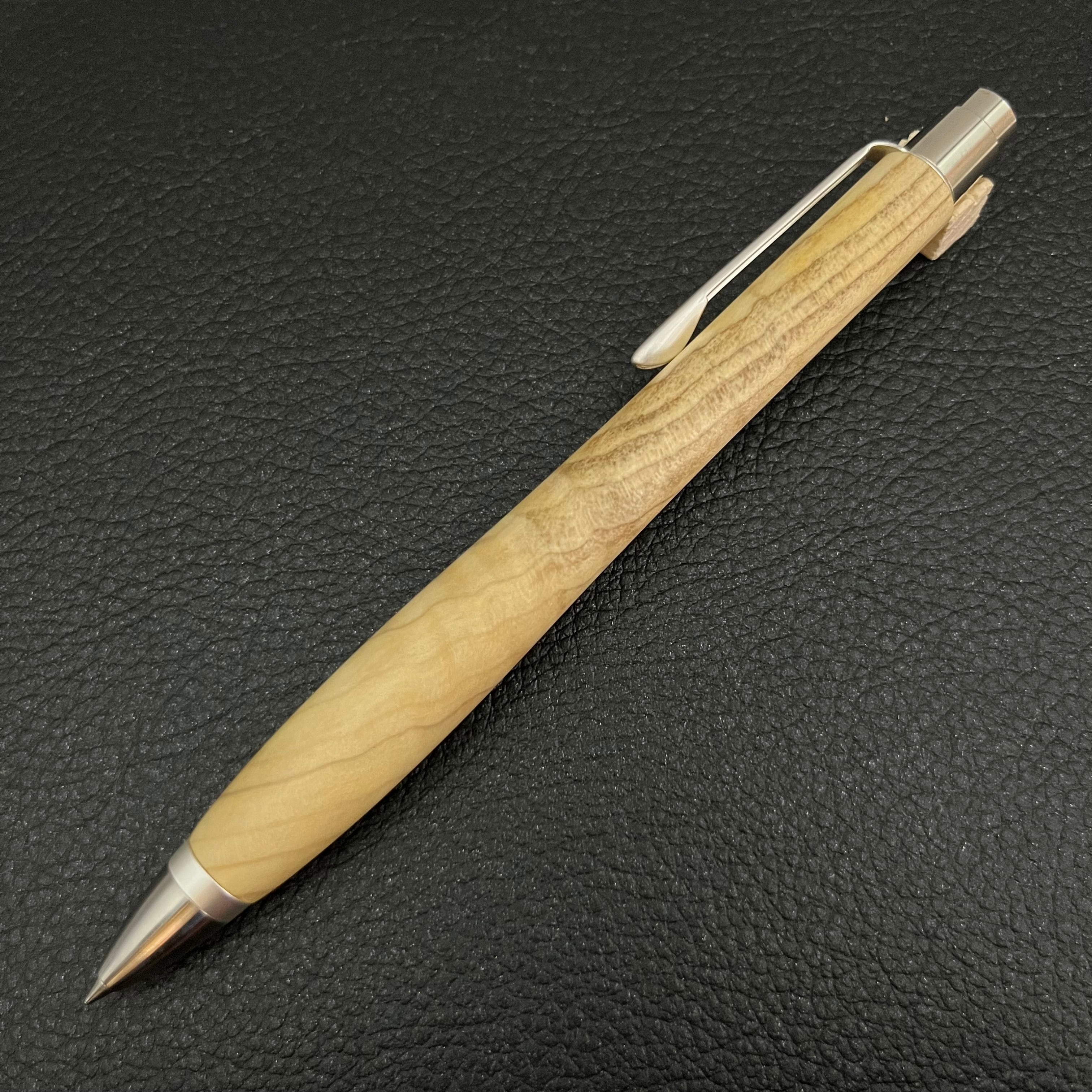 ボールペンのノックシステムは、ドイツ最高のクリックメカニズムを採用してあります。このメカニズムはユニークな機構のため、クリックしたときのカチカチ音が静かで、どんな場所でも気兼ねなく使うことができます。滑らかに動くこのプッシュ感覚を一度味わうと他には戻れなくなってしまうほどの魅力があります。 100分の1単位の加工精度で削り出されたペン先は、軸ブレも全くありません。