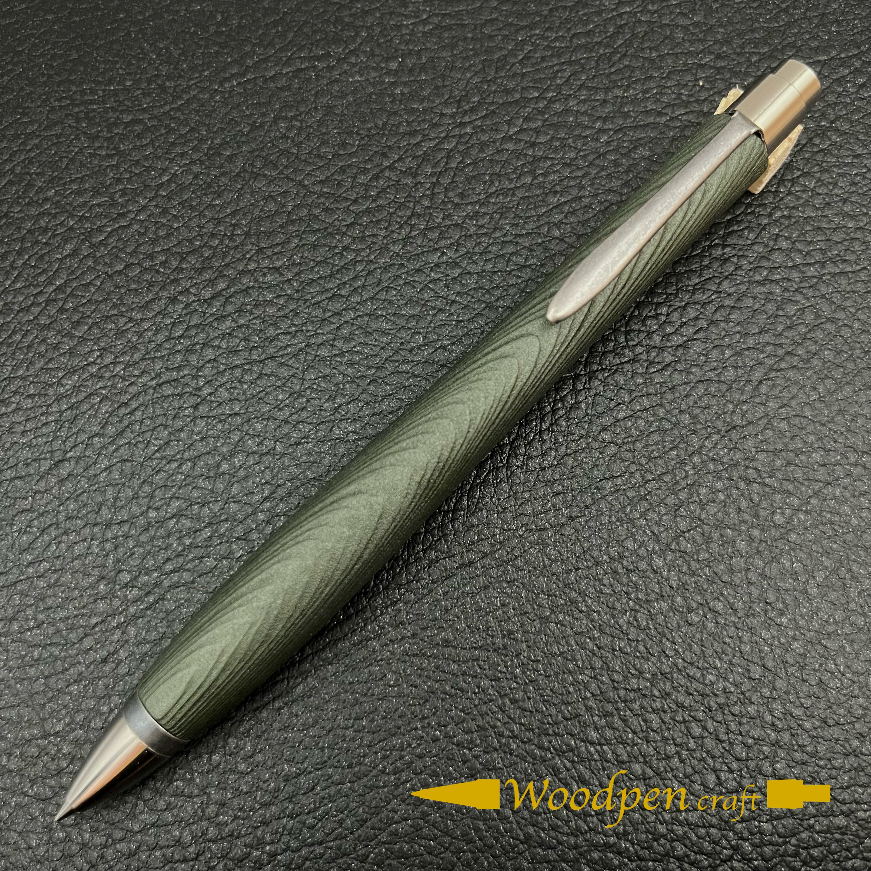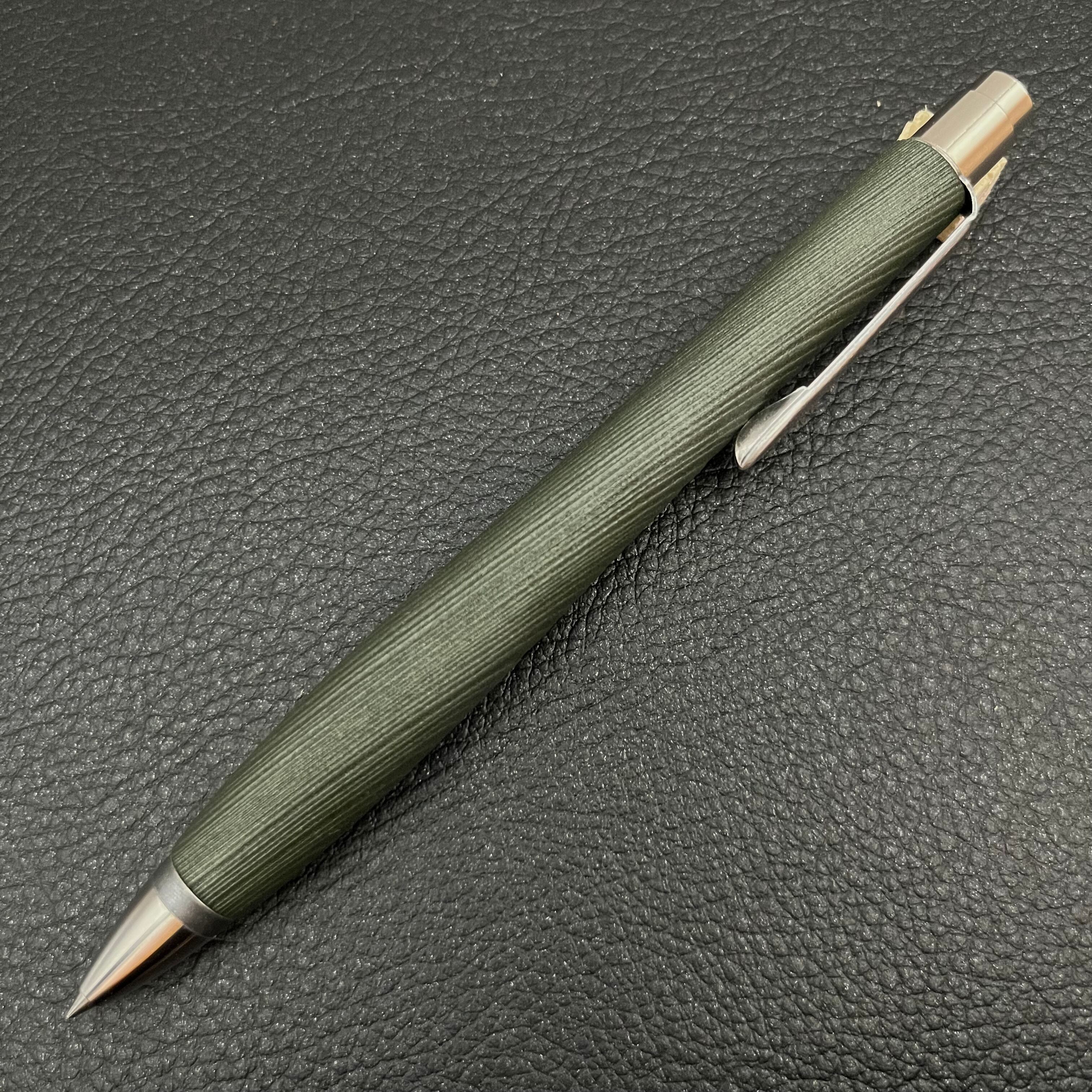 ボールペンのノックシステムは、ドイツ最高のクリックメカニズムを採用してあります。このメカニズムはユニークな機構のため、クリックしたときのカチカチ音が静かで、どんな場所でも気兼ねなく使うことができます。滑らかに動くこのプッシュ感覚を一度味わうと他には戻れなくなってしまうほどの魅力があります。 100分の1単位の加工精度で削り出されたペン先は、軸ブレも全くありません。