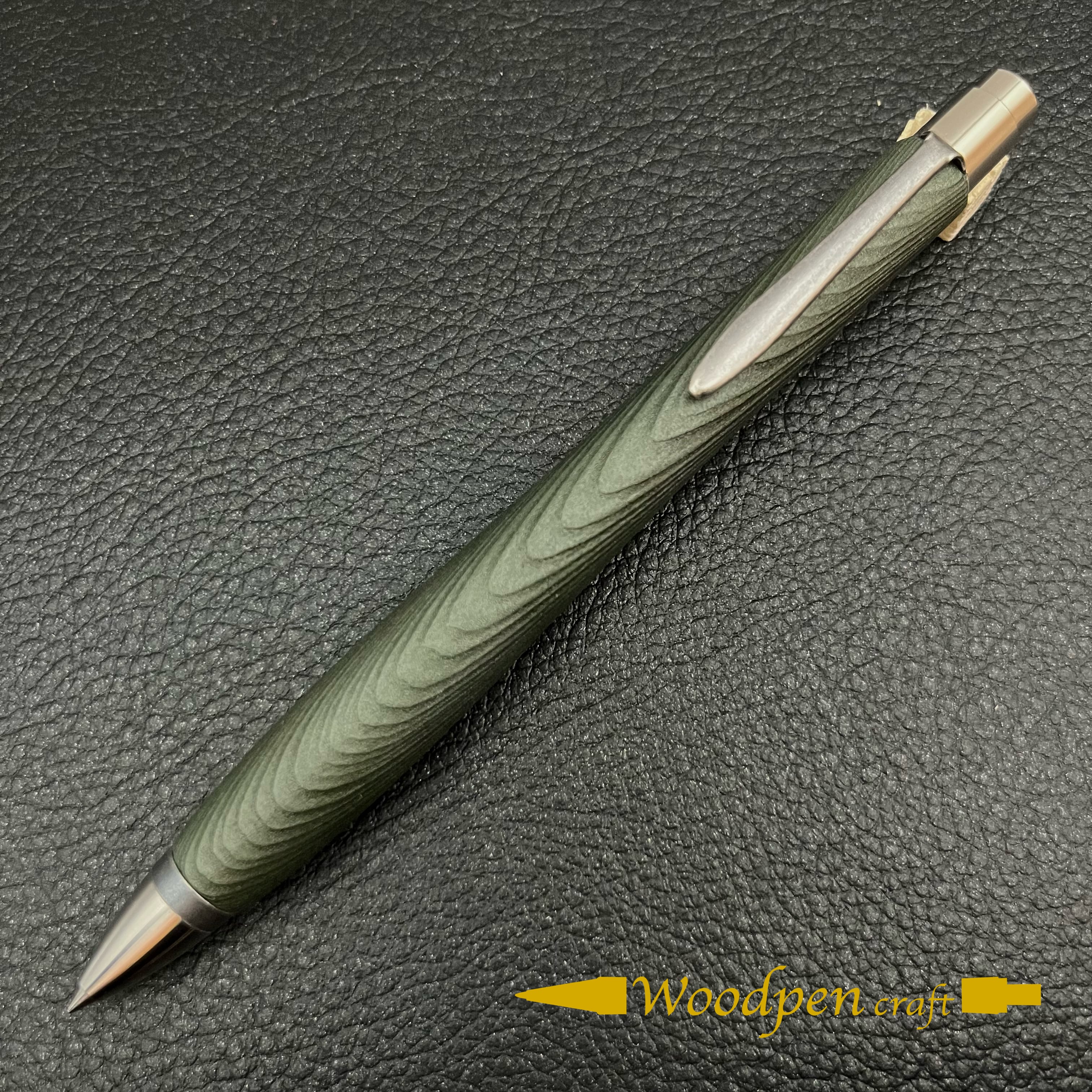 ボールペンのノックシステムは、ドイツ最高のクリックメカニズムを採用してあります。このメカニズムはユニークな機構のため、クリックしたときのカチカチ音が静かで、どんな場所でも気兼ねなく使うことができます。滑らかに動くこのプッシュ感覚を一度味わうと他には戻れなくなってしまうほどの魅力があります。 100分の1単位の加工精度で削り出されたペン先は、軸ブレも全くありません。