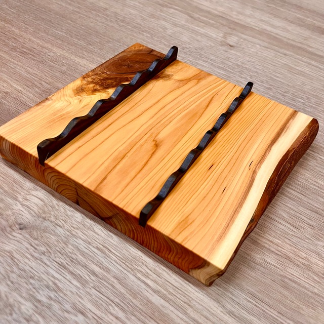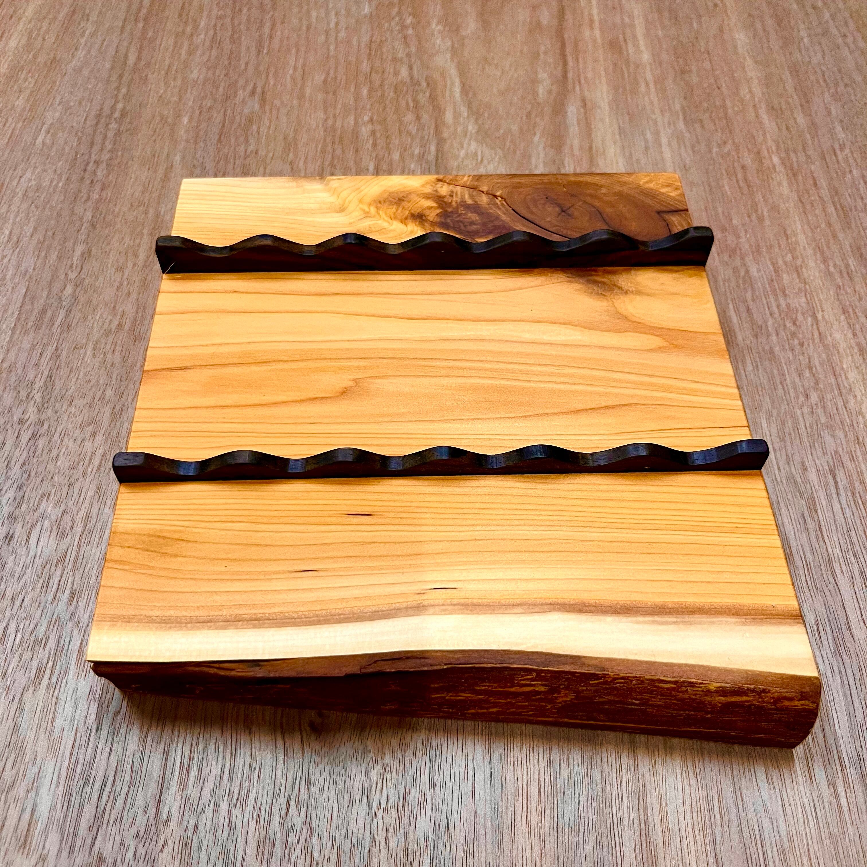 耳付き一枚板を天然オイルで仕上げてあり、ペンの長さや太さが違っても置けるように作られています。