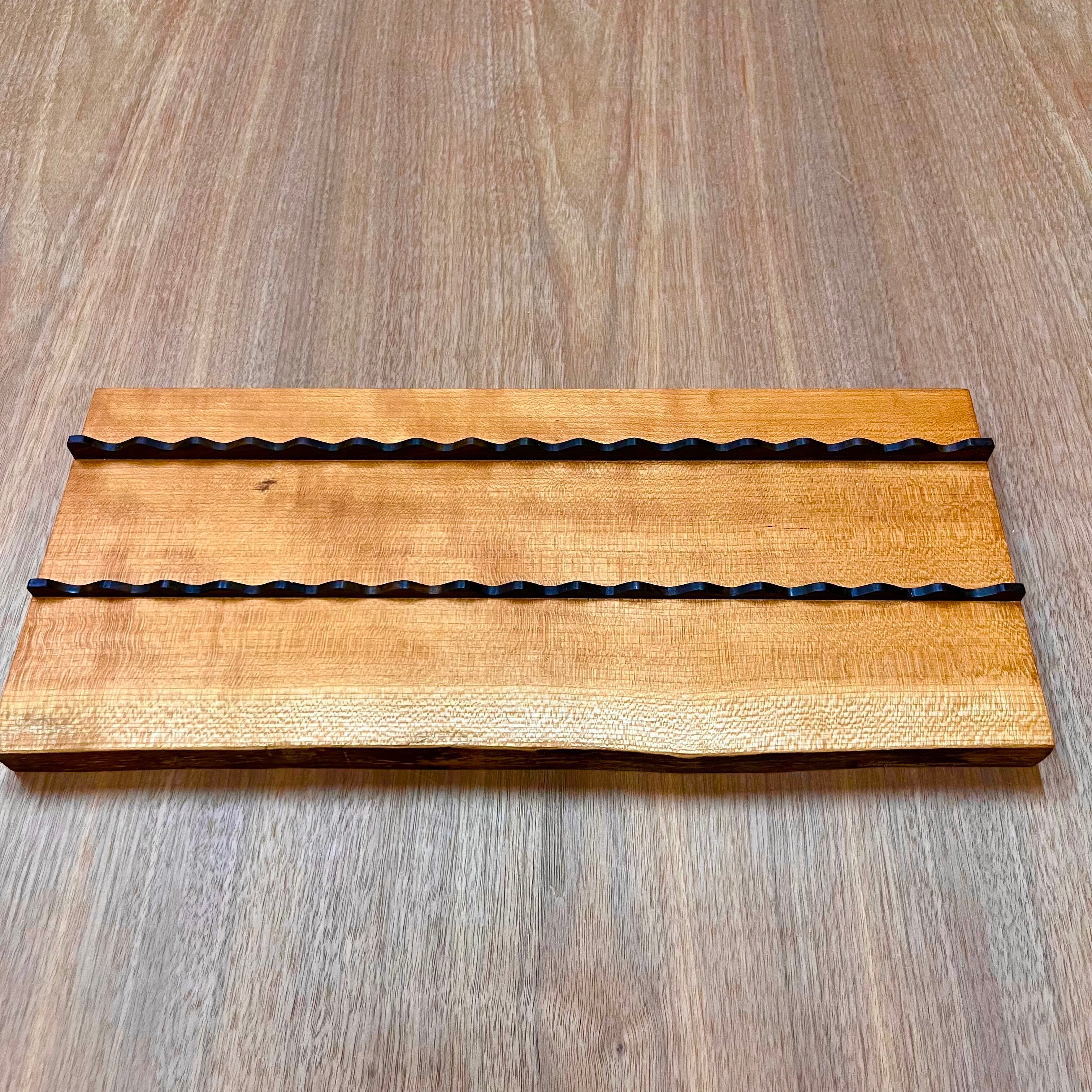 耳付き一枚板を天然オイルで仕上げてあり、ペンの長さや太さが違っても置けるように作られています。