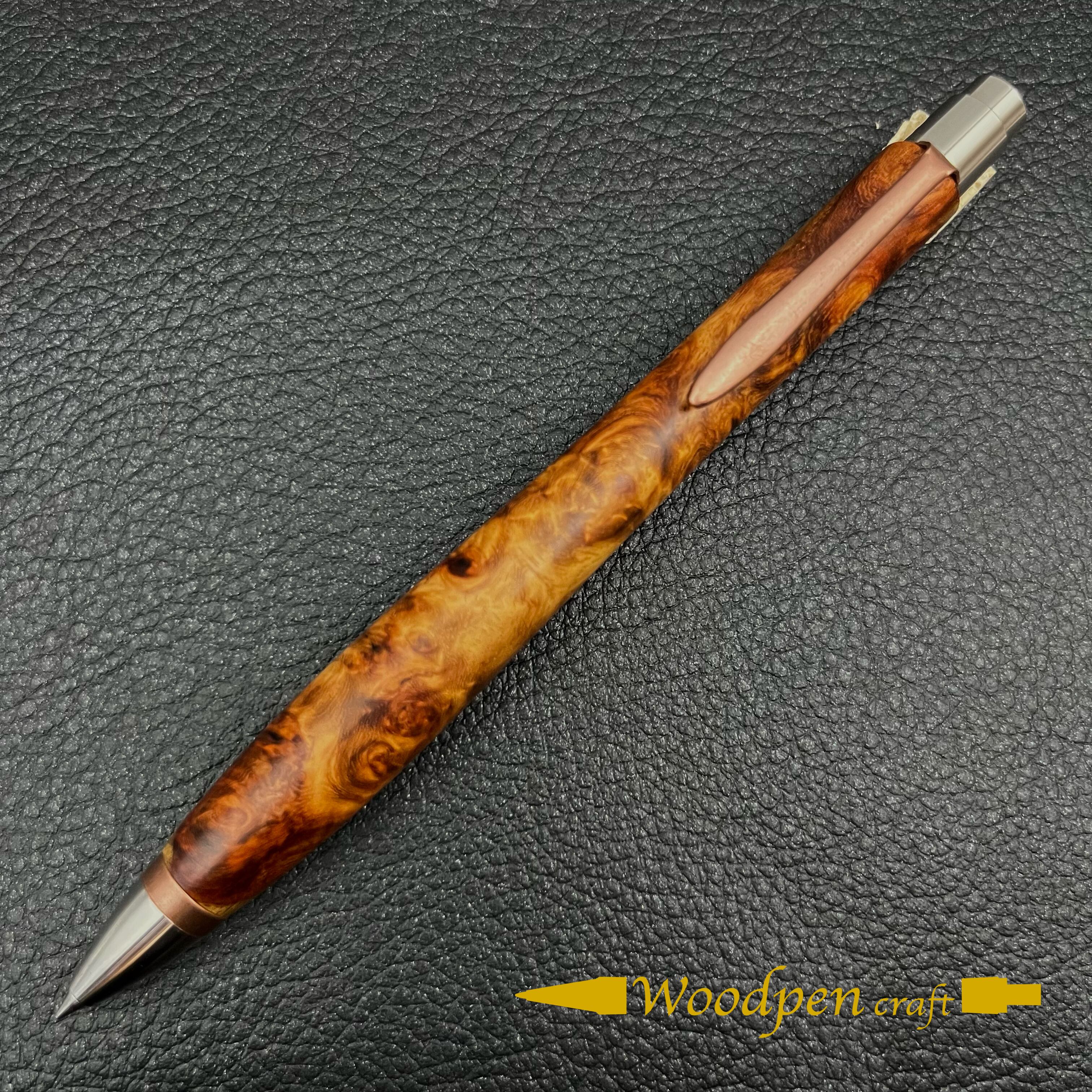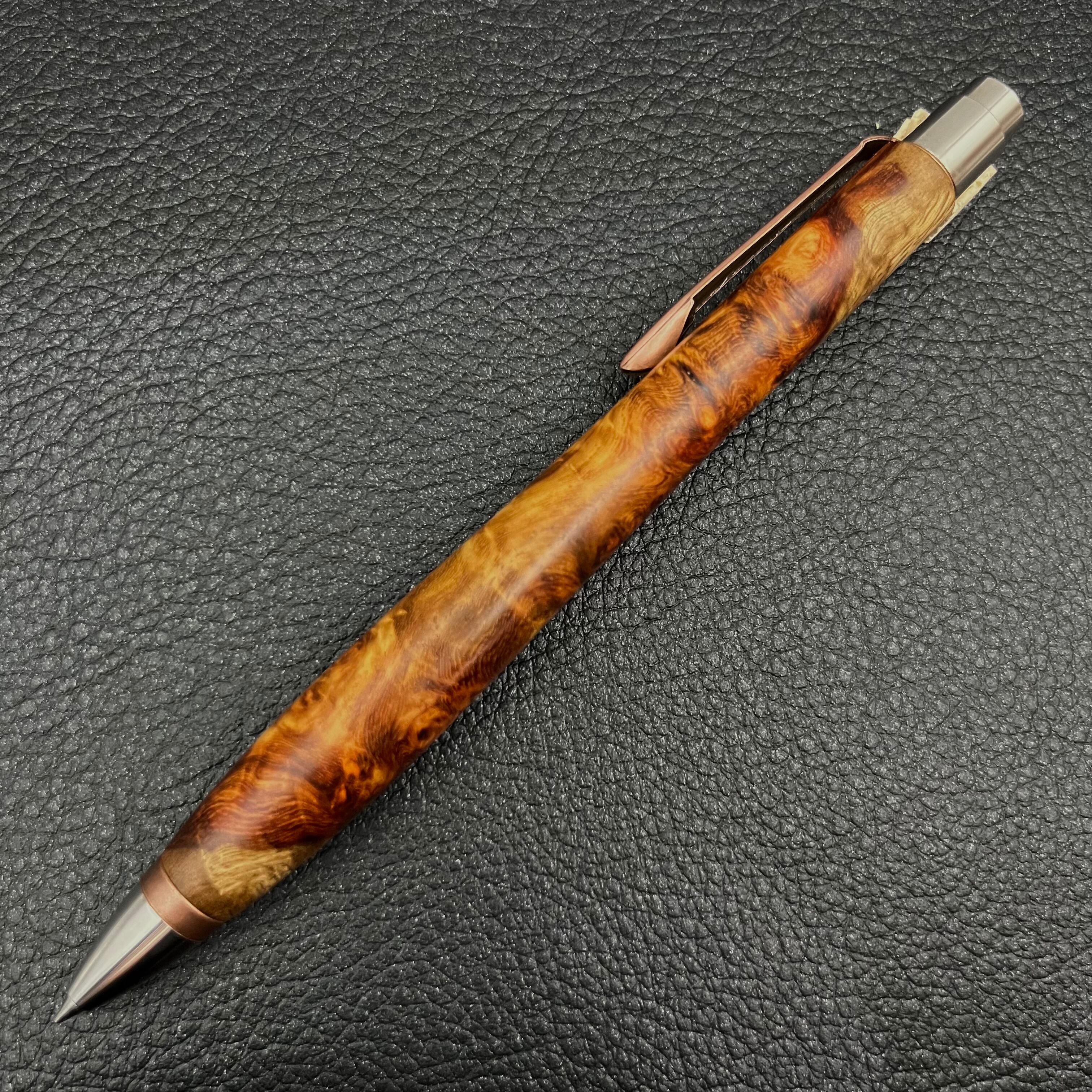 ボールペンのノックシステムは、ドイツ最高のクリックメカニズムを採用してあります。このメカニズムはユニークな機構のため、クリックしたときのカチカチ音が静かで、どんな場所でも気兼ねなく使うことができます。滑らかに動くこのプッシュ感覚を一度味わうと他には戻れなくなってしまうほどの魅力があります。 100分の1単位の加工精度で削り出されたペン先は、軸ブレも全くありません。