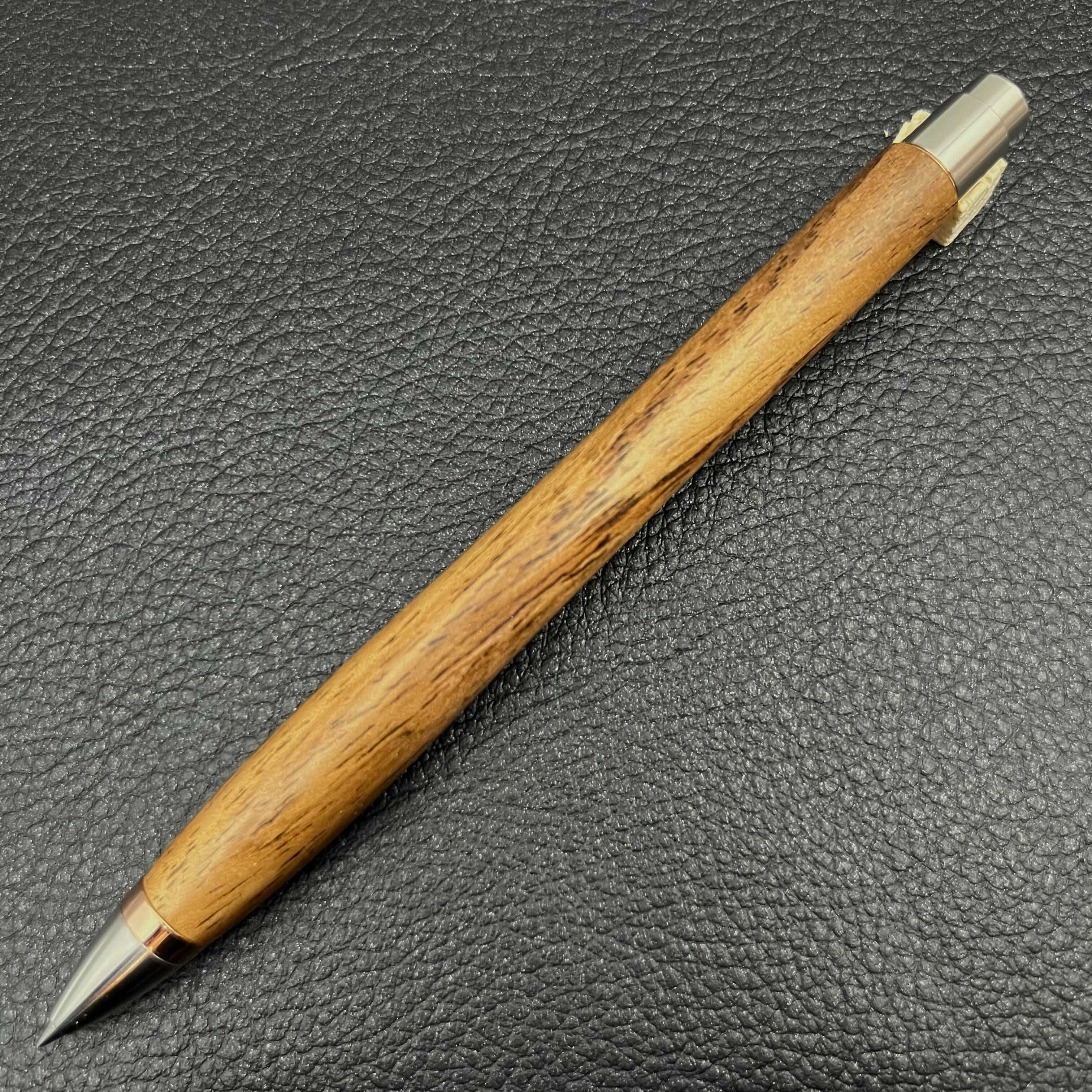 ボールペンのノックシステムは、ドイツ最高のクリックメカニズムを採用してあります。このメカニズムはユニークな機構のため、クリックしたときのカチカチ音が静かで、どんな場所でも気兼ねなく使うことができます。滑らかに動くこのプッシュ感覚を一度味わうと他には戻れなくなってしまうほどの魅力があります。 100分の1単位の加工精度で削り出されたペン先は、軸ブレも全くありません。