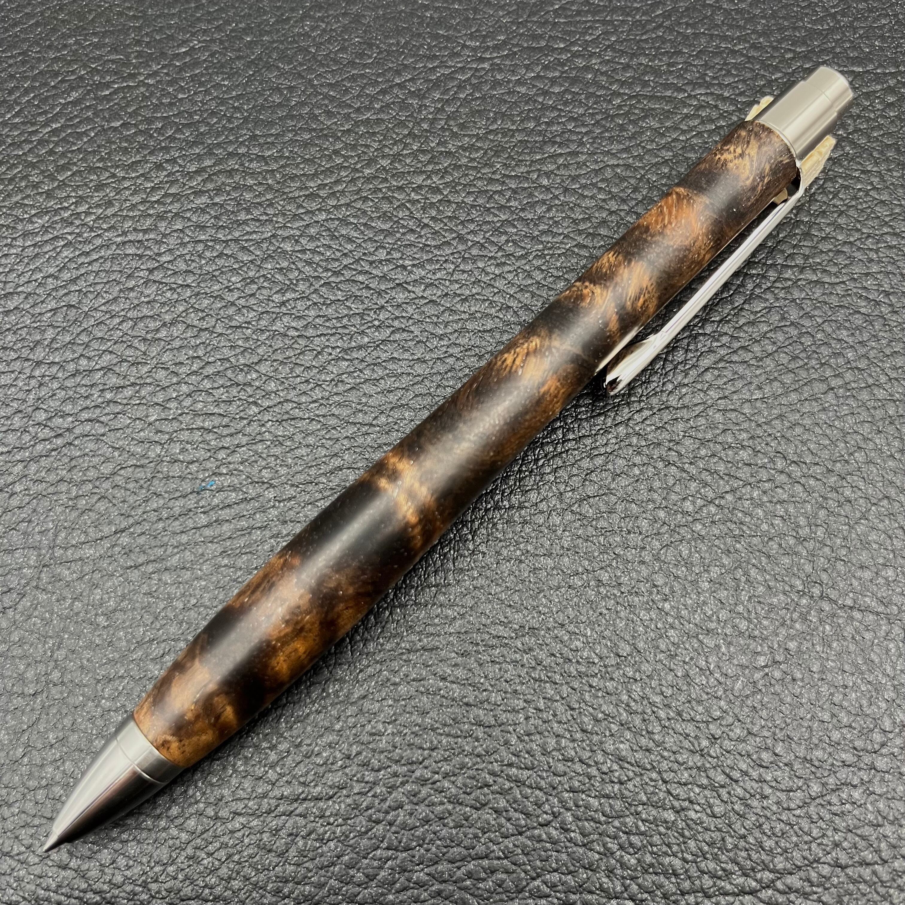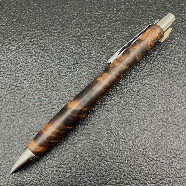 ボールペンのノックシステムは、ドイツ最高のクリックメカニズムを採用してあります。このメカニズムはユニークな機構のため、クリックしたときのカチカチ音が静かで、どんな場所でも気兼ねなく使うことができます。滑らかに動くこのプッシュ感覚を一度味わうと他には戻れなくなってしまうほどの魅力があります。 100分の1単位の加工精度で削り出されたペン先は、軸ブレも全くありません。