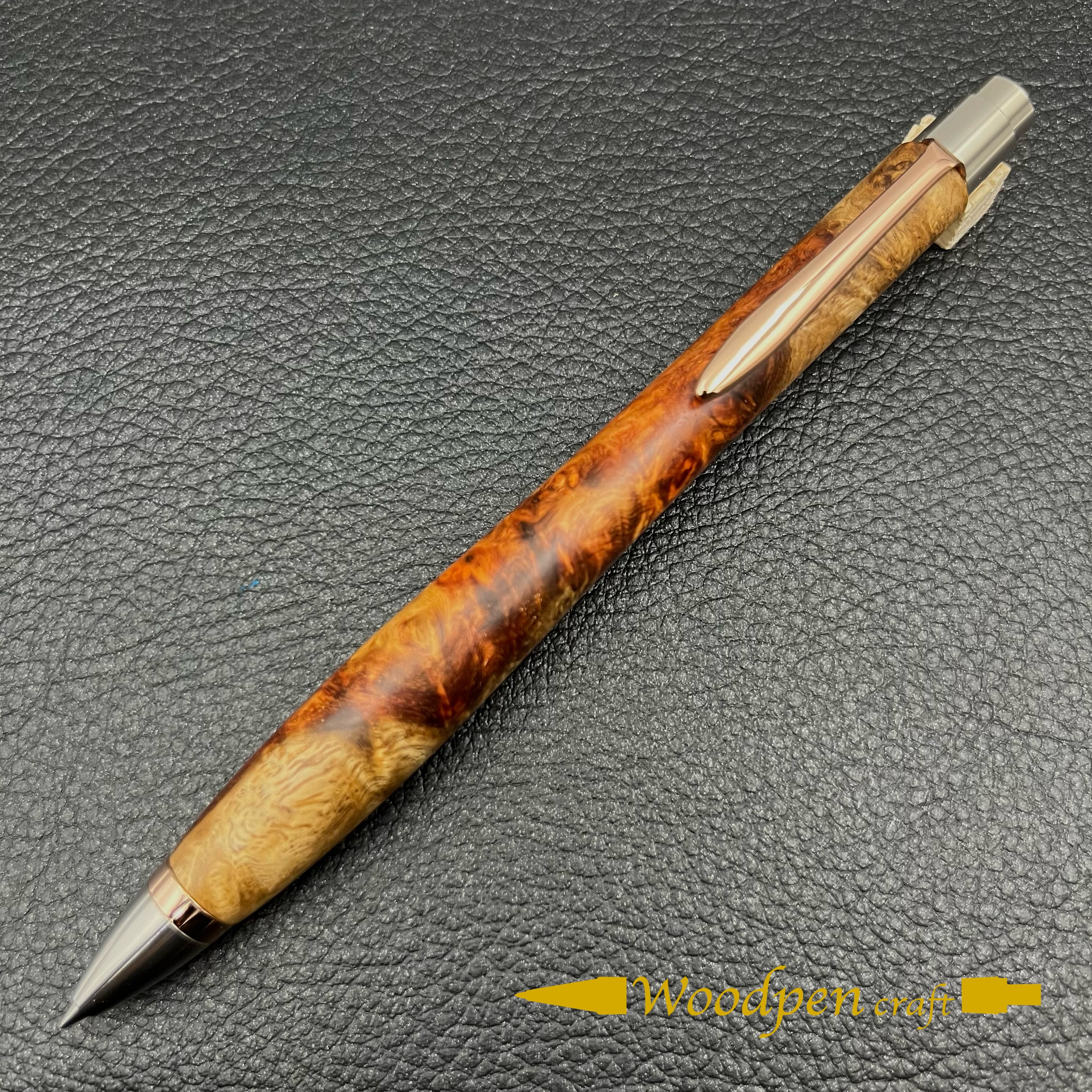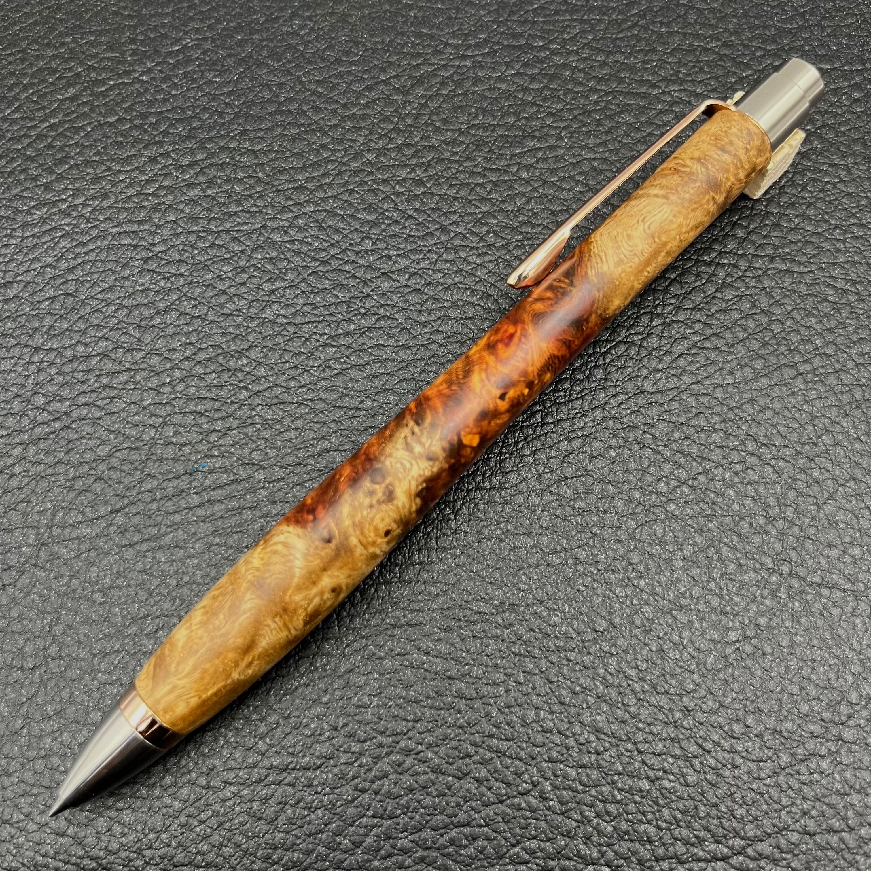 ボールペンのノックシステムは、ドイツ最高のクリックメカニズムを採用してあります。このメカニズムはユニークな機構のため、クリックしたときのカチカチ音が静かで、どんな場所でも気兼ねなく使うことができます。滑らかに動くこのプッシュ感覚を一度味わうと他には戻れなくなってしまうほどの魅力があります。 100分の1単位の加工精度で削り出されたペン先は、軸ブレも全くありません。