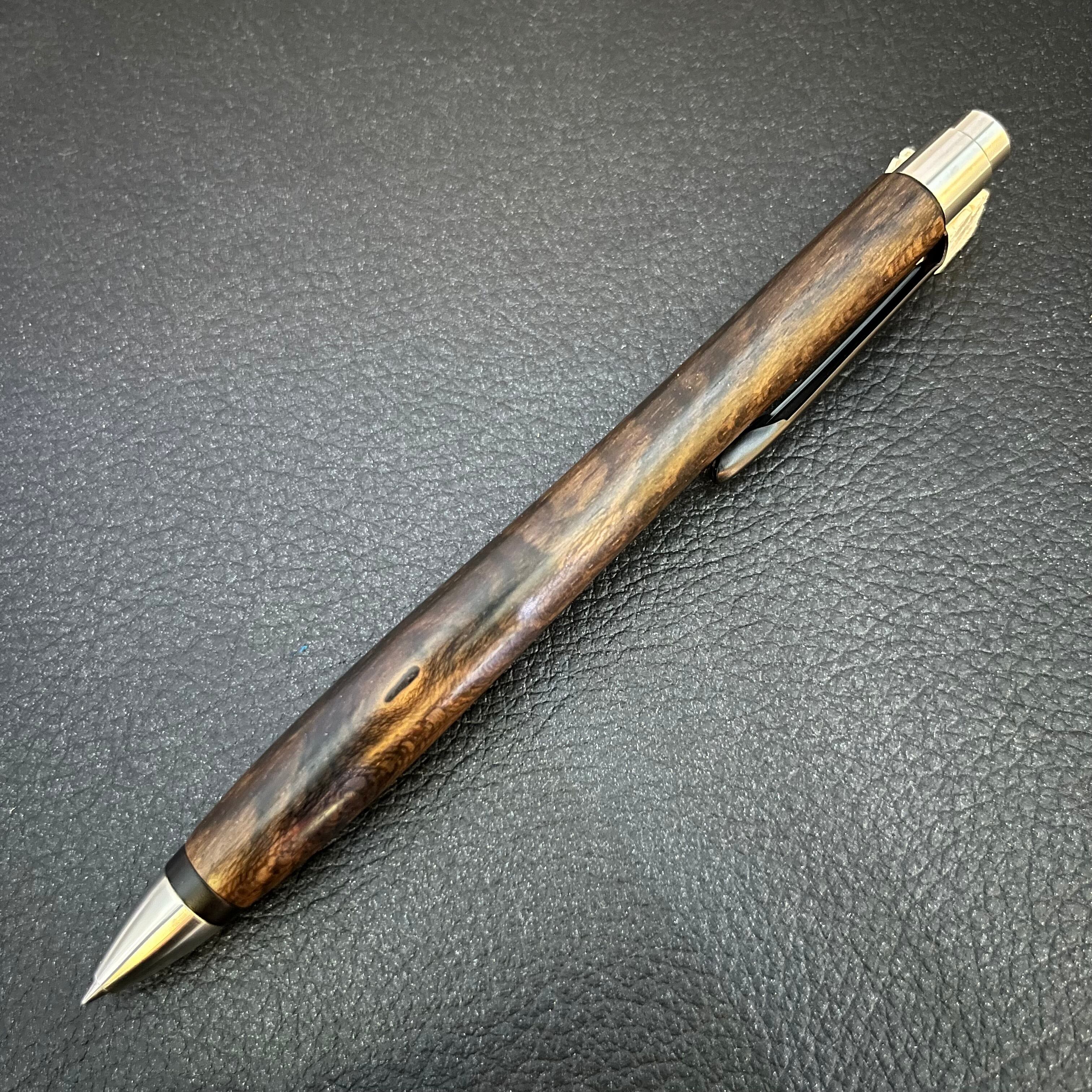 ボールペンのノックシステムは、ドイツ最高のクリックメカニズムを採用してあります。このメカニズムはユニークな機構のため、クリックしたときのカチカチ音が静かで、どんな場所でも気兼ねなく使うことができます。滑らかに動くこのプッシュ感覚を一度味わうと他には戻れなくなってしまうほどの魅力があります。 100分の1単位の加工精度で削り出されたペン先は、軸ブレも全くありません。