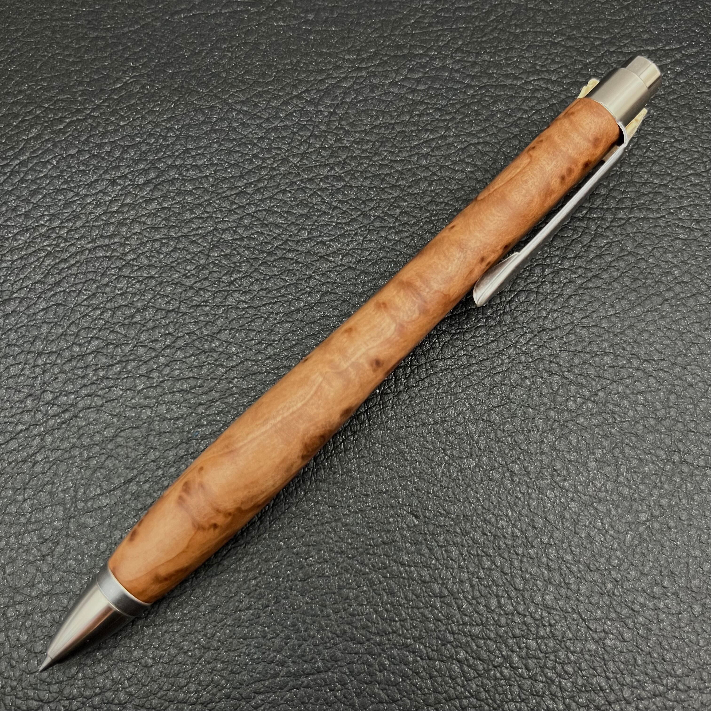 ボールペンのノックシステムは、ドイツ最高のクリックメカニズムを採用してあります。このメカニズムはユニークな機構のため、クリックしたときのカチカチ音が静かで、どんな場所でも気兼ねなく使うことができます。滑らかに動くこのプッシュ感覚を一度味わうと他には戻れなくなってしまうほどの魅力があります。 100分の1単位の加工精度で削り出されたペン先は、軸ブレも全くありません。