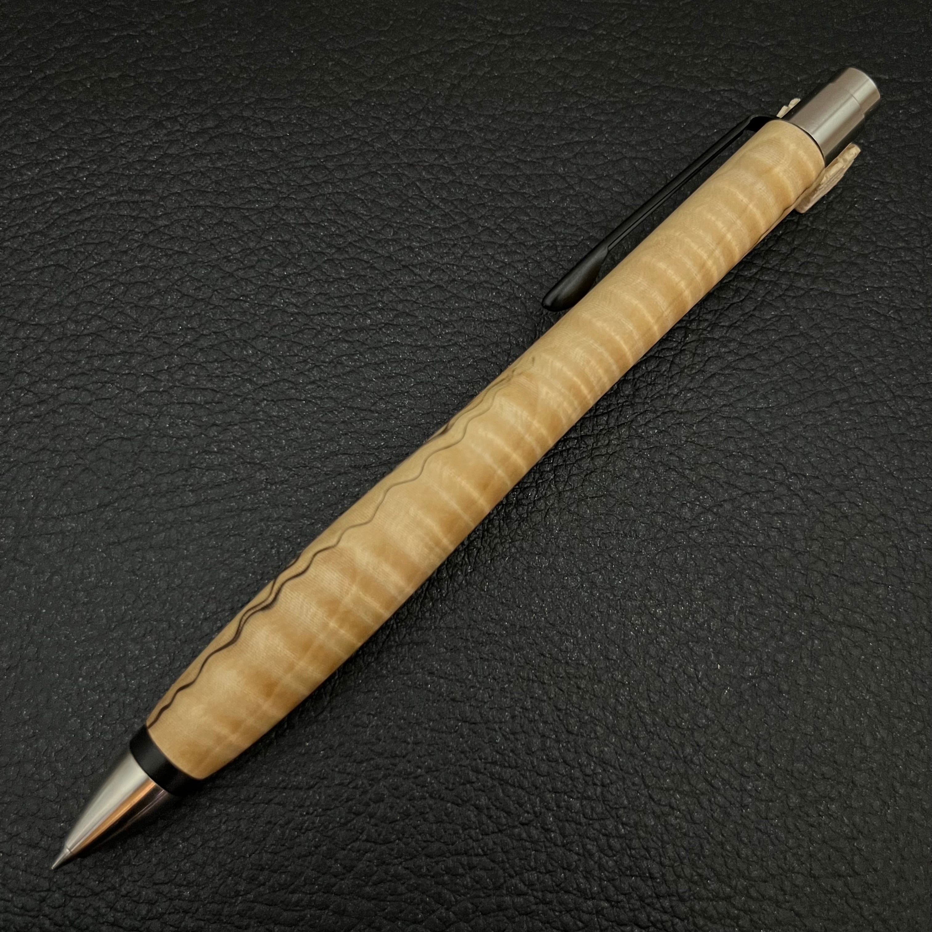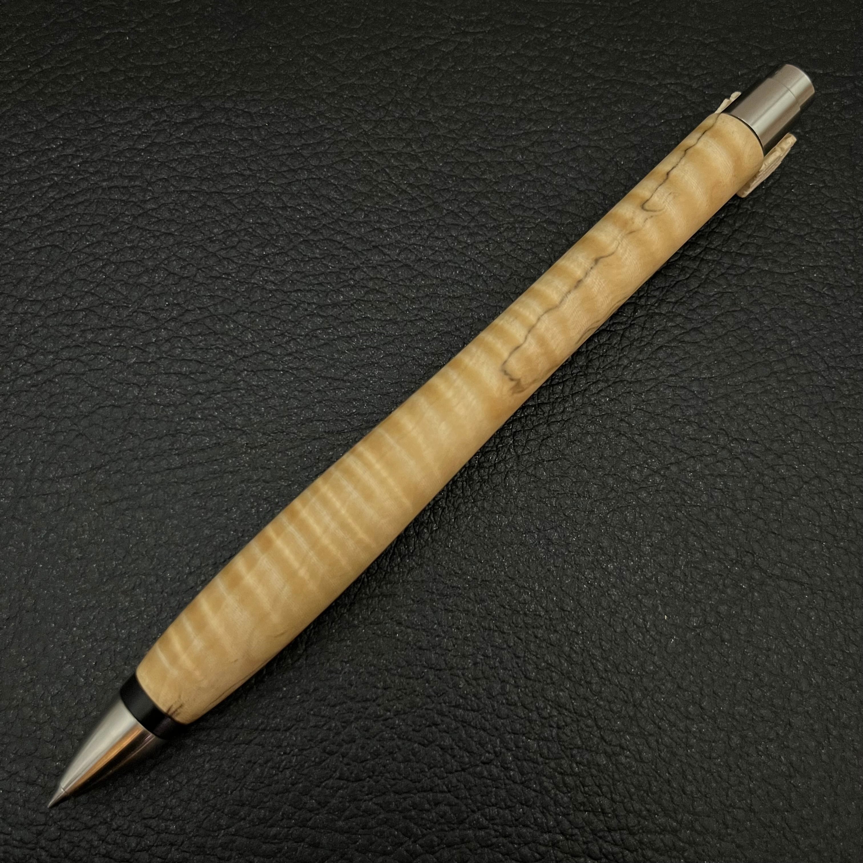 ボールペンのノックシステムは、ドイツ最高のクリックメカニズムを採用してあります。このメカニズムはユニークな機構のため、クリックしたときのカチカチ音が静かで、どんな場所でも気兼ねなく使うことができます。滑らかに動くこのプッシュ感覚を一度味わうと他には戻れなくなってしまうほどの魅力があります。 100分の1単位の加工精度で削り出されたペン先は、軸ブレも全くありません。