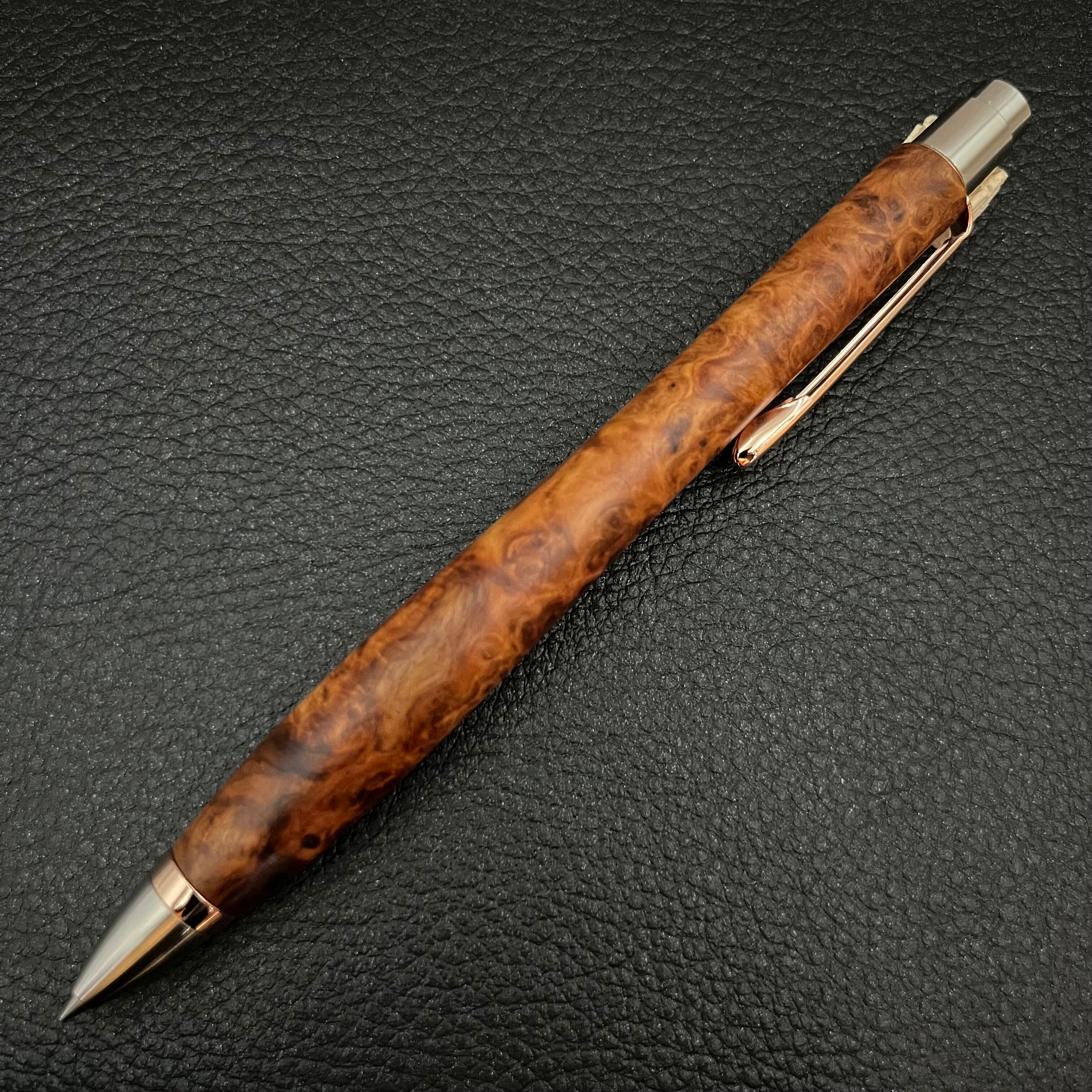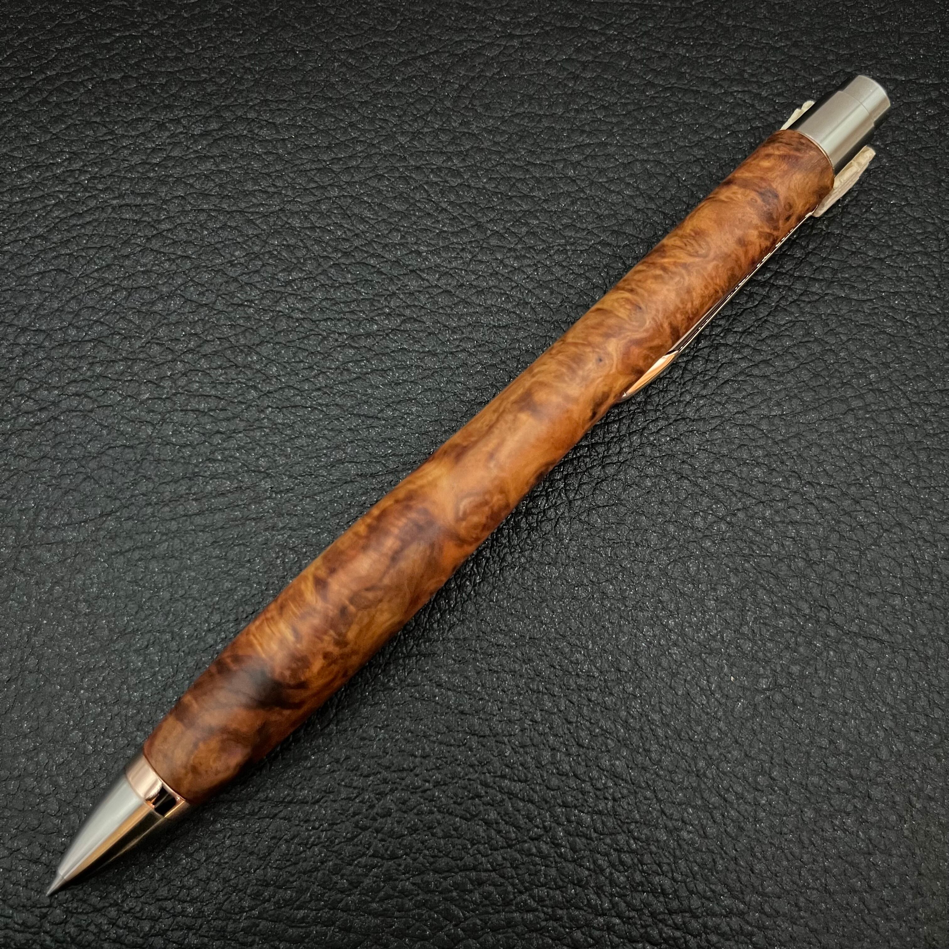 ボールペンのノックシステムは、ドイツ最高のクリックメカニズムを採用してあります。このメカニズムはユニークな機構のため、クリックしたときのカチカチ音が静かで、どんな場所でも気兼ねなく使うことができます。滑らかに動くこのプッシュ感覚を一度味わうと他には戻れなくなってしまうほどの魅力があります。 100分の1単位の加工精度で削り出されたペン先は、軸ブレも全くありません。
