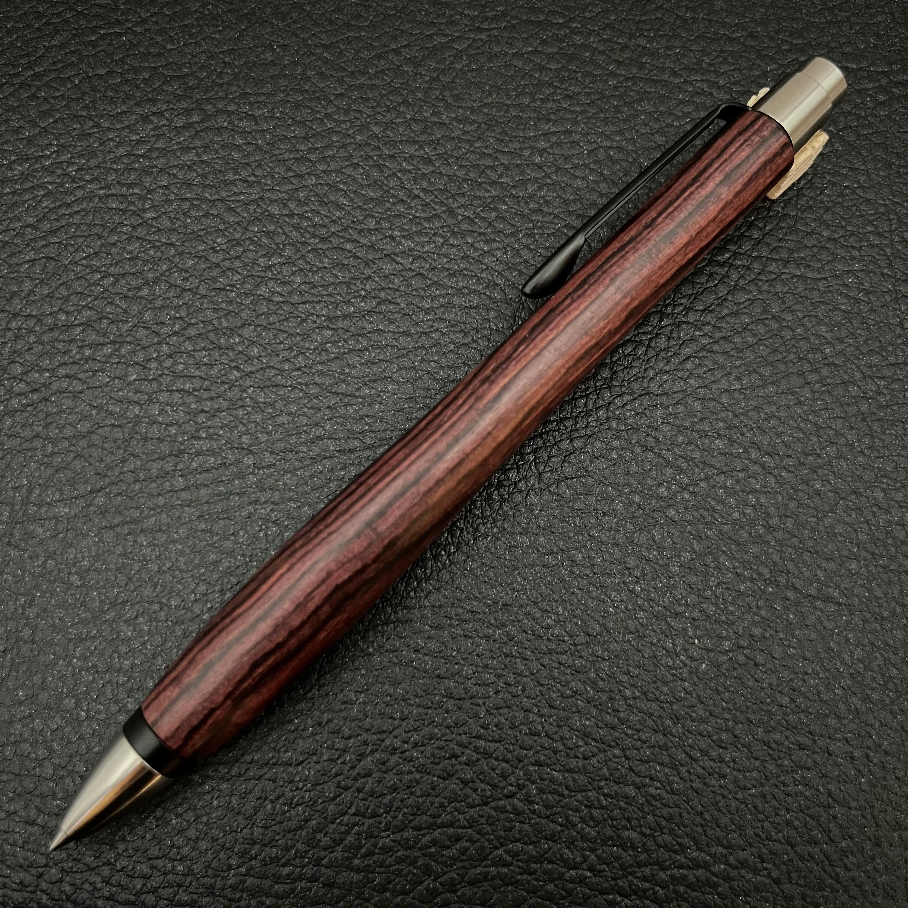 ボールペンのノックシステムは、ドイツ最高のクリックメカニズムを採用してあります。このメカニズムはユニークな機構のため、クリックしたときのカチカチ音が静かで、どんな場所でも気兼ねなく使うことができます。滑らかに動くこのプッシュ感覚を一度味わうと他には戻れなくなってしまうほどの魅力があります。 100分の1単位の加工精度で削り出されたペン先は、軸ブレも全くありません。