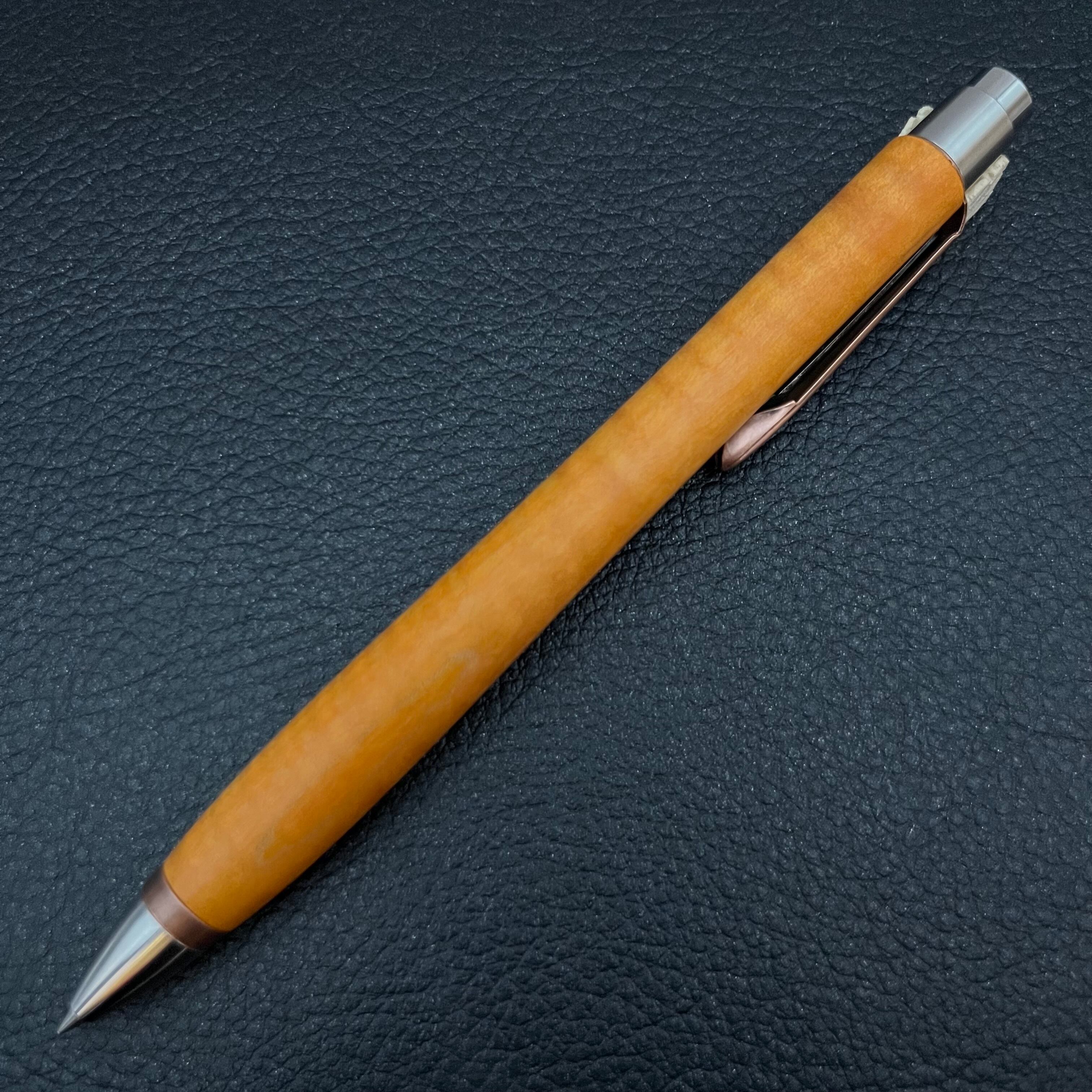 ボールペンのノックシステムは、ドイツ最高のクリックメカニズムを採用してあります。このメカニズムはユニークな機構のため、クリックしたときのカチカチ音が静かで、どんな場所でも気兼ねなく使うことができます。滑らかに動くこのプッシュ感覚を一度味わうと他には戻れなくなってしまうほどの魅力があります。 100分の1単位の加工精度で削り出されたペン先は、軸ブレも全くありません。