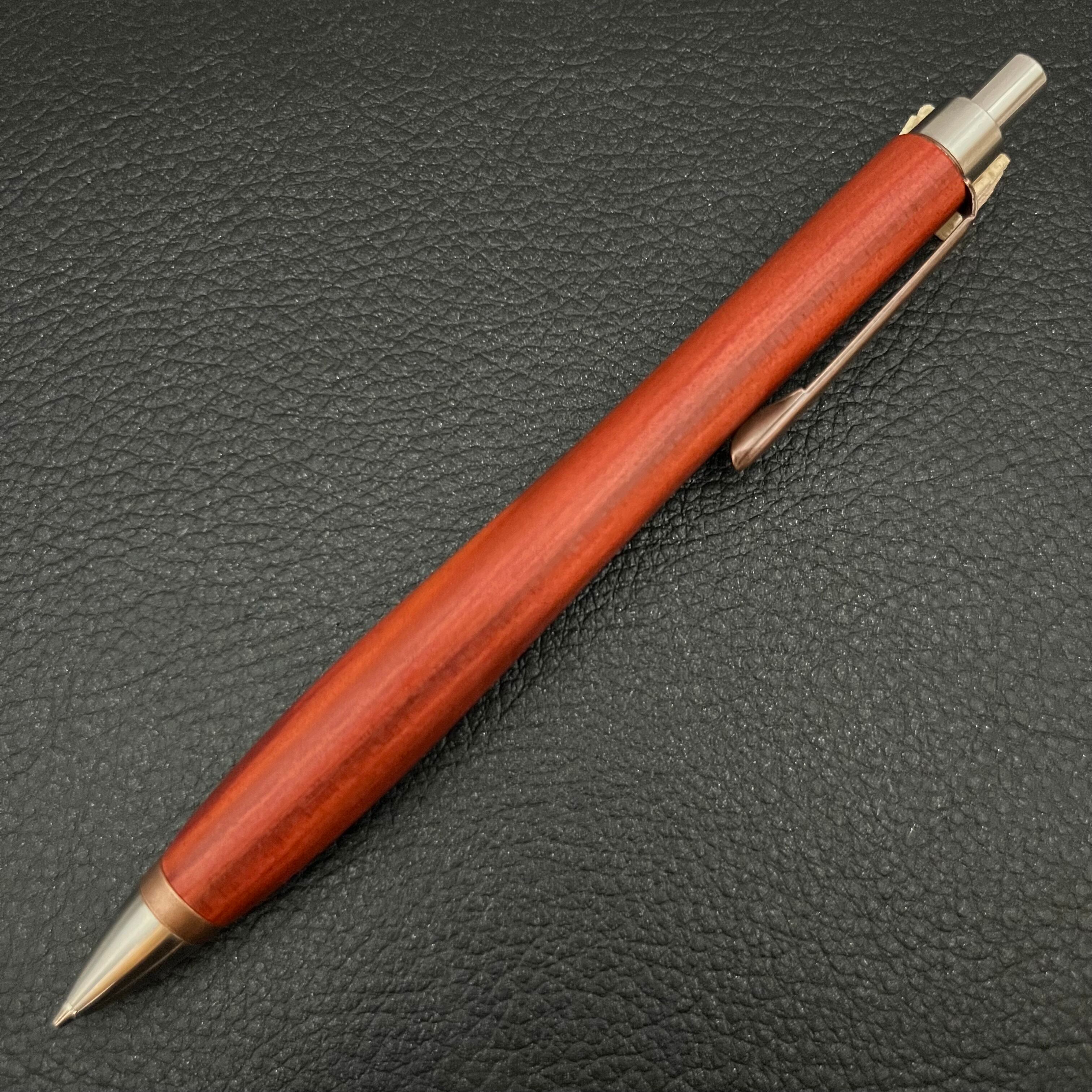 オリジナルペン金具は、大阪に在る金属精密加工会社の職人さんが100分の1㎜単位の加工精度で制作されています。口金・上スリーブ・ノックカバーは高級ステンレス削り出しです。