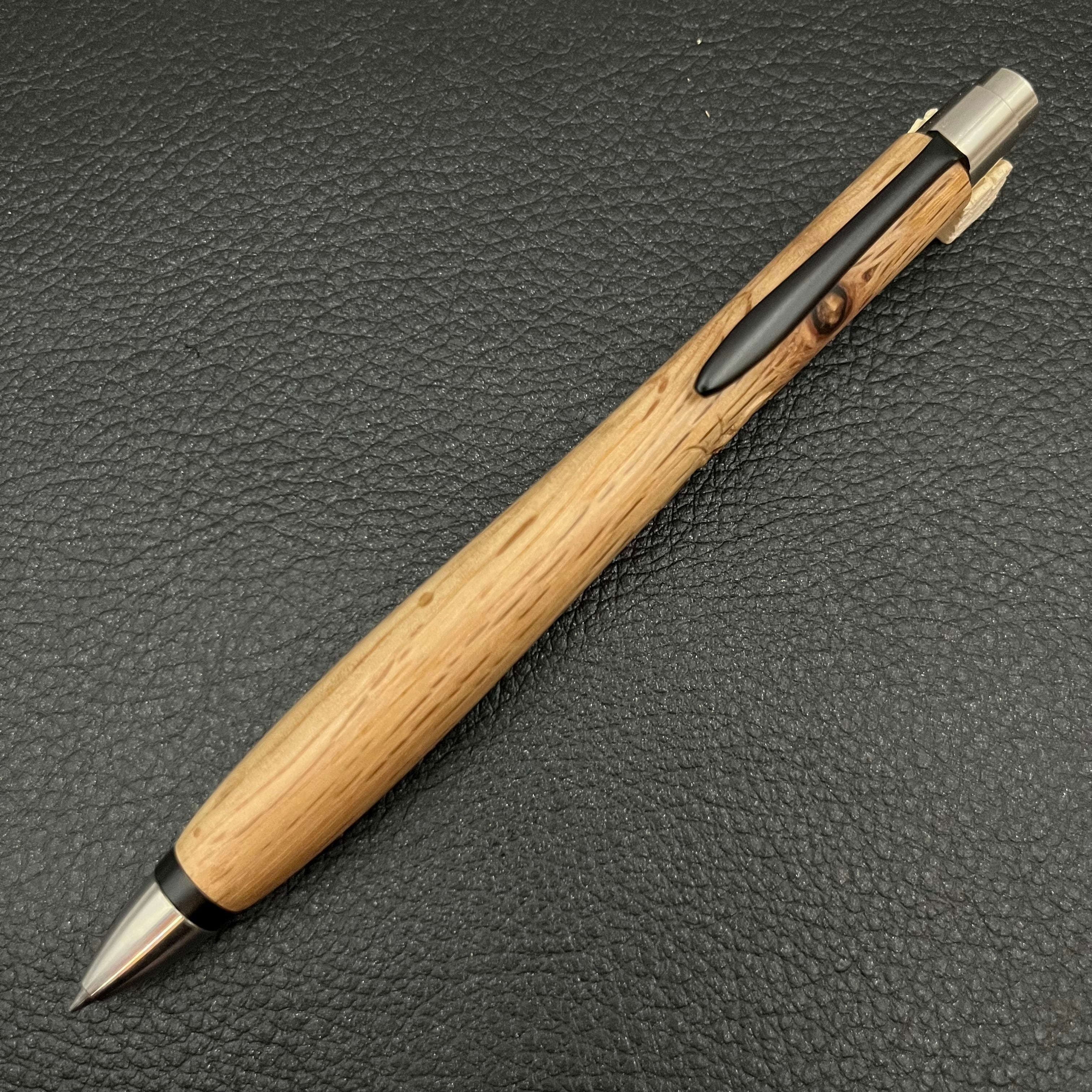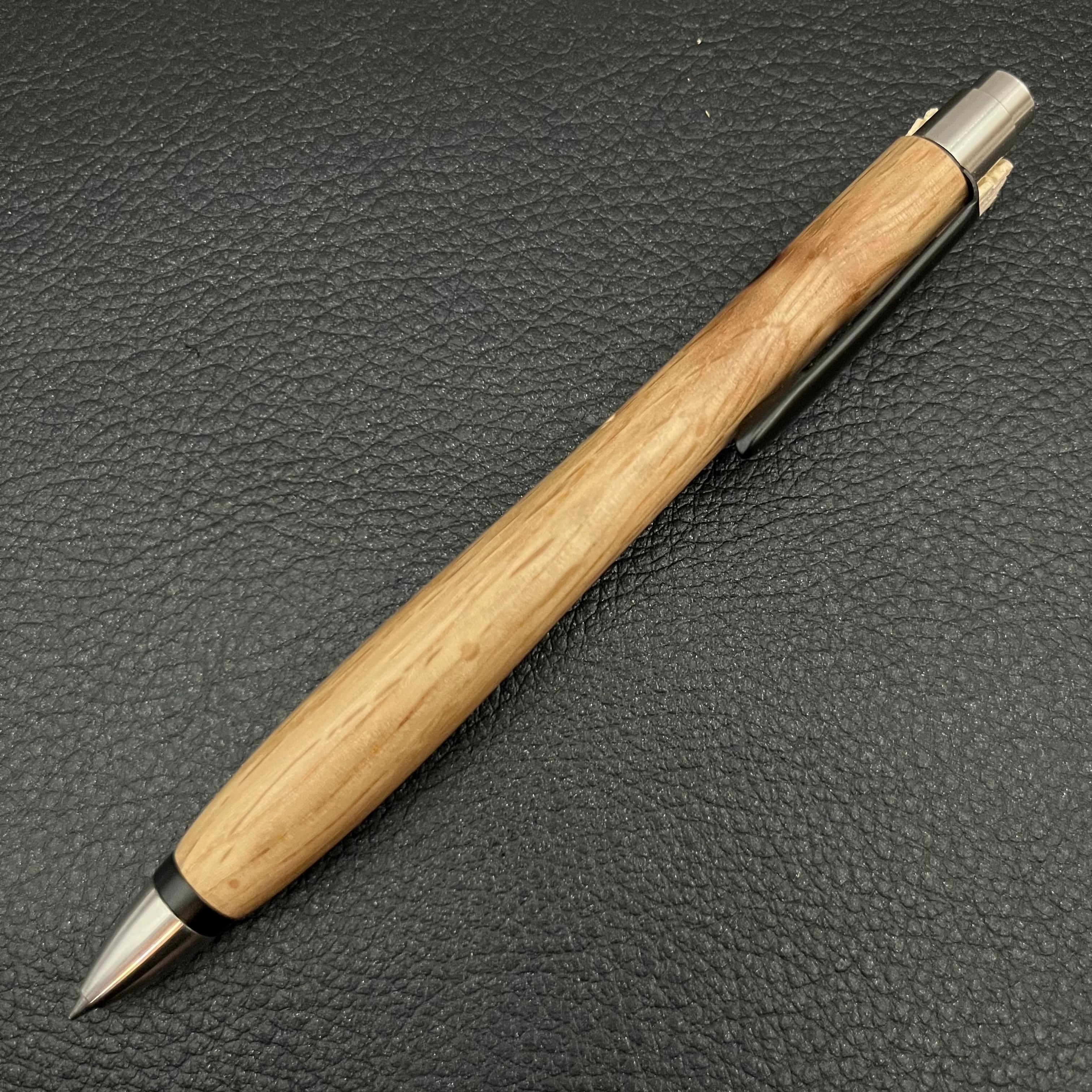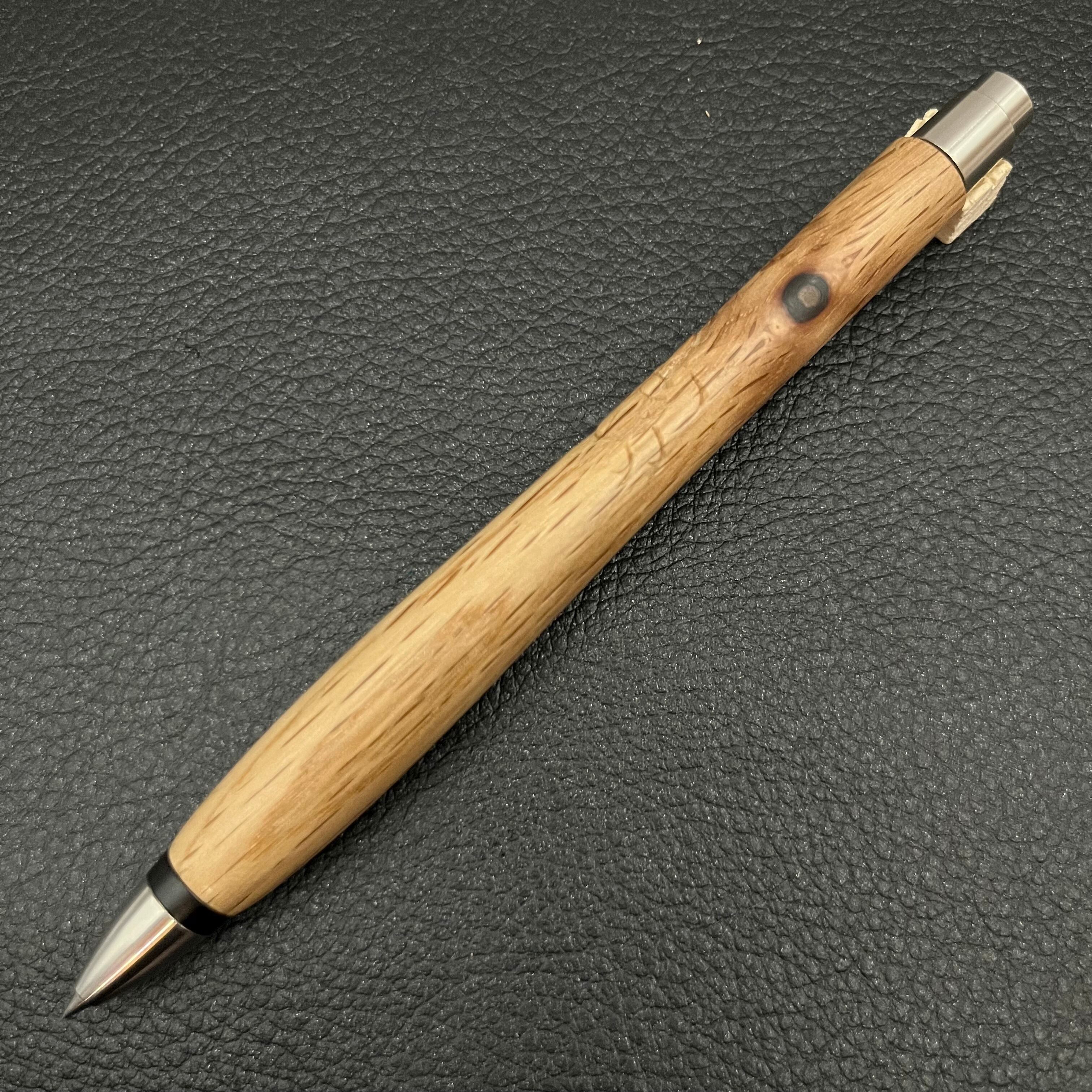 ボールペンのノックシステムは、ドイツ最高のクリックメカニズムを採用してあります。このメカニズムはユニークな機構のため、クリックしたときのカチカチ音が静かで、どんな場所でも気兼ねなく使うことができます。滑らかに動くこのプッシュ感覚を一度味わうと他には戻れなくなってしまうほどの魅力があります。 100分の1単位の加工精度で削り出されたペン先は、軸ブレも全くありません。