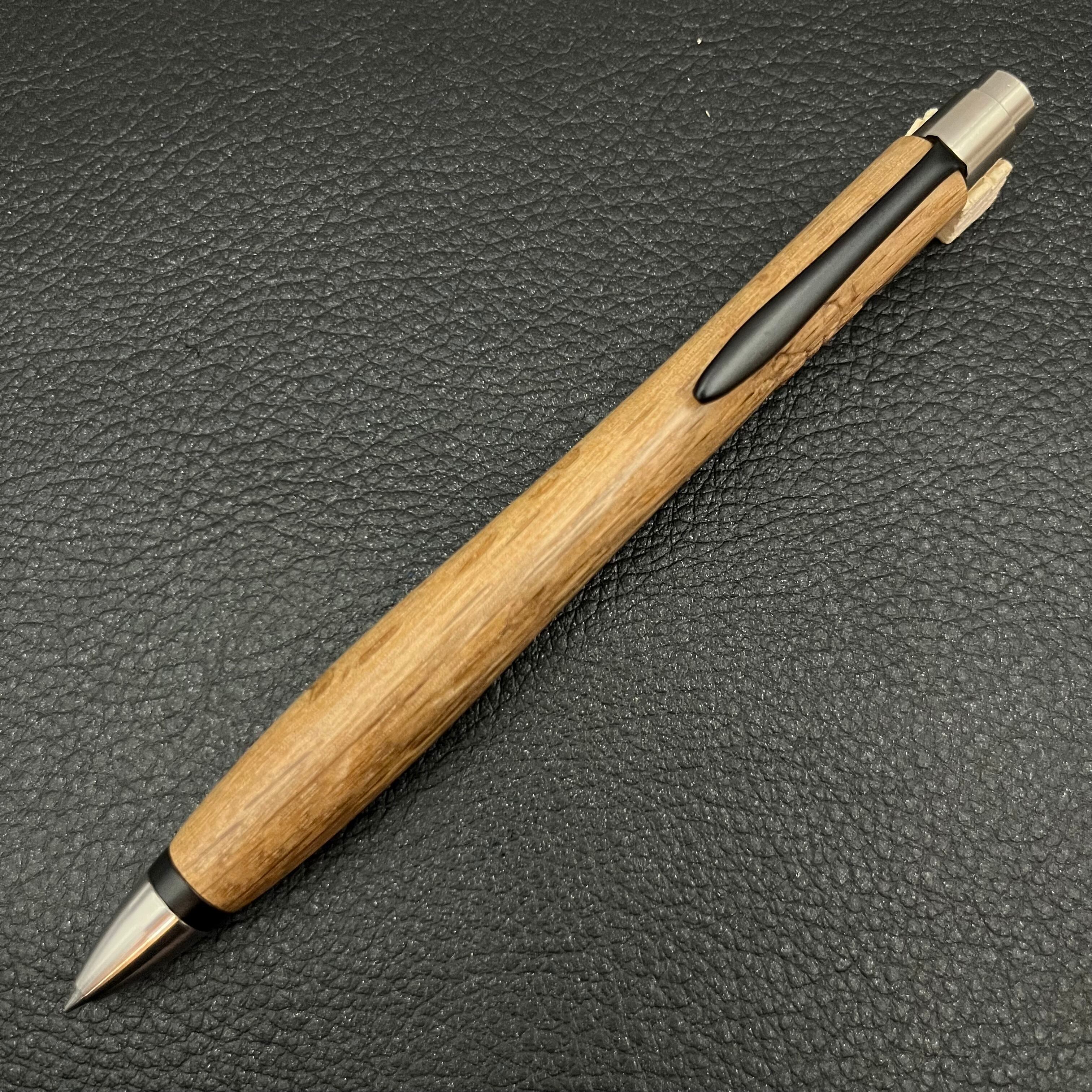 ボールペンのノックシステムは、ドイツ最高のクリックメカニズムを採用してあります。このメカニズムはユニークな機構のため、クリックしたときのカチカチ音が静かで、どんな場所でも気兼ねなく使うことができます。滑らかに動くこのプッシュ感覚を一度味わうと他には戻れなくなってしまうほどの魅力があります。 100分の1単位の加工精度で削り出されたペン先は、軸ブレも全くありません。